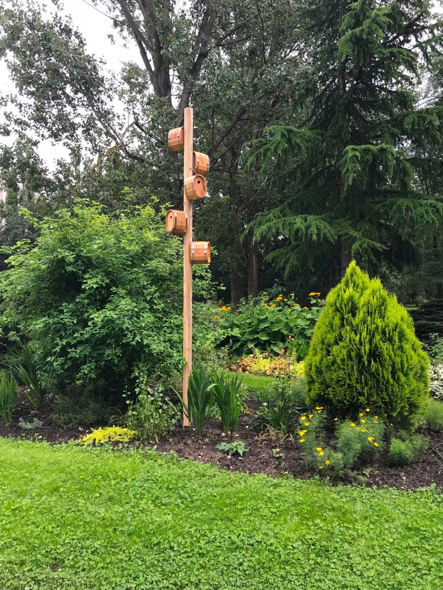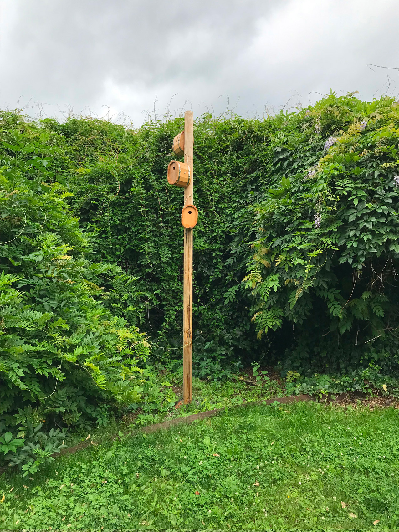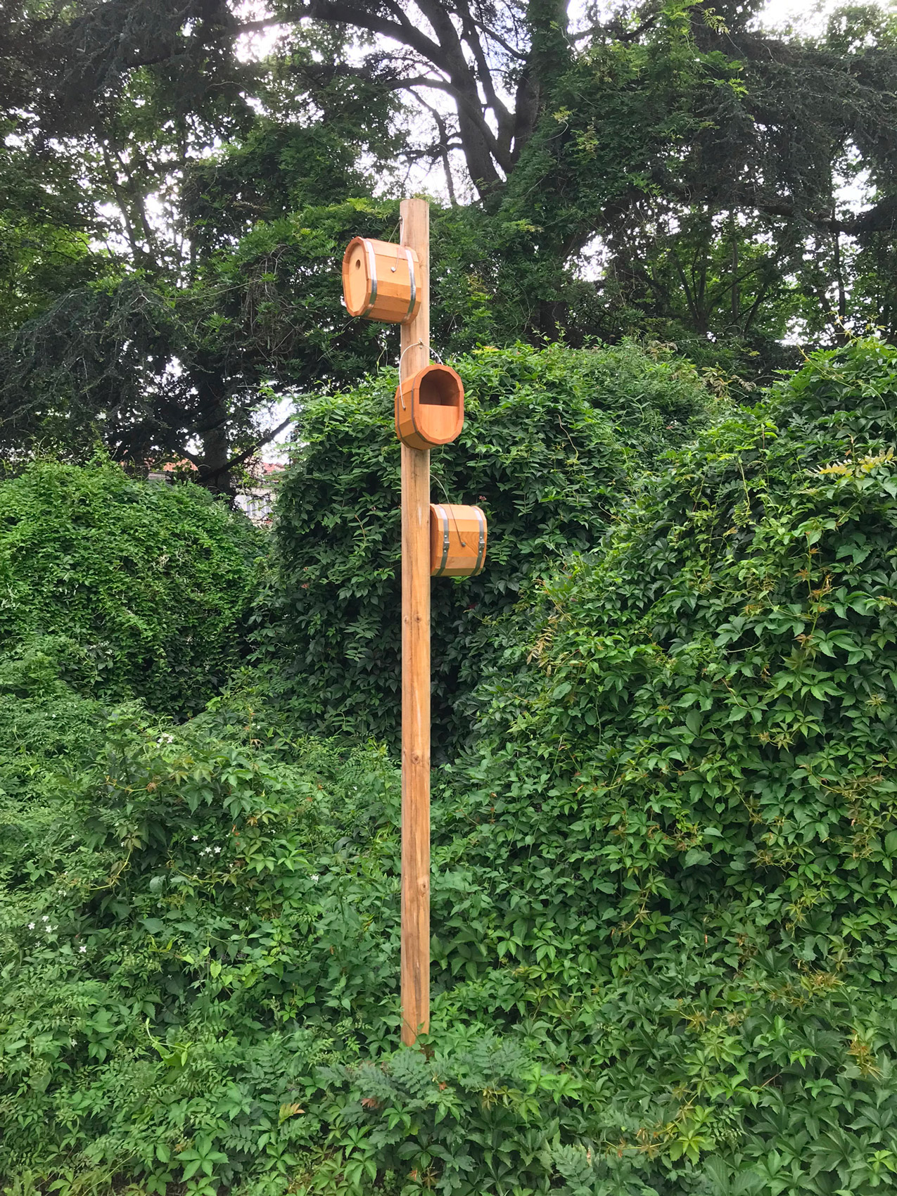 Réalisation de nichoirs à oiseaux destinés au Parc de Montaud. Nichoirs en bois avec une anse, conçus comme de petits tonnelets. Ils sont destinés à la Mésange charbonnière, au moineau friquet et au moineau domestique. Les nichoirs semi-ouverts accueillent quant à eux la bergeronnette grise, le troglodyte mignon, le rouge-gorge, le gobemouche gris et le rouge-queue noir.