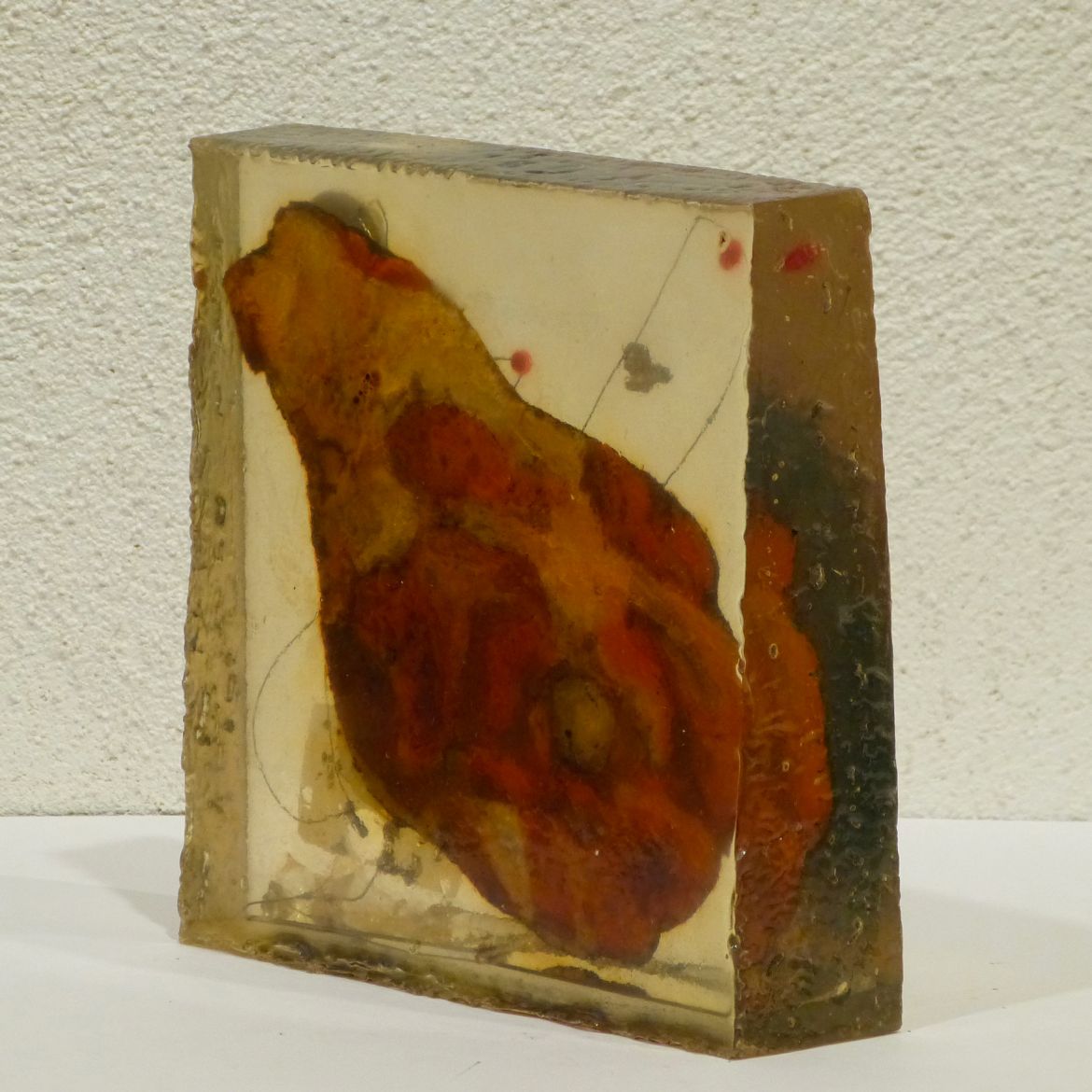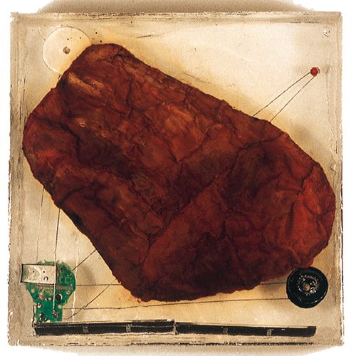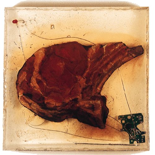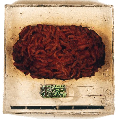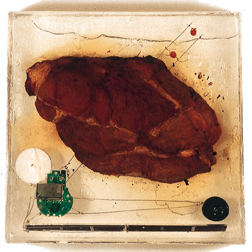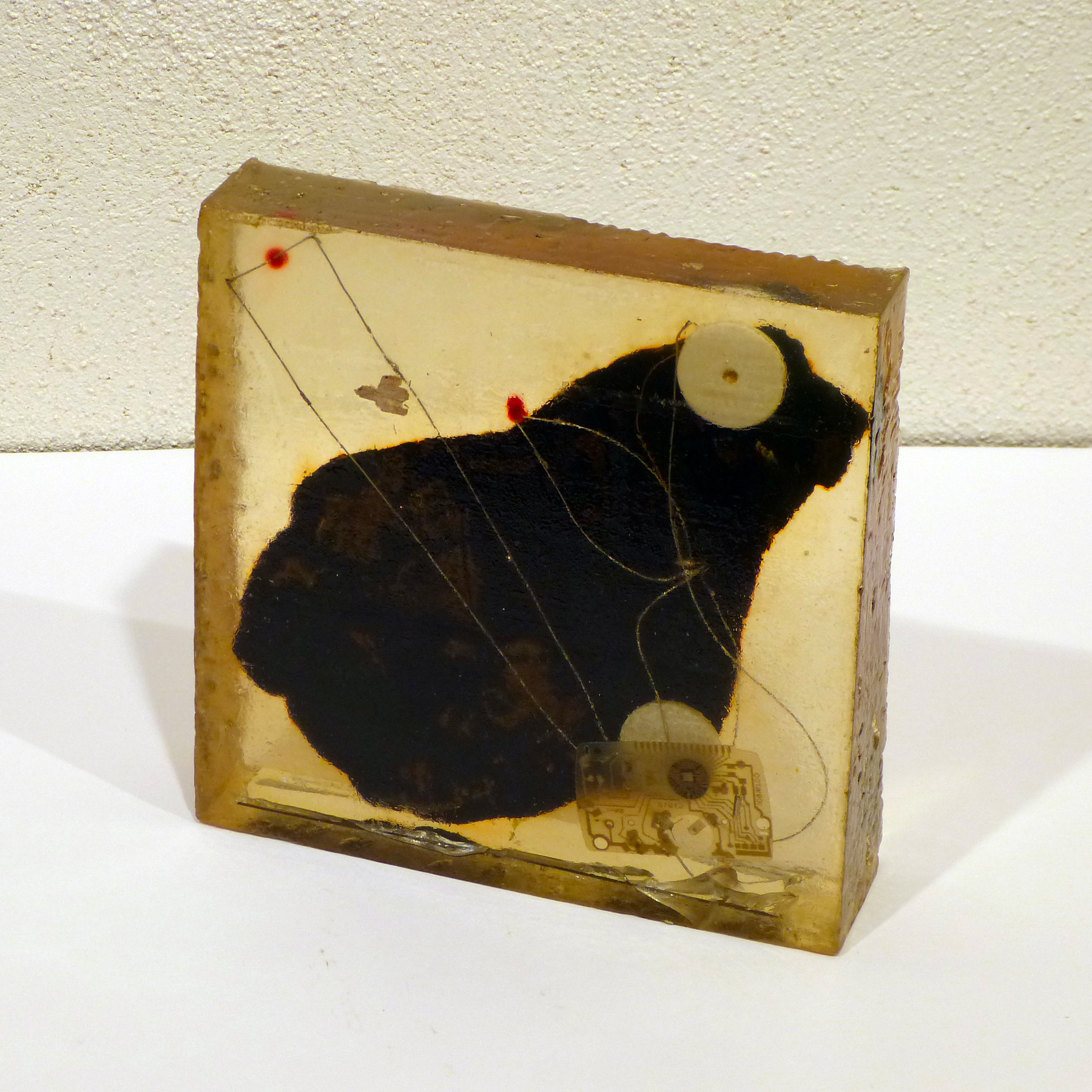 Peinture à l'huile sur bitume, capteurs solaires et composants électroniques sonores et lumineux dans résine