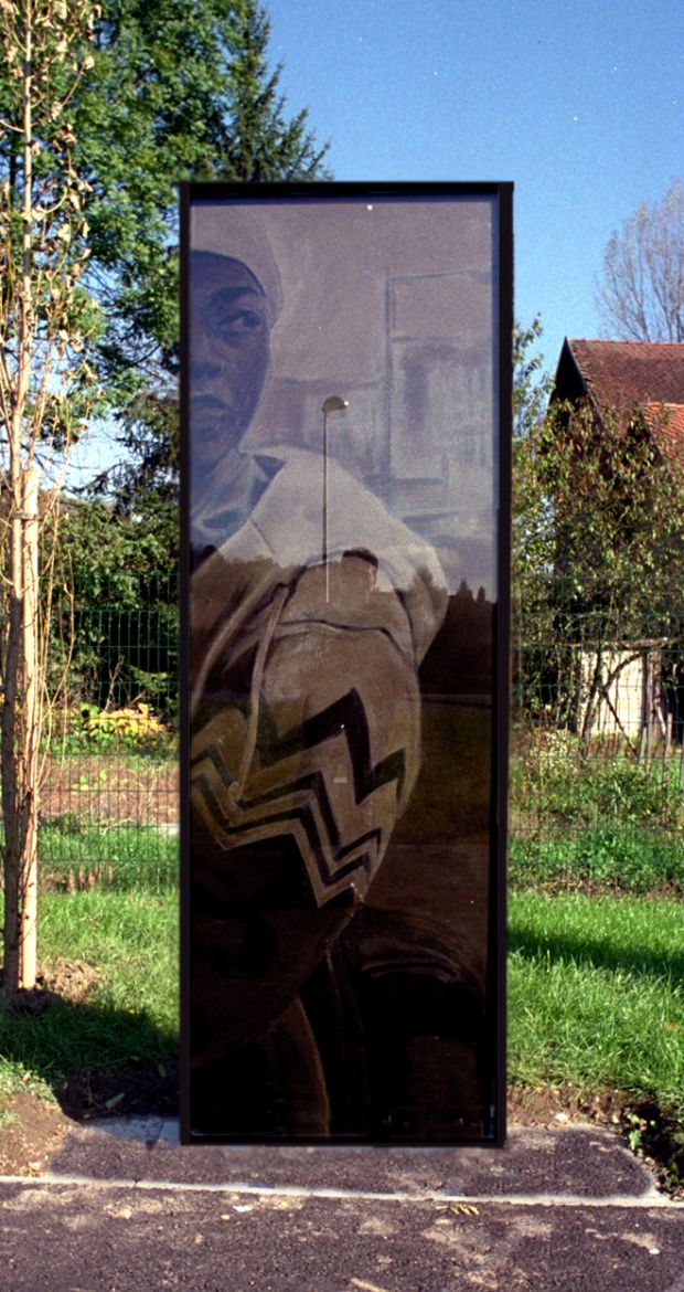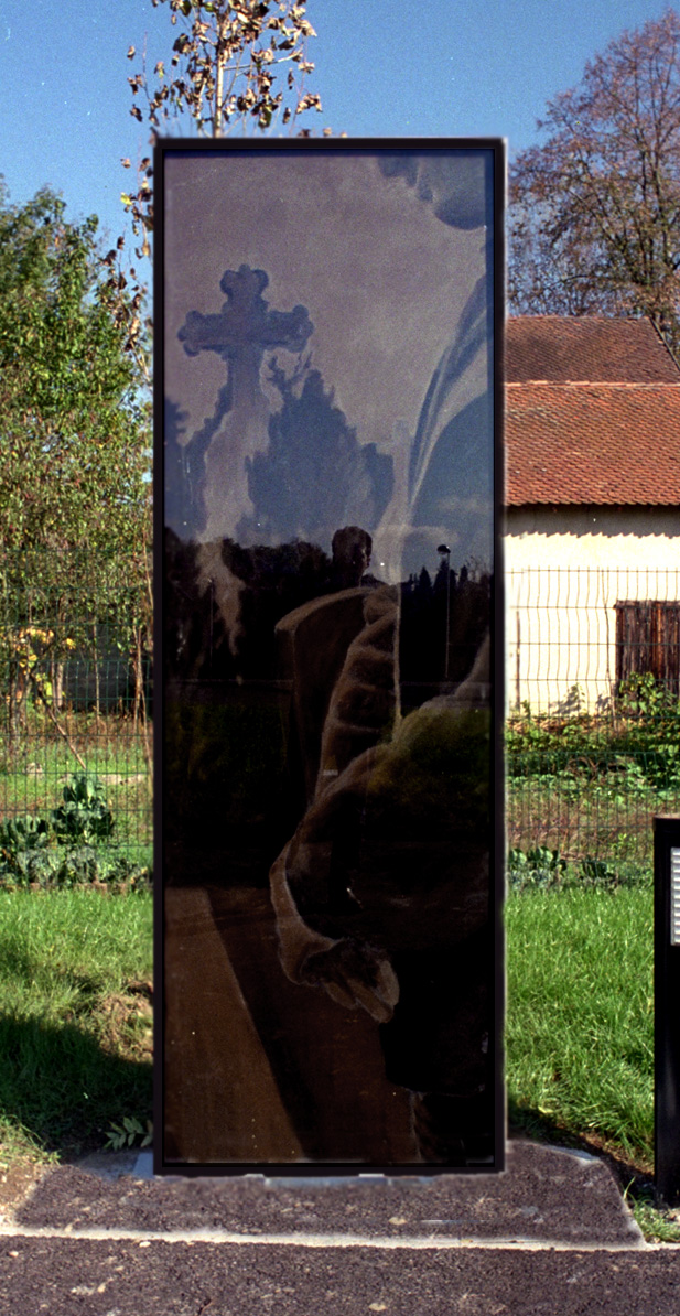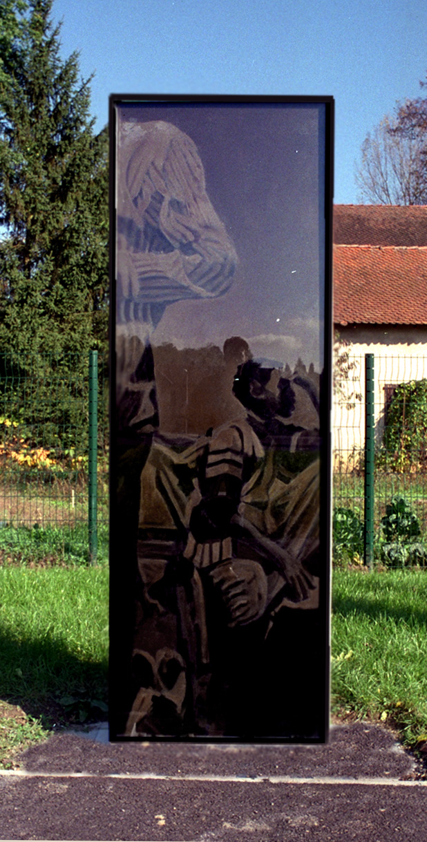 ① Installation de 12 reliquaires en verre peints (249 x 83 cm) avec du bitume et du pigment blanc (issues d'images d'actualité parues dans les journeaux locaux, et récoltées par les élèves du lycée sur un trimestre).