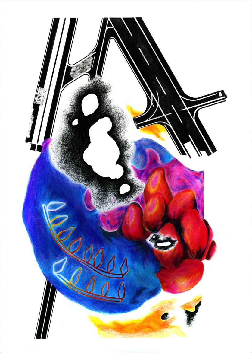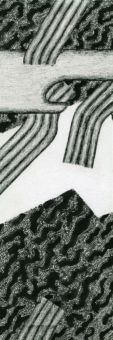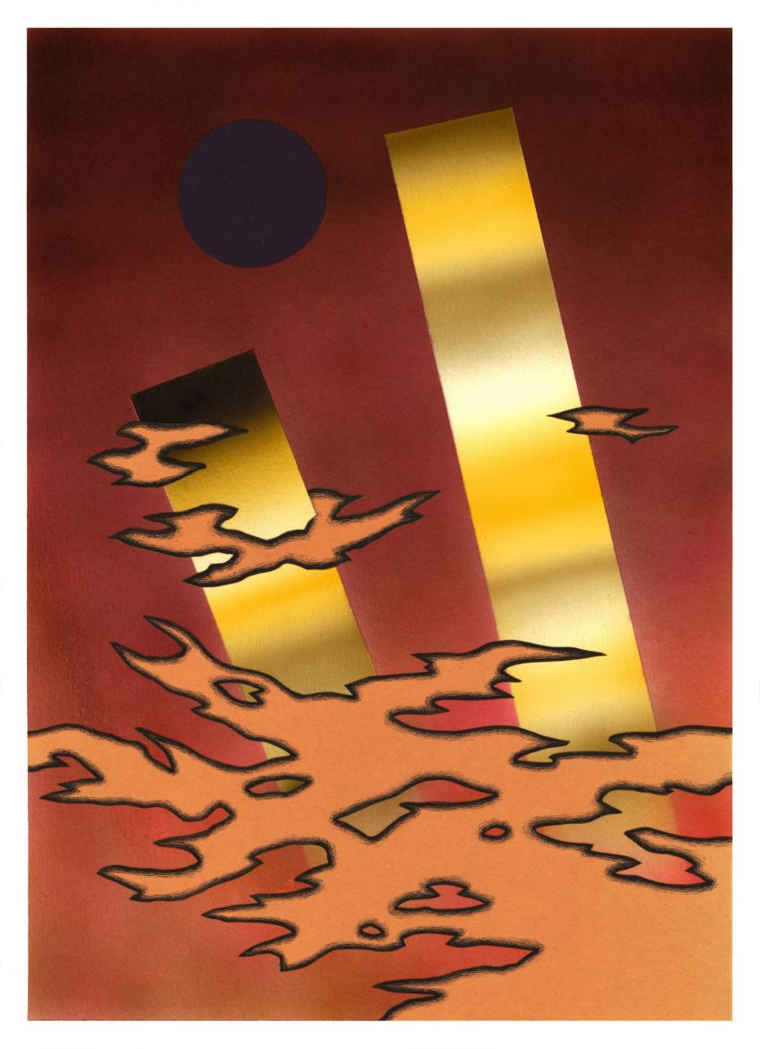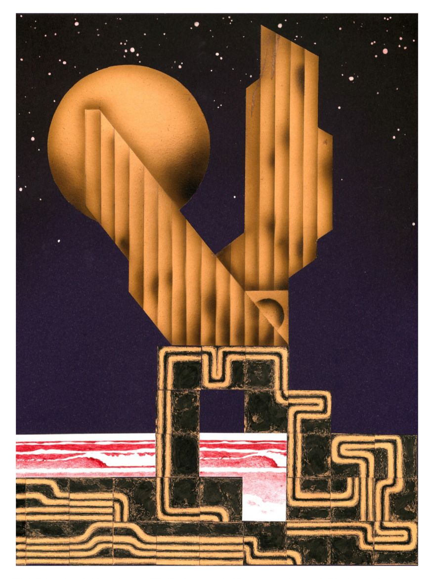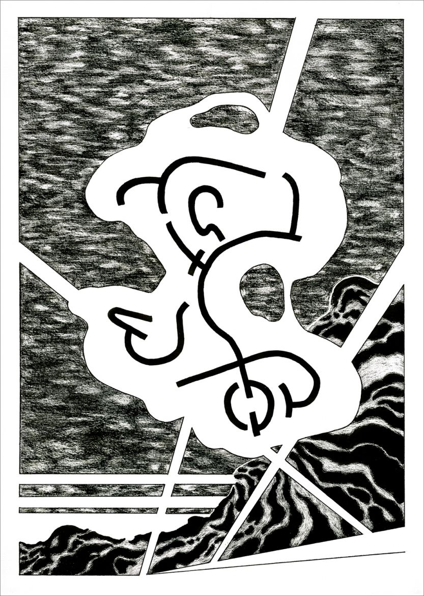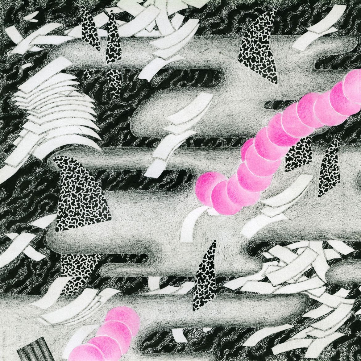 Aérographe, encre, stylo-bille, collage sur papier, 40 x 30 cm