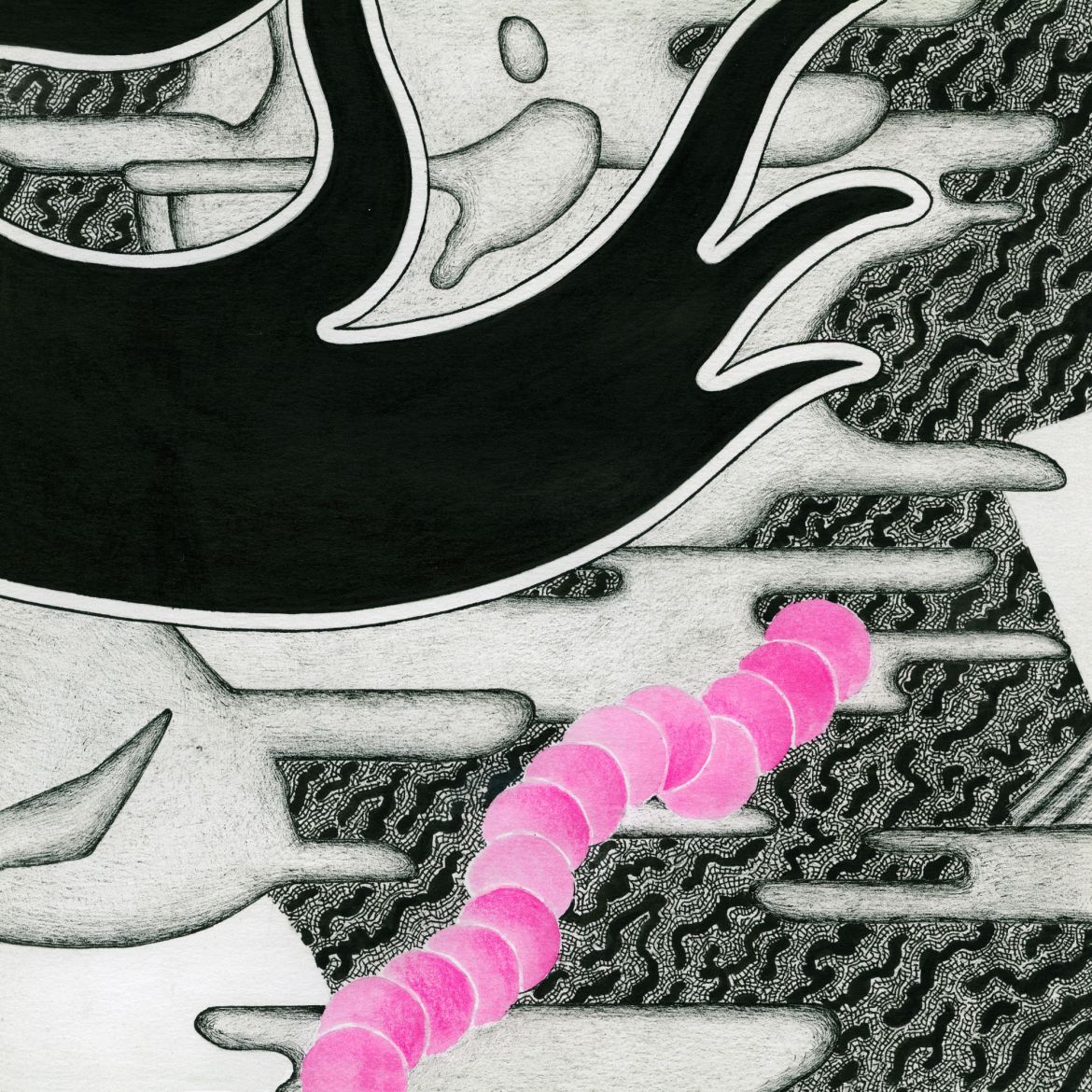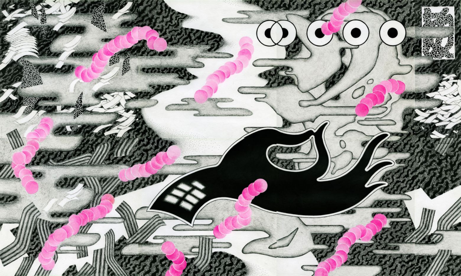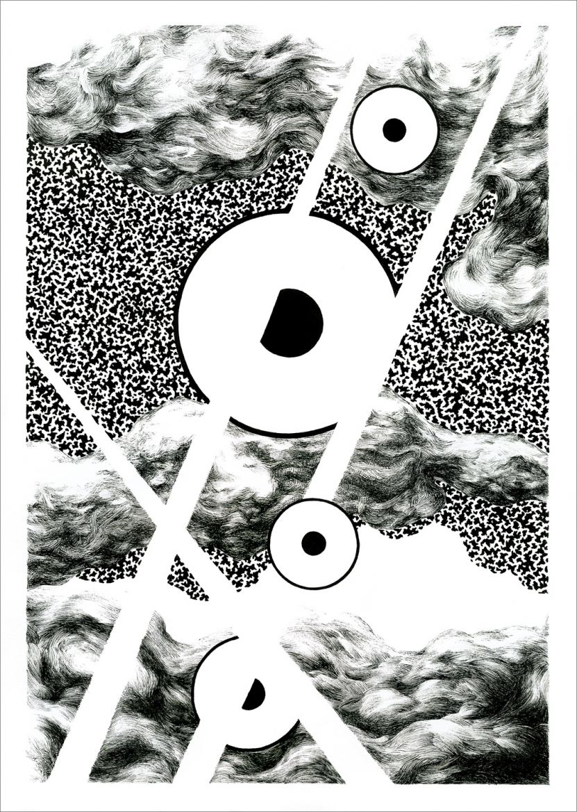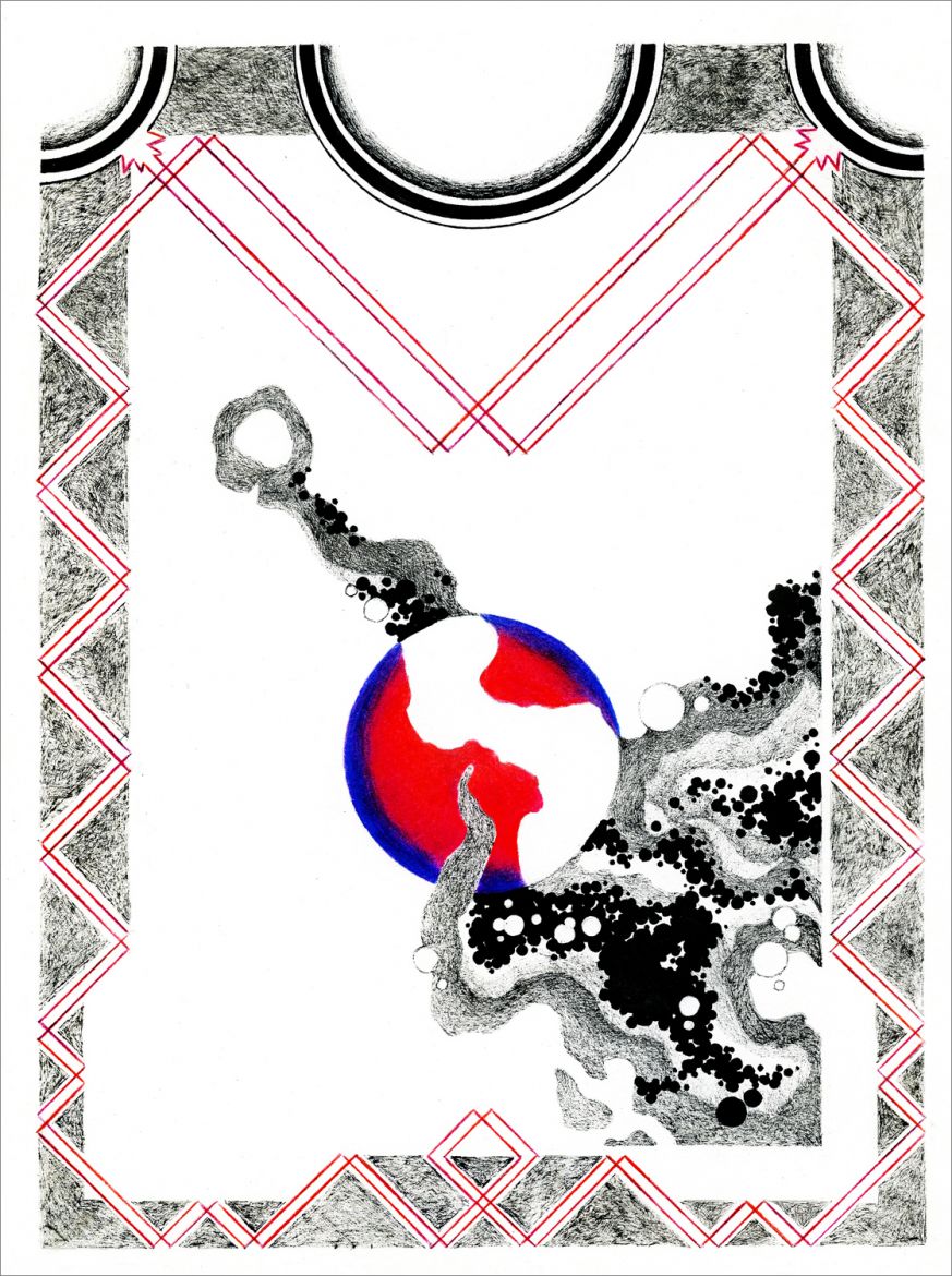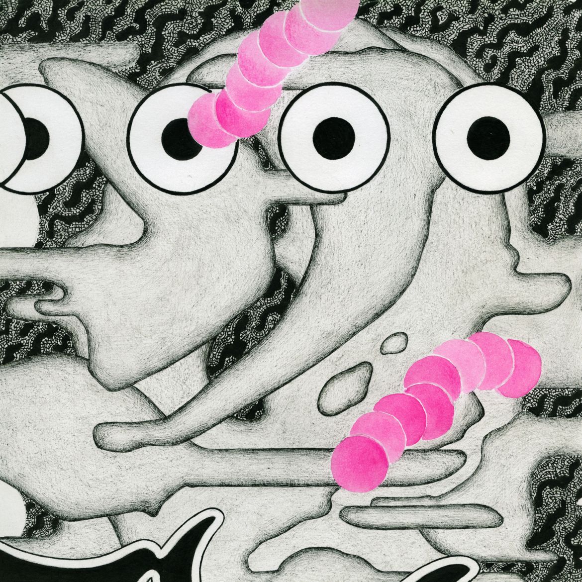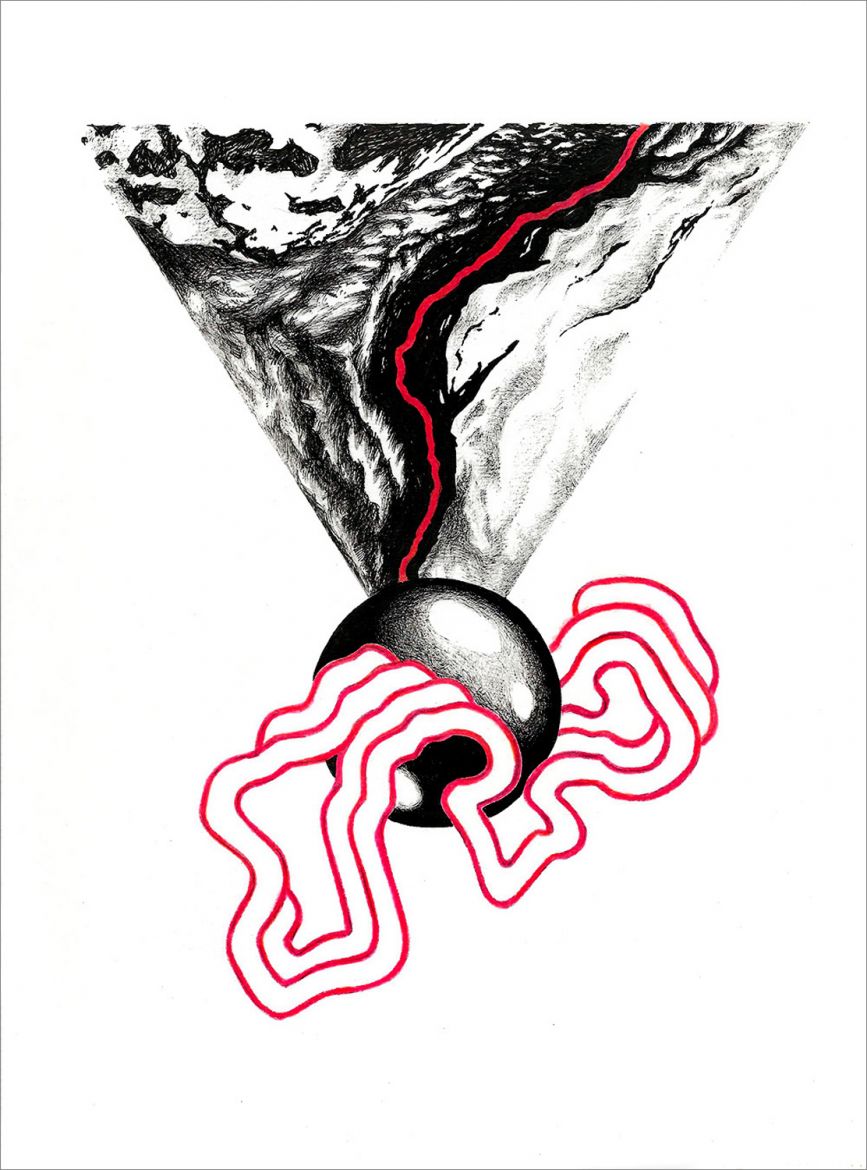Aérographe, encre, stylo-bille, collage sur papier, 40 x 30 cm