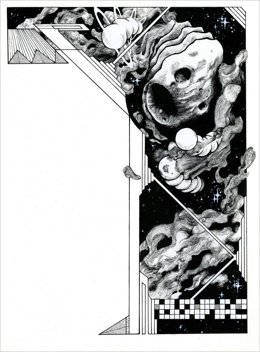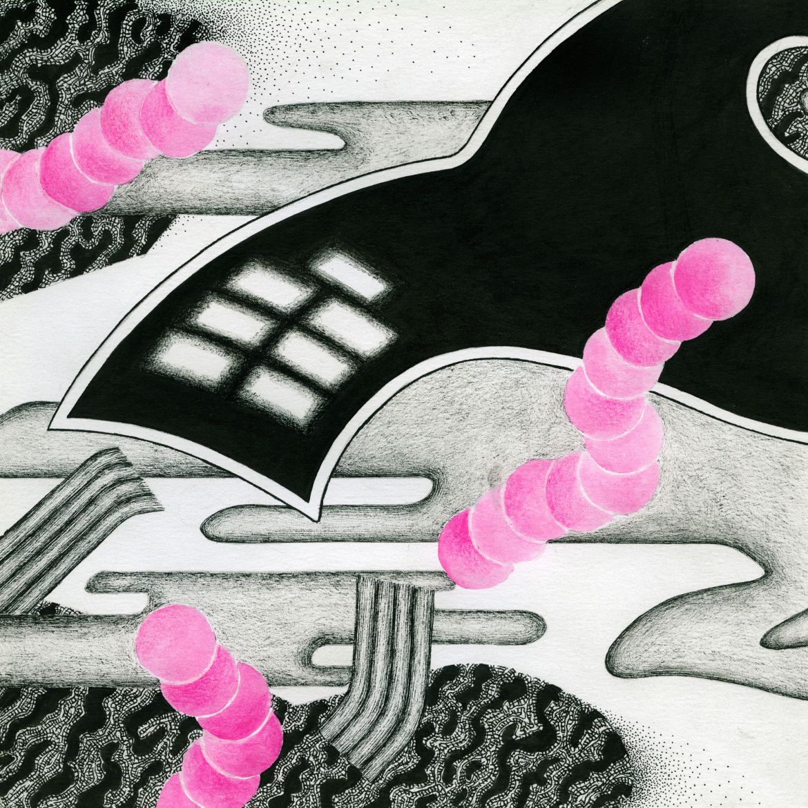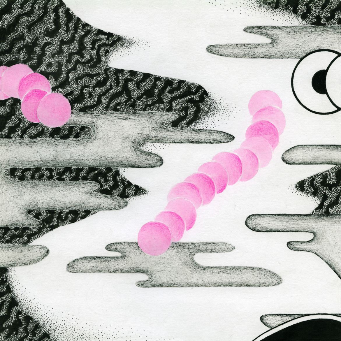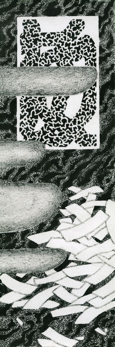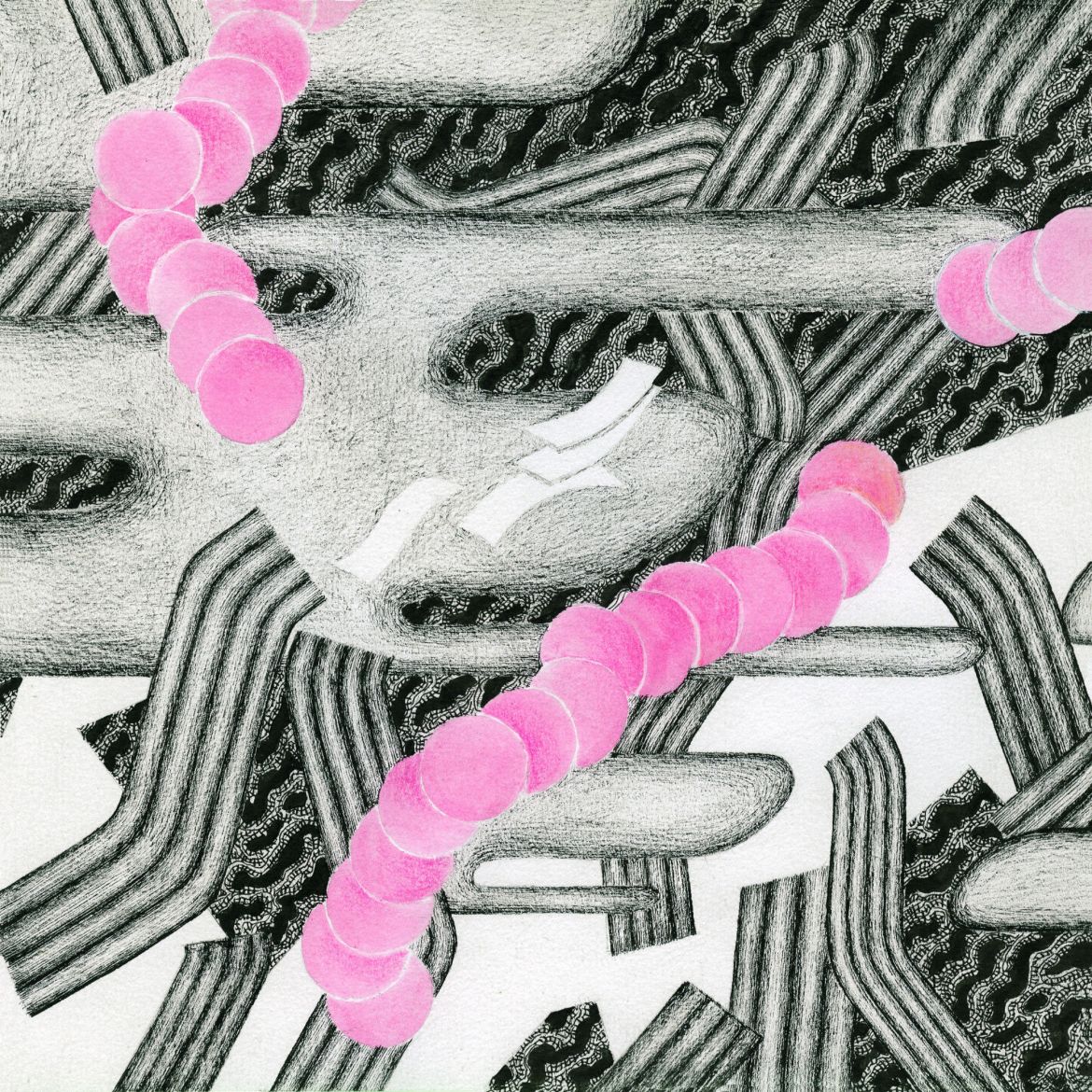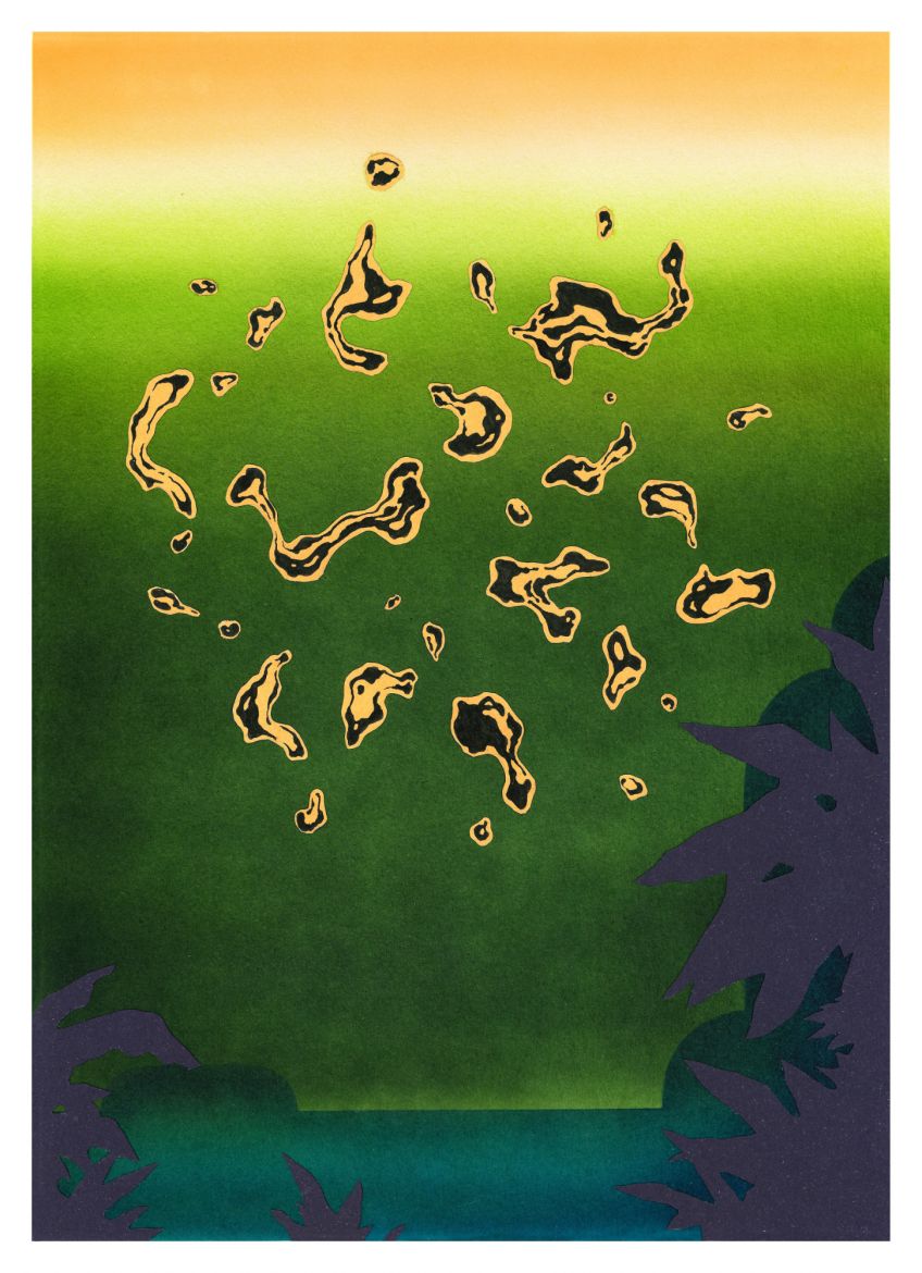 Aérographe, encre, stylo-bille, collage sur papier, 40 x 30 cm