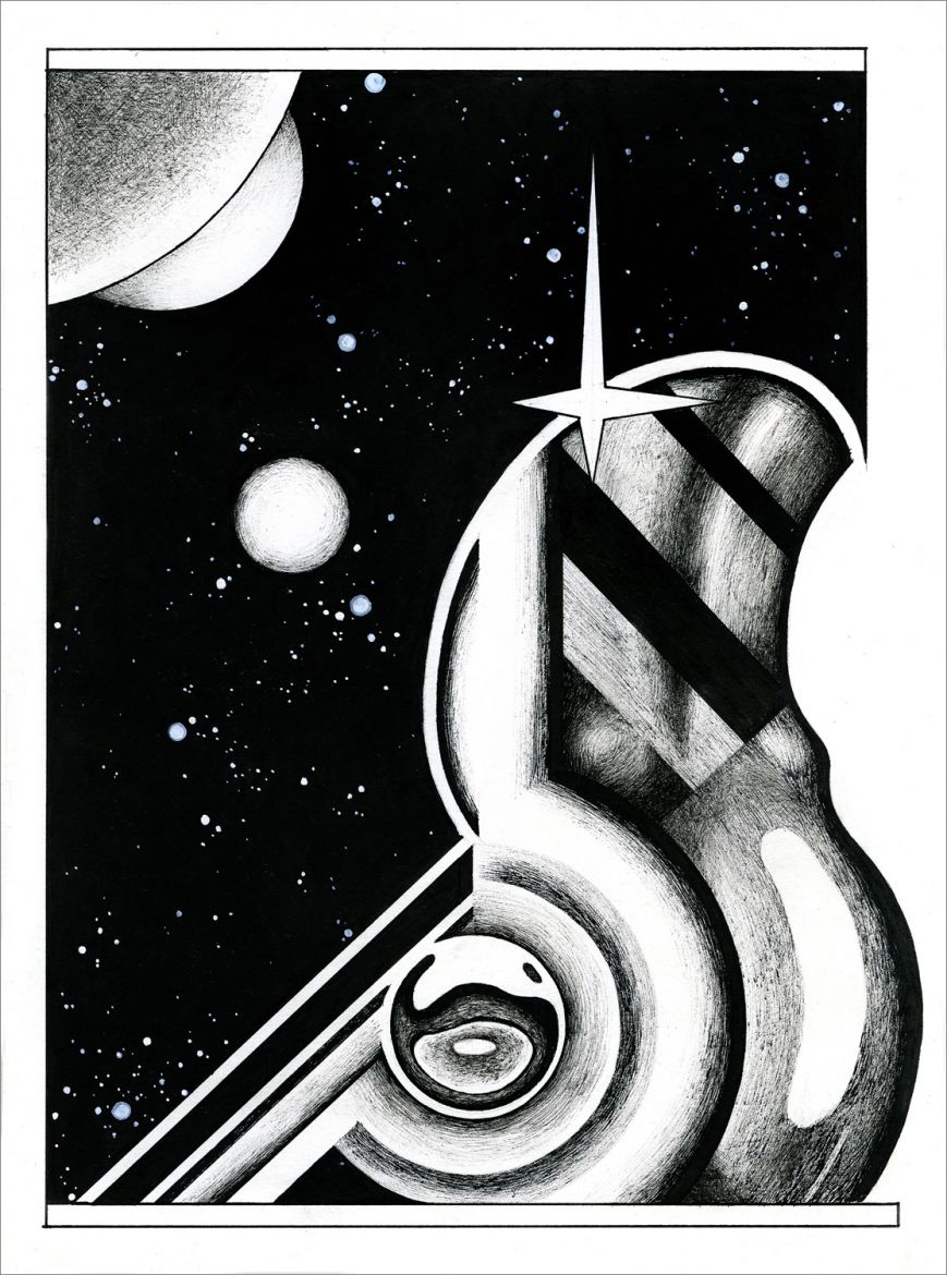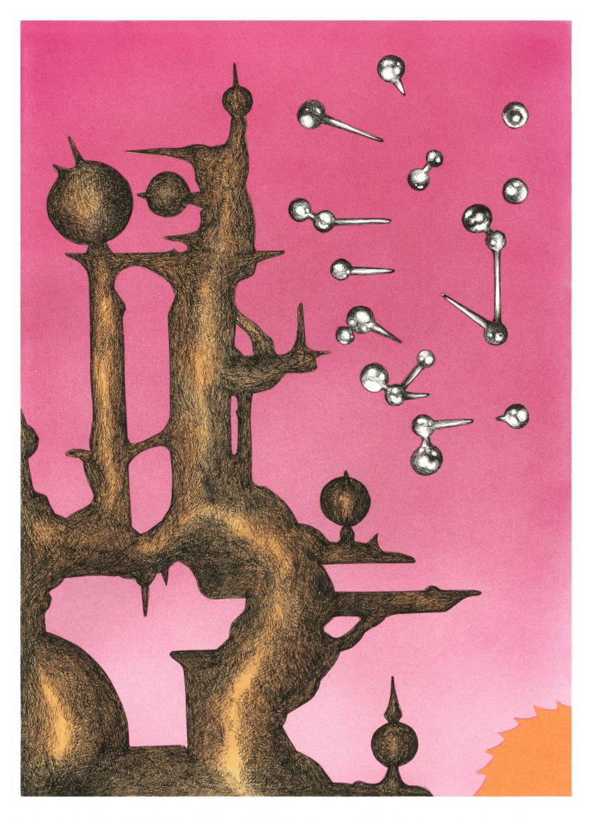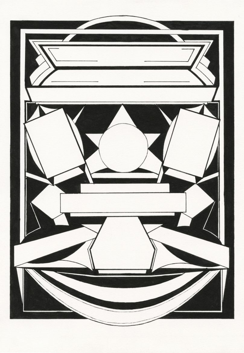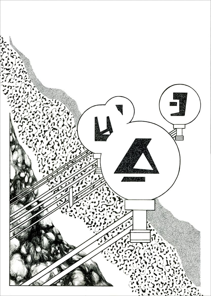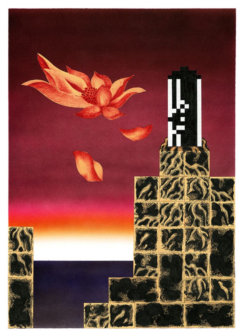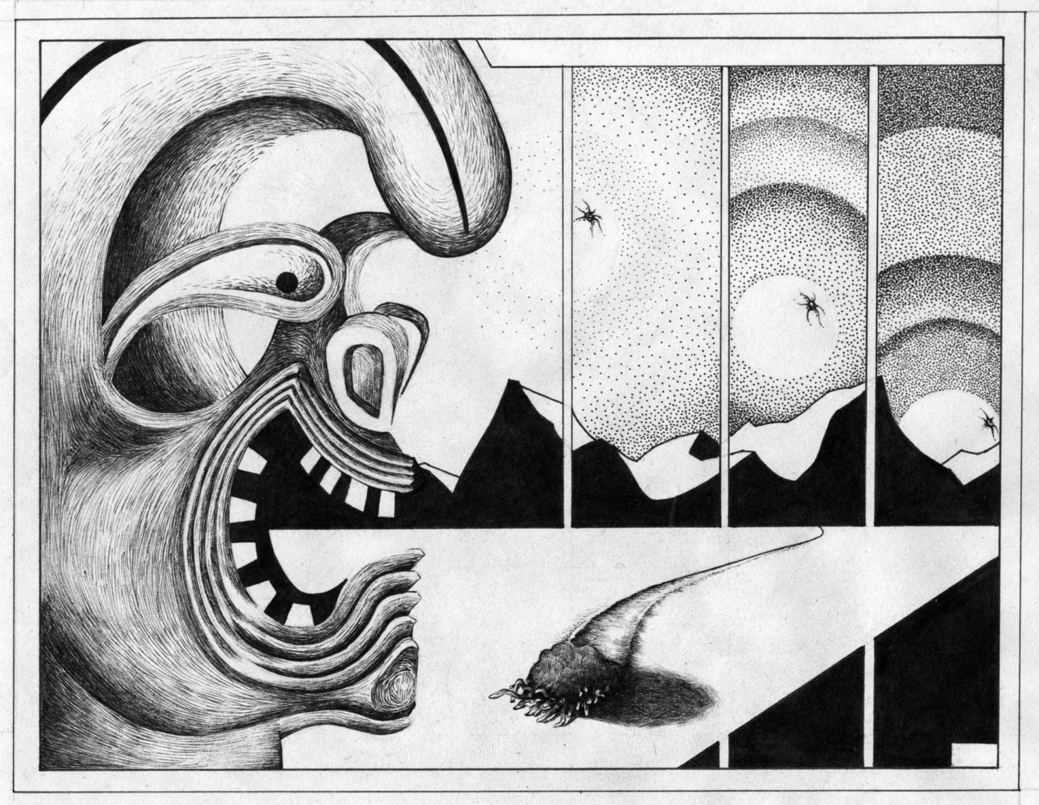 Aérographe, encre, stylo-bille, collage sur papier, 40 x 30 cm