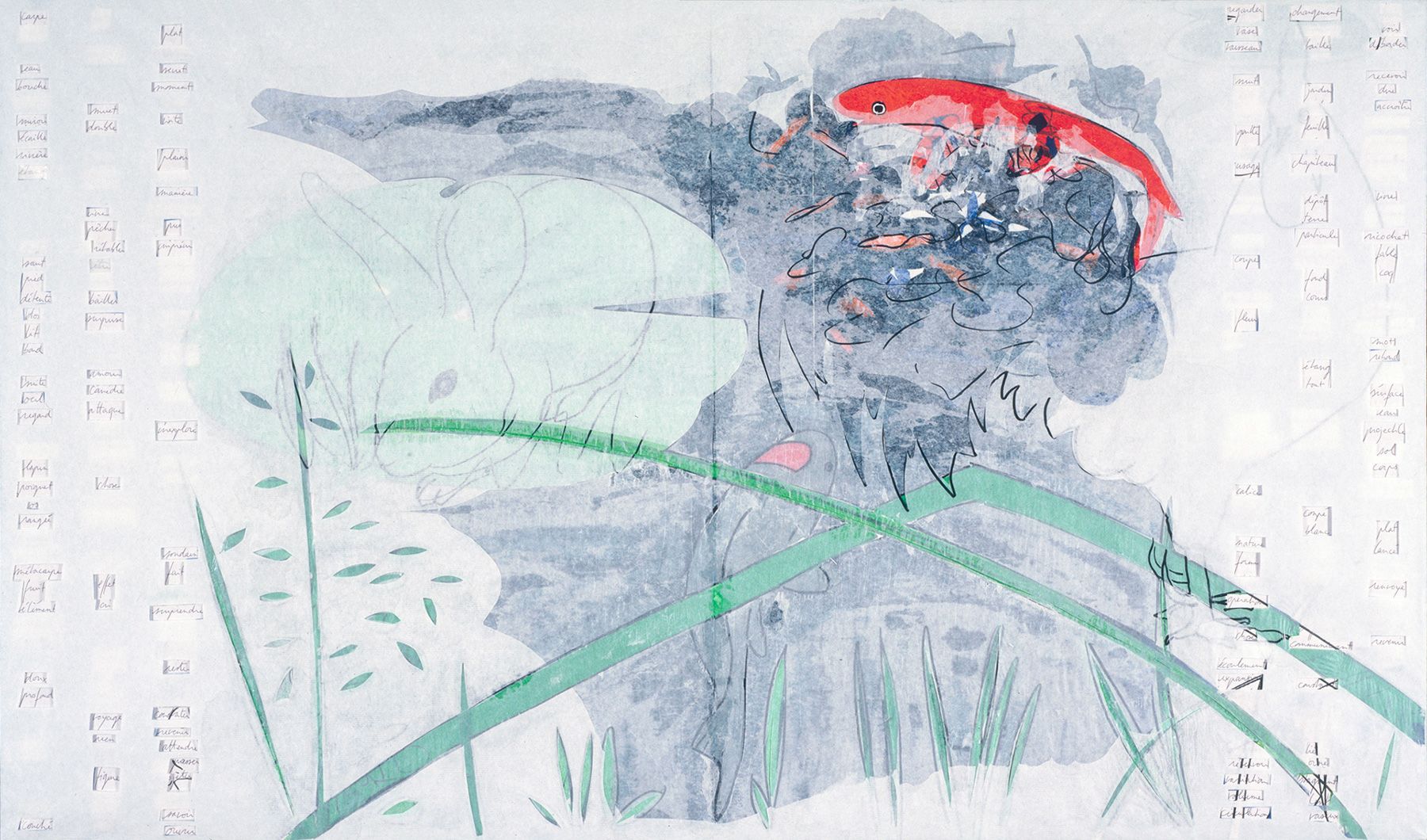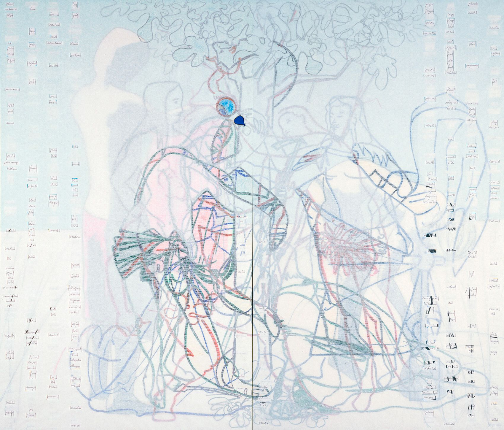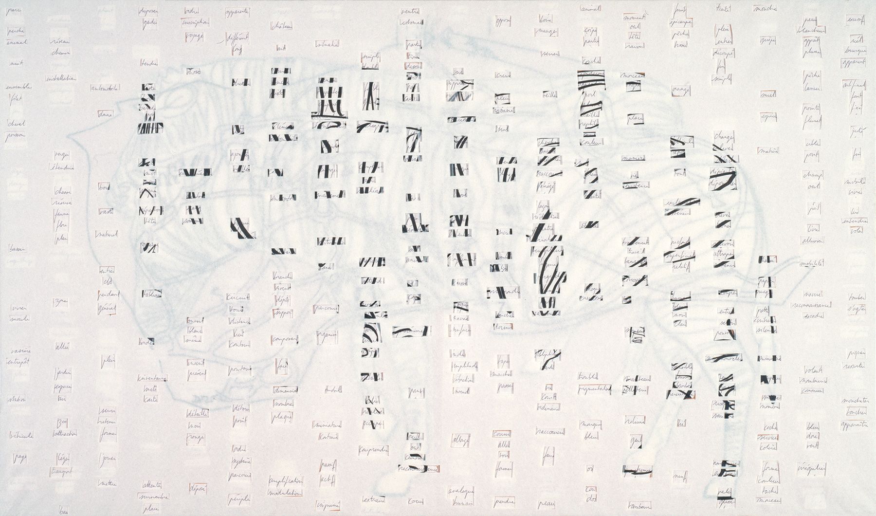 Dix panneaux 119 x 70 cm assemblés en sept groupes, contreplaqué 10 mm, papier, papier de soie coloré, feutre