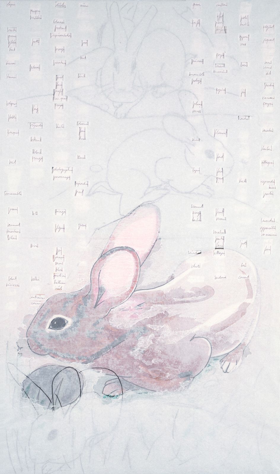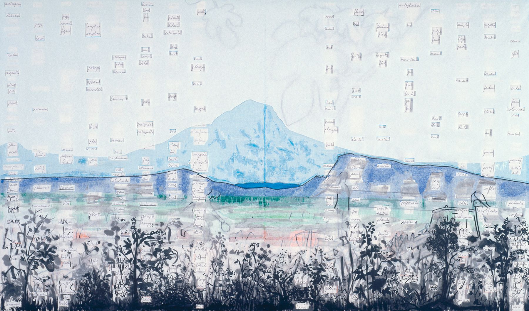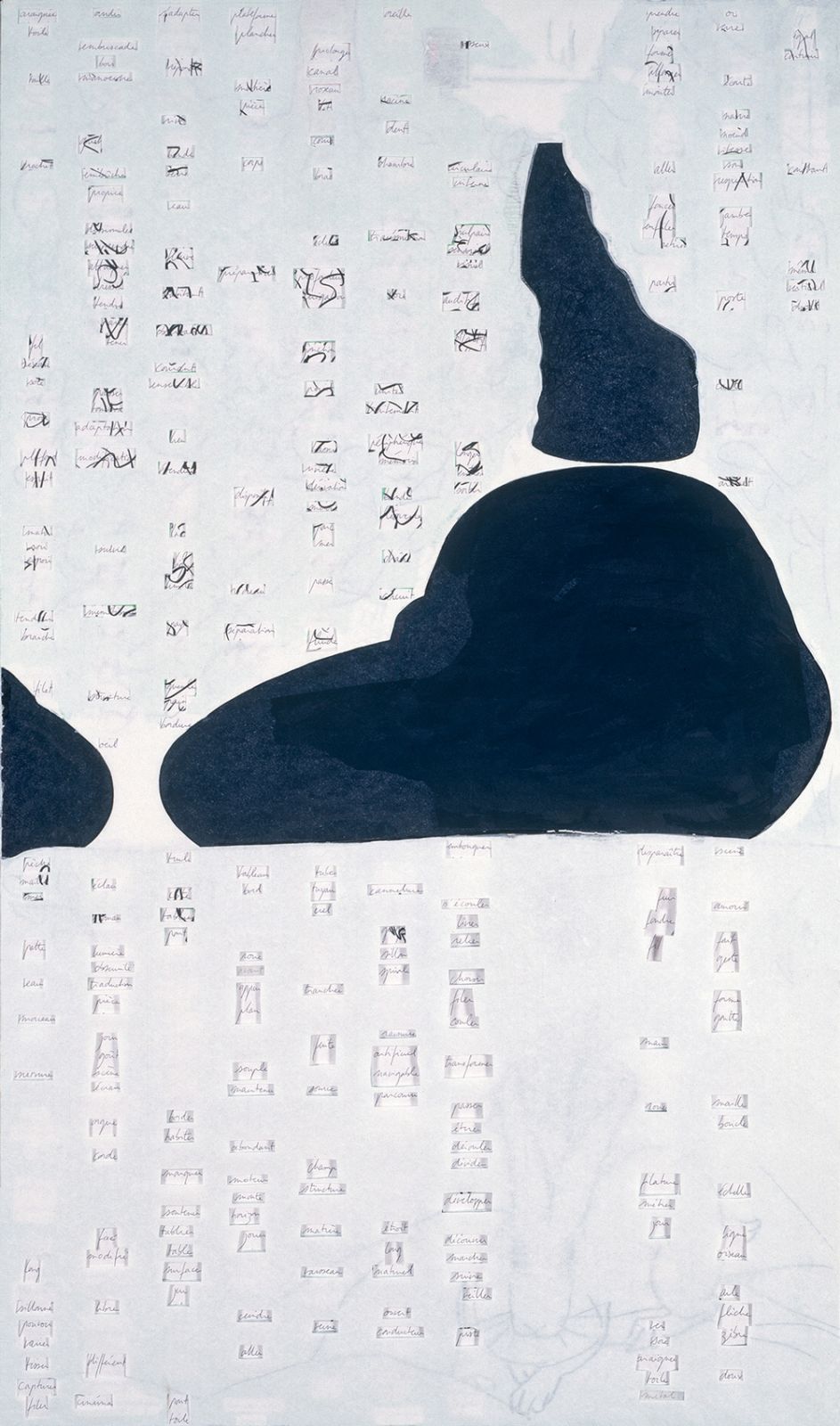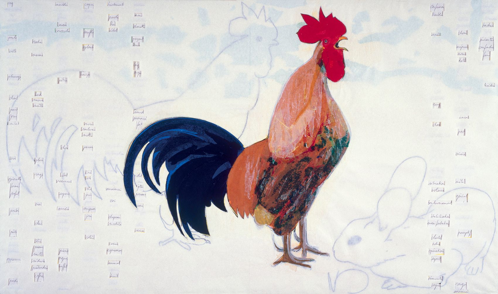 Dix panneaux 119 x 70 cm assemblés en sept groupes, contreplaqué 10 mm, papier, papier de soie coloré, feutre