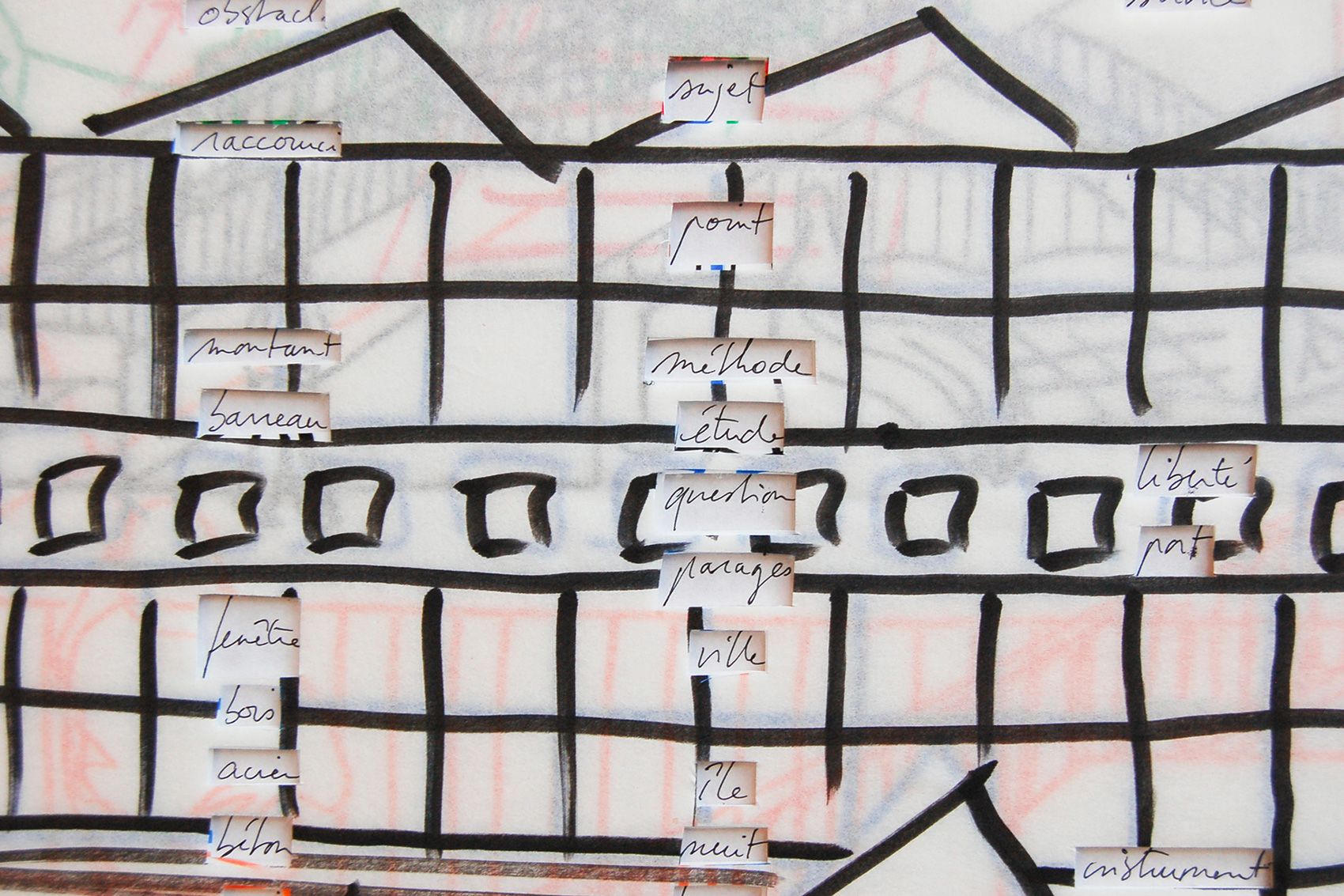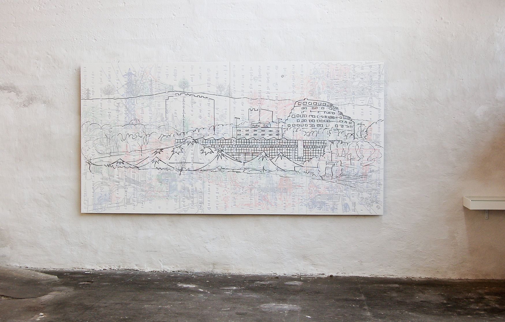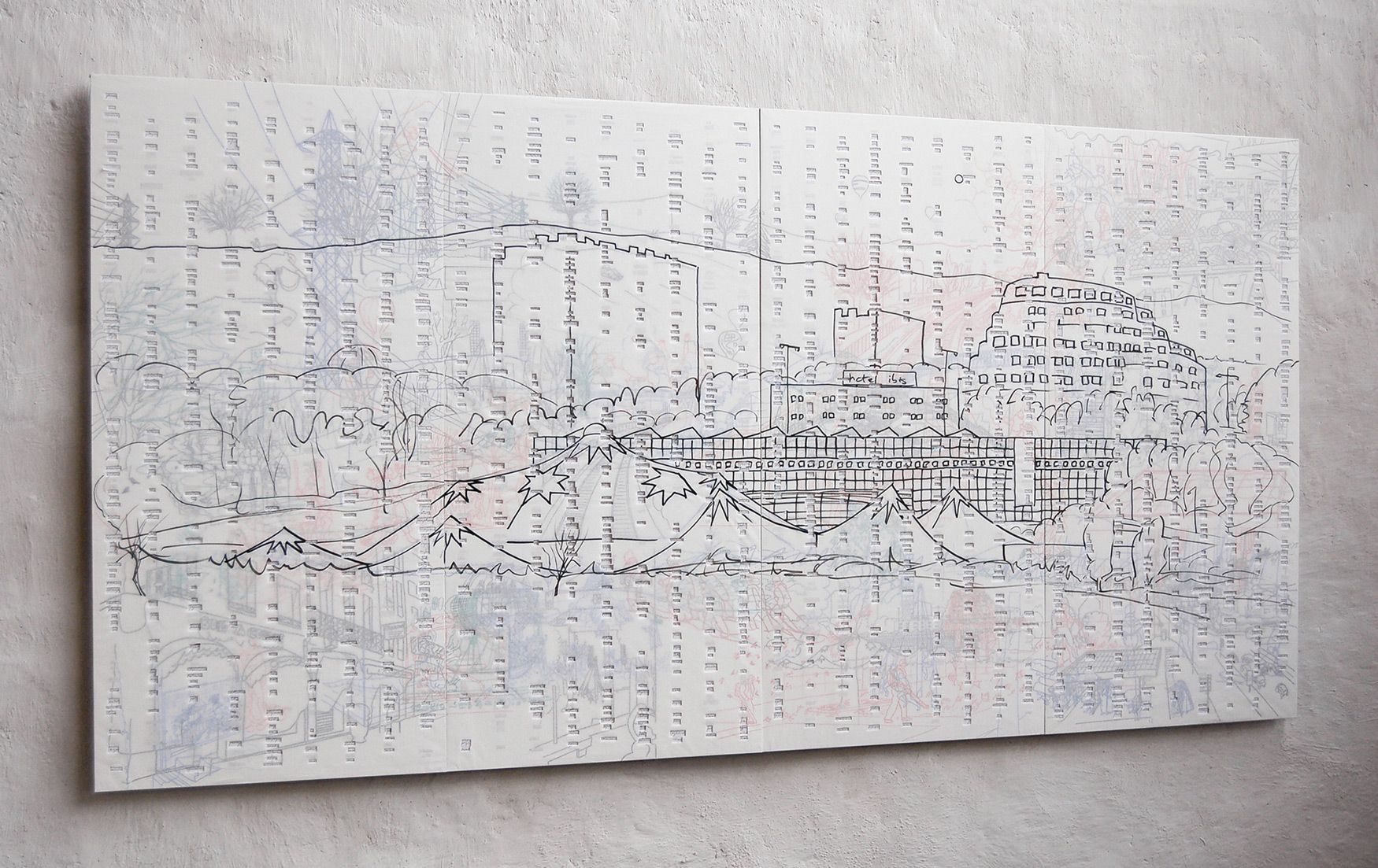 Un panneau, contreplaqué 10 mm, papier, feutre, 168 x 336 cm (4 planches 168 x 84 cm)
