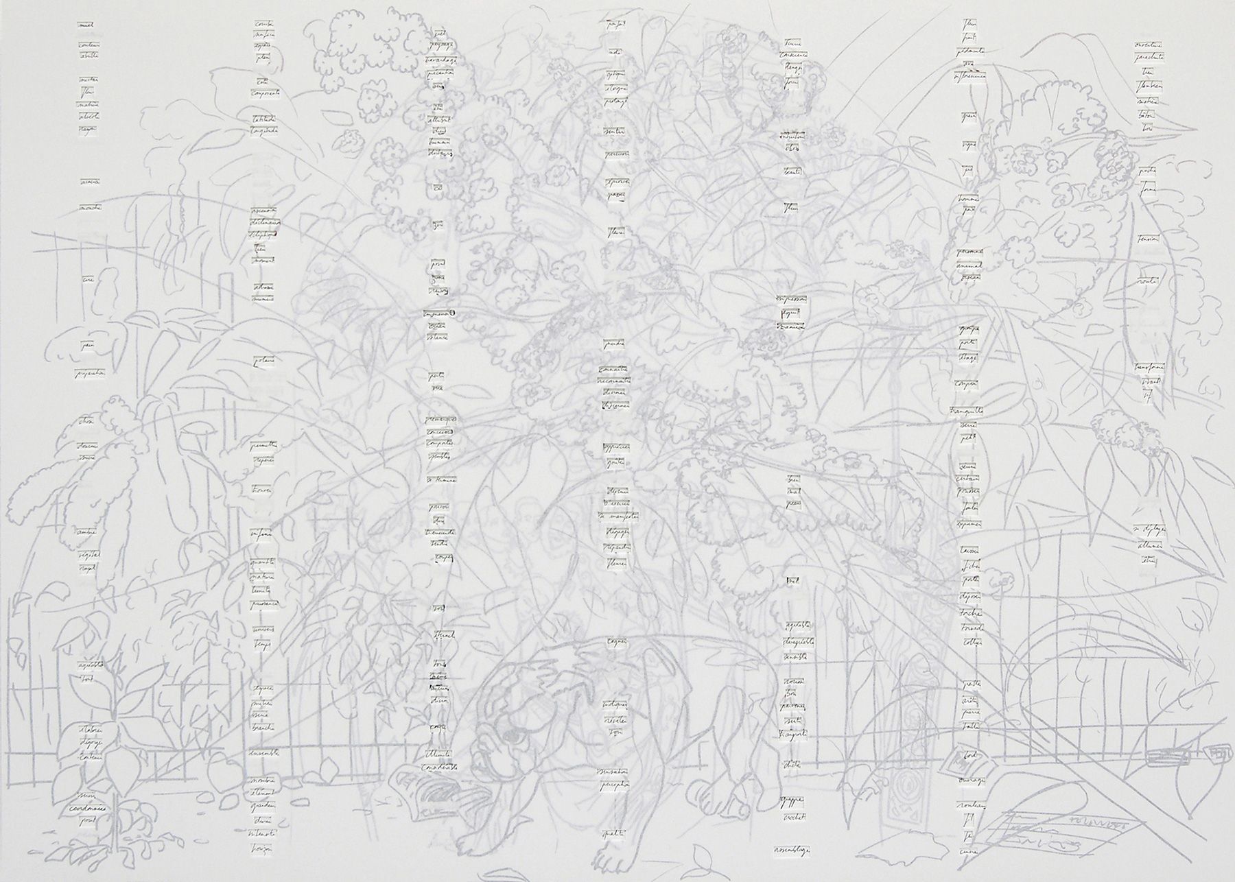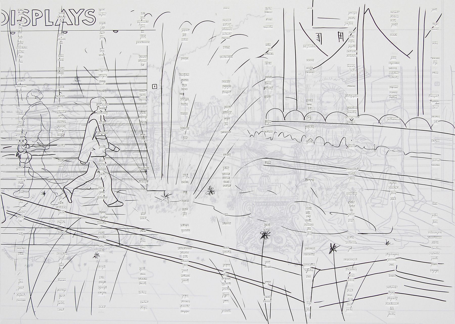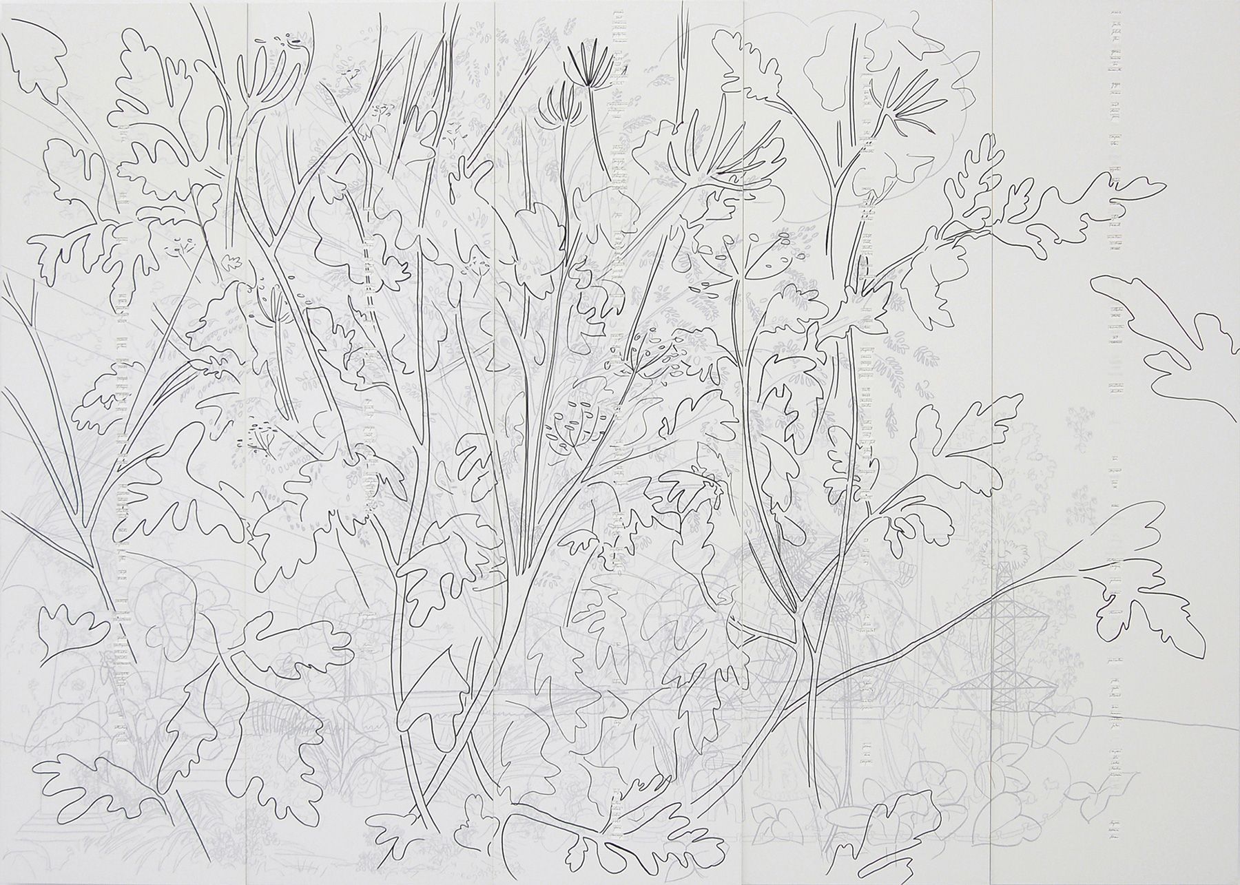 Cinq panneaux 100 x 140 cm, un panneau 200 x 280 cm (5 planches 200 x 56 cm), MDF 10 mm, papier, feutre