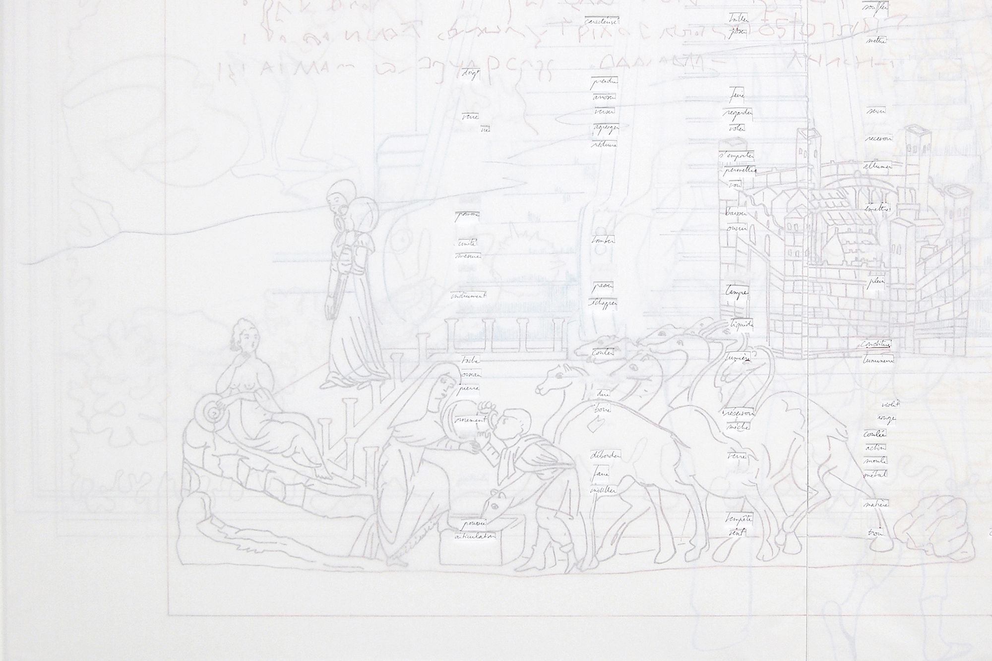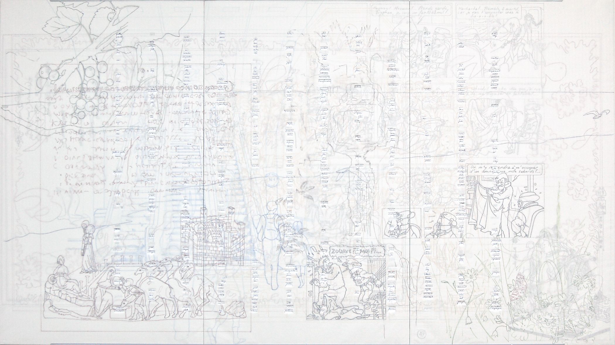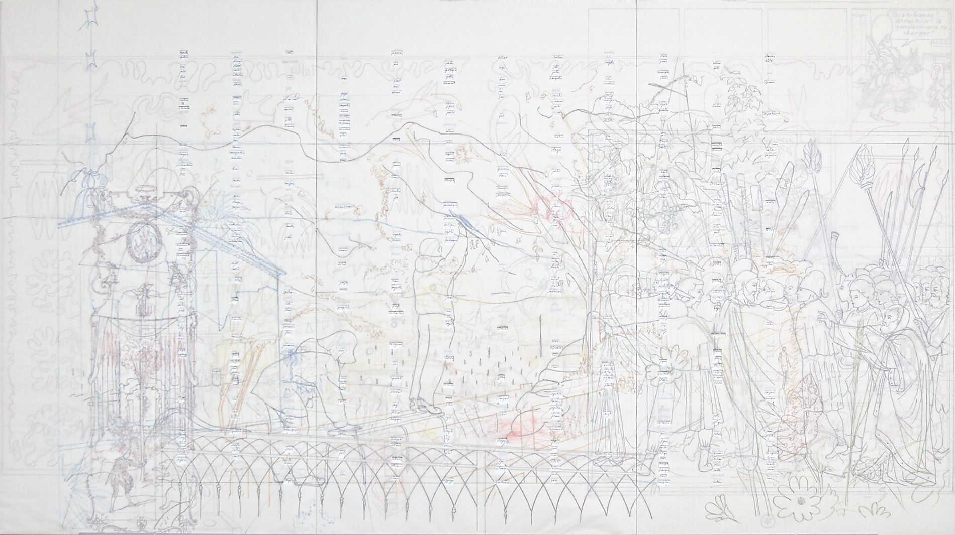 Deux panneaux, MDF 5 mm, papier, feutre, crayon de couleur, 135 x 240 cm (2 x 3 planches 135 x 80 cm)