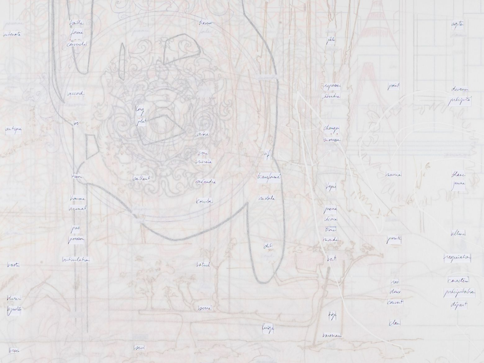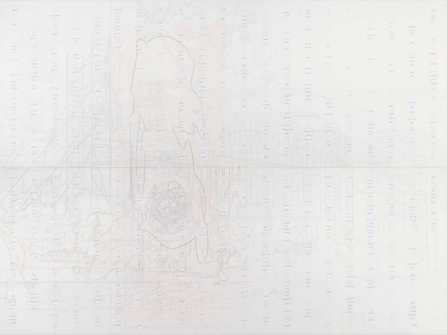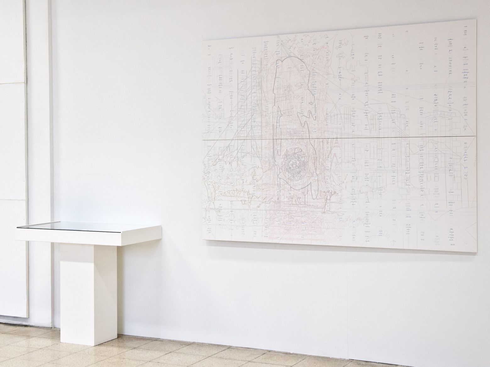Un panneau, bois 19 mm, papier, feutre, stylo, crayon de couleur, 144 x 192 cm, (2 planches 72 x 192 cm)