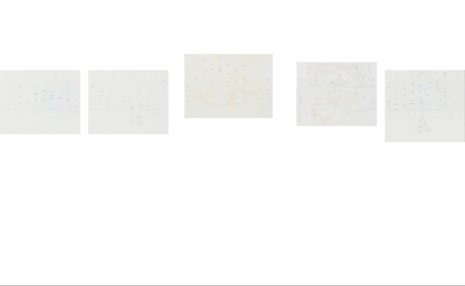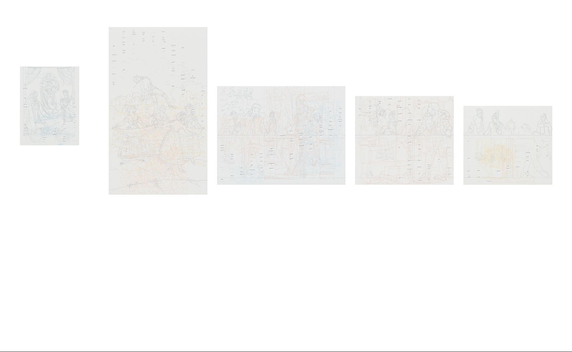 Dix tableaux : 56 x 70 cm, 56 x 70 cm, 56 x 77 cm, 56 x 70 cm, 63 x 70 cm, 56 x 42 cm, 119 x 70 cm, 70 x 91 cm, 63 x 70 cm,