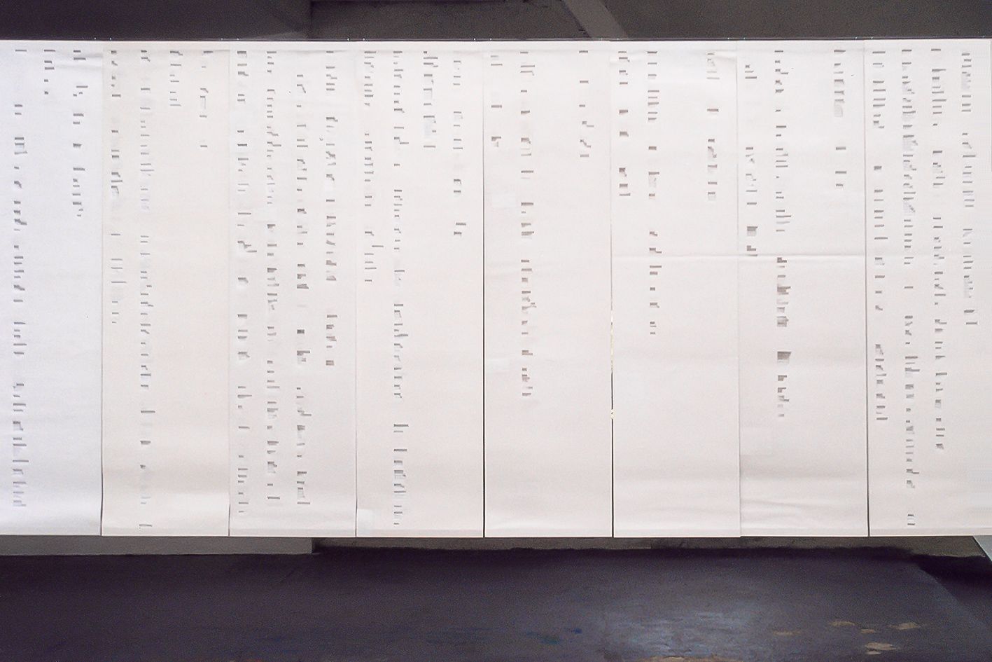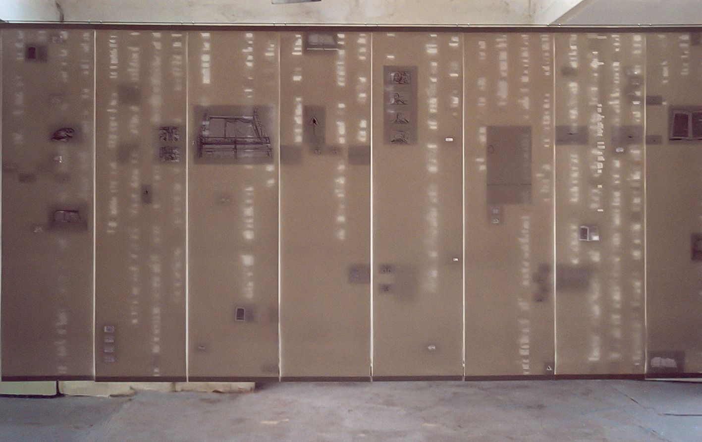 16 éléments 126 x 32 cm, papiers tenus sur baguettes, collage, 2002
