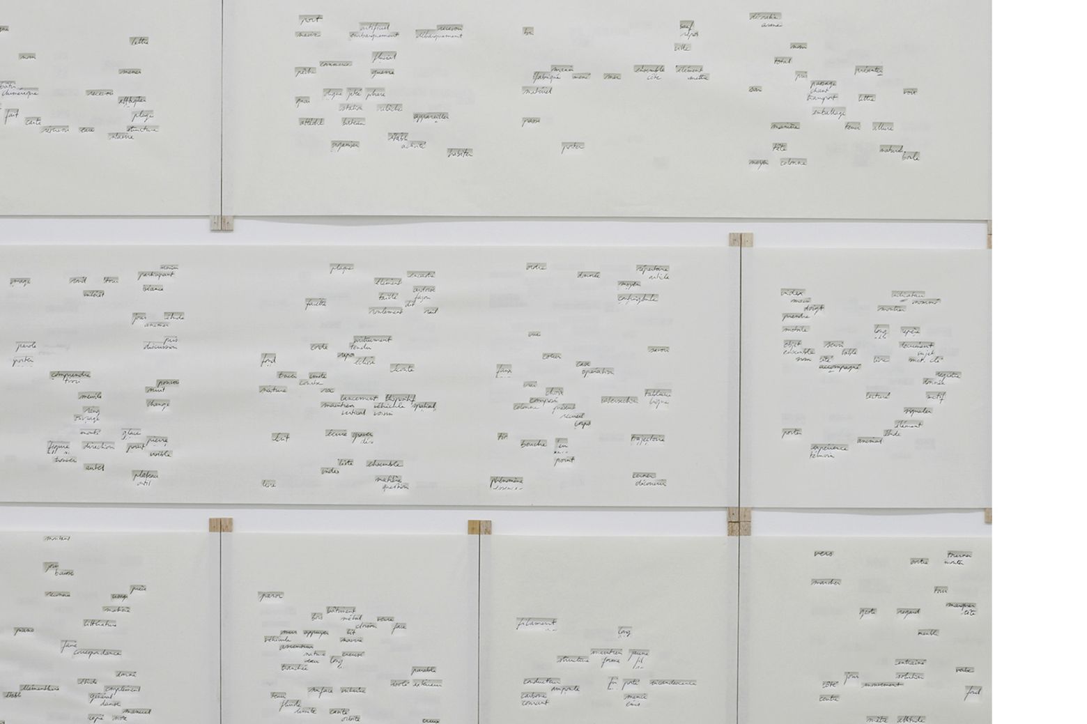 "Ensemble de la création, livre 2003", par exemple, présente des listes de mots qui sont retranscrits manuellement. Chaque mot engendre la liste, il est choisi dans le dictionnaire en relation à l'œuvre en cours. Les mots retenus dans les définitions proposées sont les verbes, les adjectifs et les substantifs. Ils constituent les matériaux de départ à la conception d'une écriture poétique. Christelle Franc crée des relations entre les différentes formes expressives glanées au fil de ses lectures, promenades à travers les choses qu'elle rencontre, saisit, isole afin de les retrouver plus tard. Chaque panneau réalisé au fur et à mesure matérialise le temps du livre. La lisibilité est graduée par la multiplication de couches de papier plus ou moins transparent. Ici au centre d'art, sont présentés le troisième et le sixième panneau de la "Création", deuxième et quatrième temps de l'ensemble réalisé en 2003-2004. (Sept jours, sept temps).