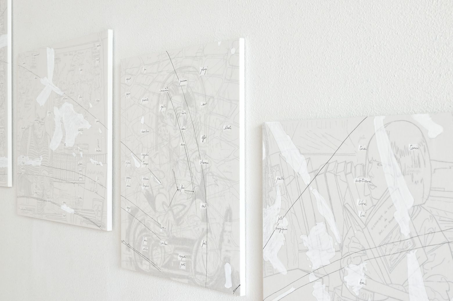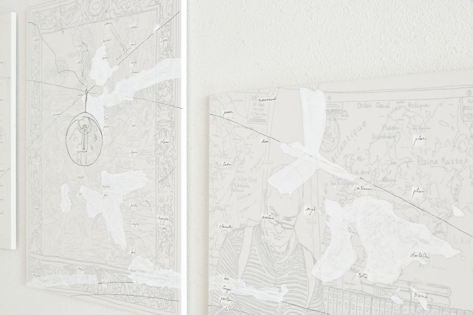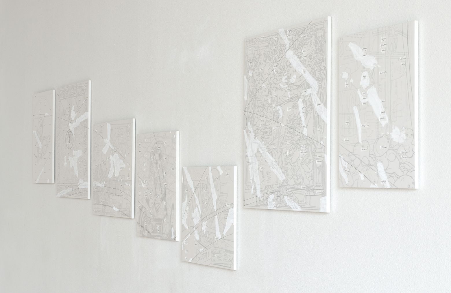 Sept panneaux, 49 x 32 cm, 56 x 48 cm, 42 x 48 cm, 42 x 36 cm, 35 x 40 cm, 56 x 48 cm, 42 x 32 cm, MDF 10 mm, papier, feutre, stylo, crayon de papier, gouache
