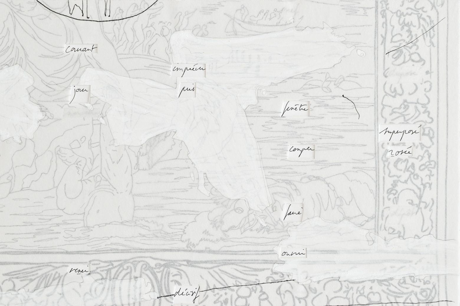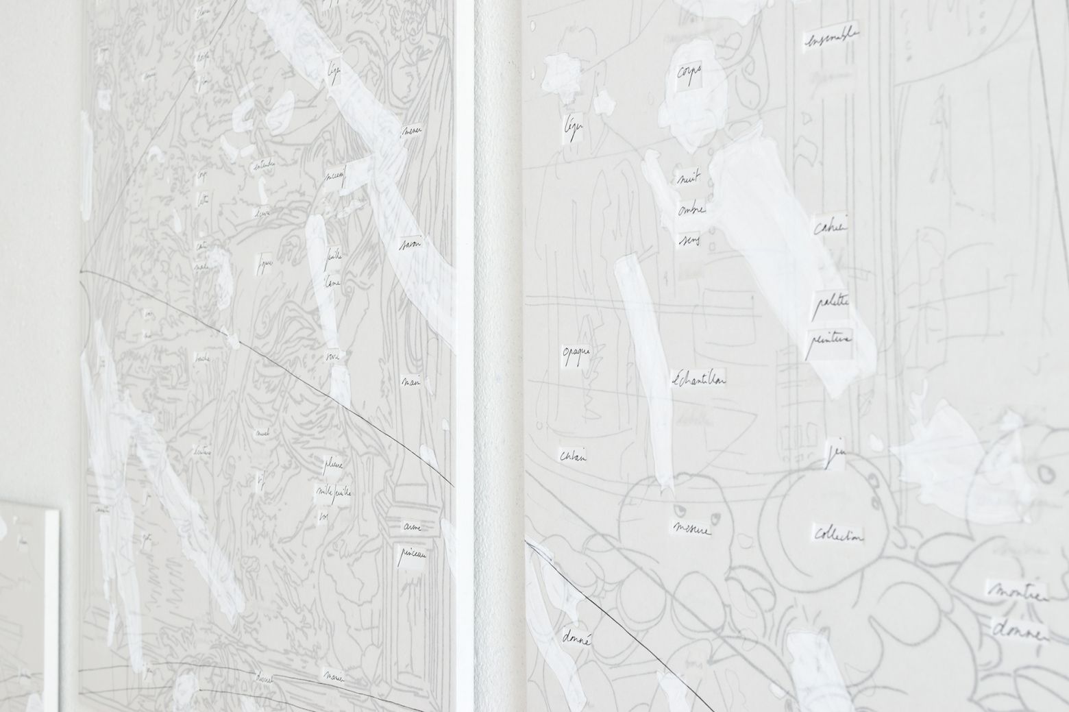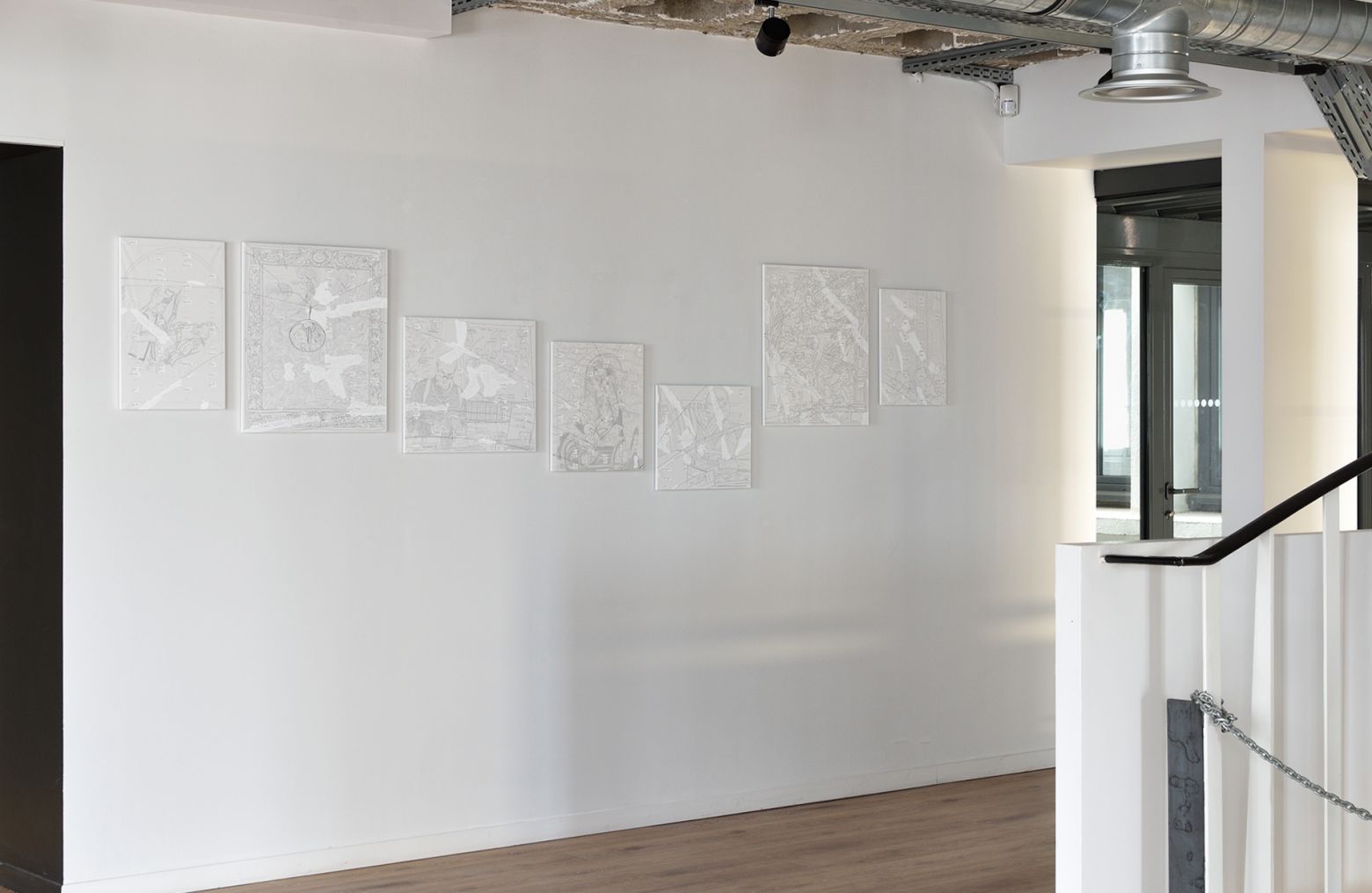 Sept panneaux, 49 x 32 cm, 56 x 48 cm, 42 x 48 cm, 42 x 36 cm, 35 x 40 cm, 56 x 48 cm, 42 x 32 cm, MDF 10 mm, papier, feutre, stylo, crayon de papier, gouache