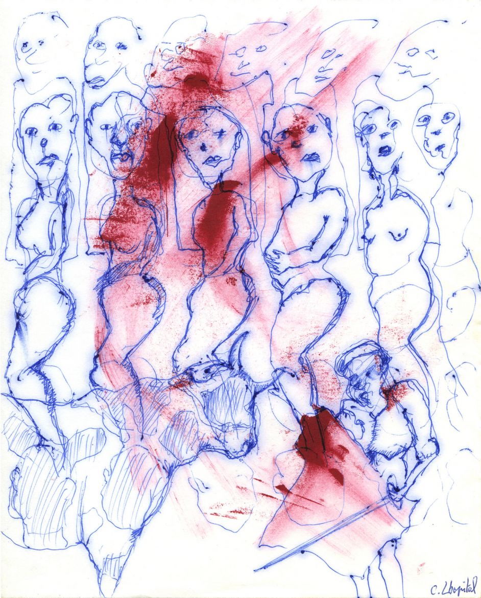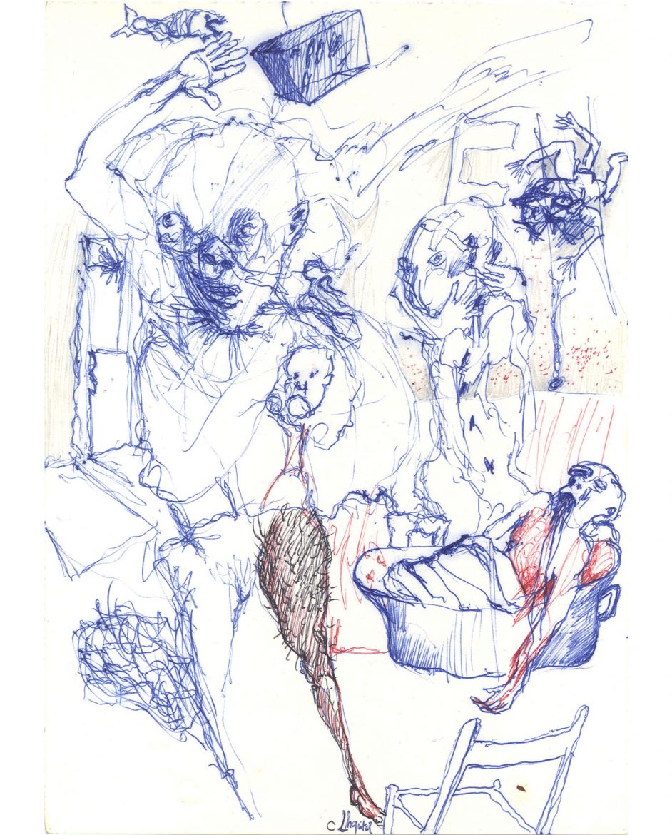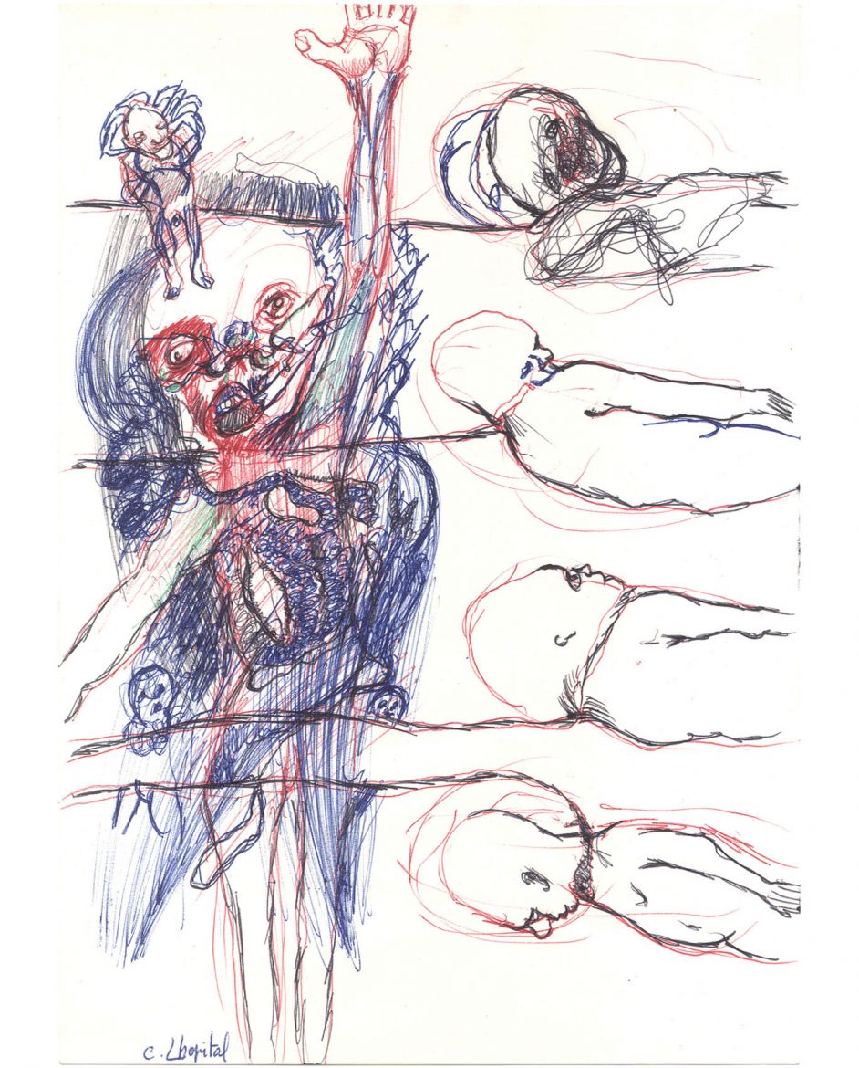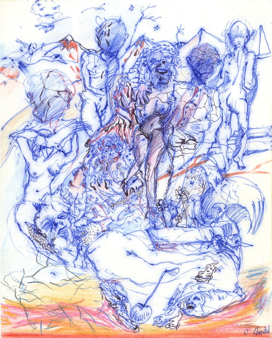 Stylo bille et crayons sur papier, 21 x 17 cm
