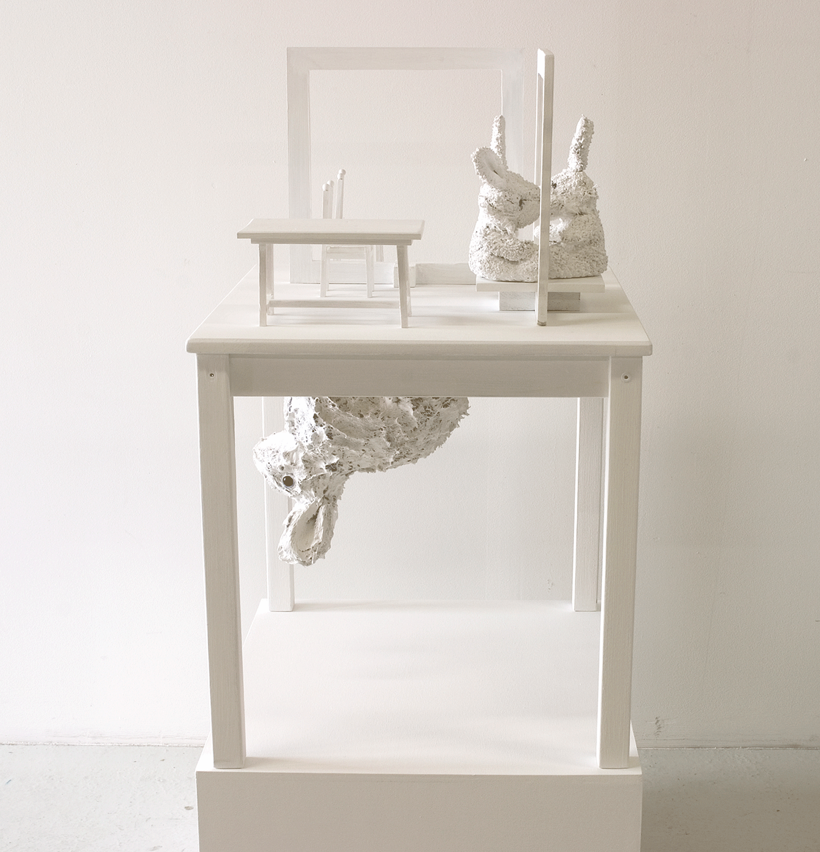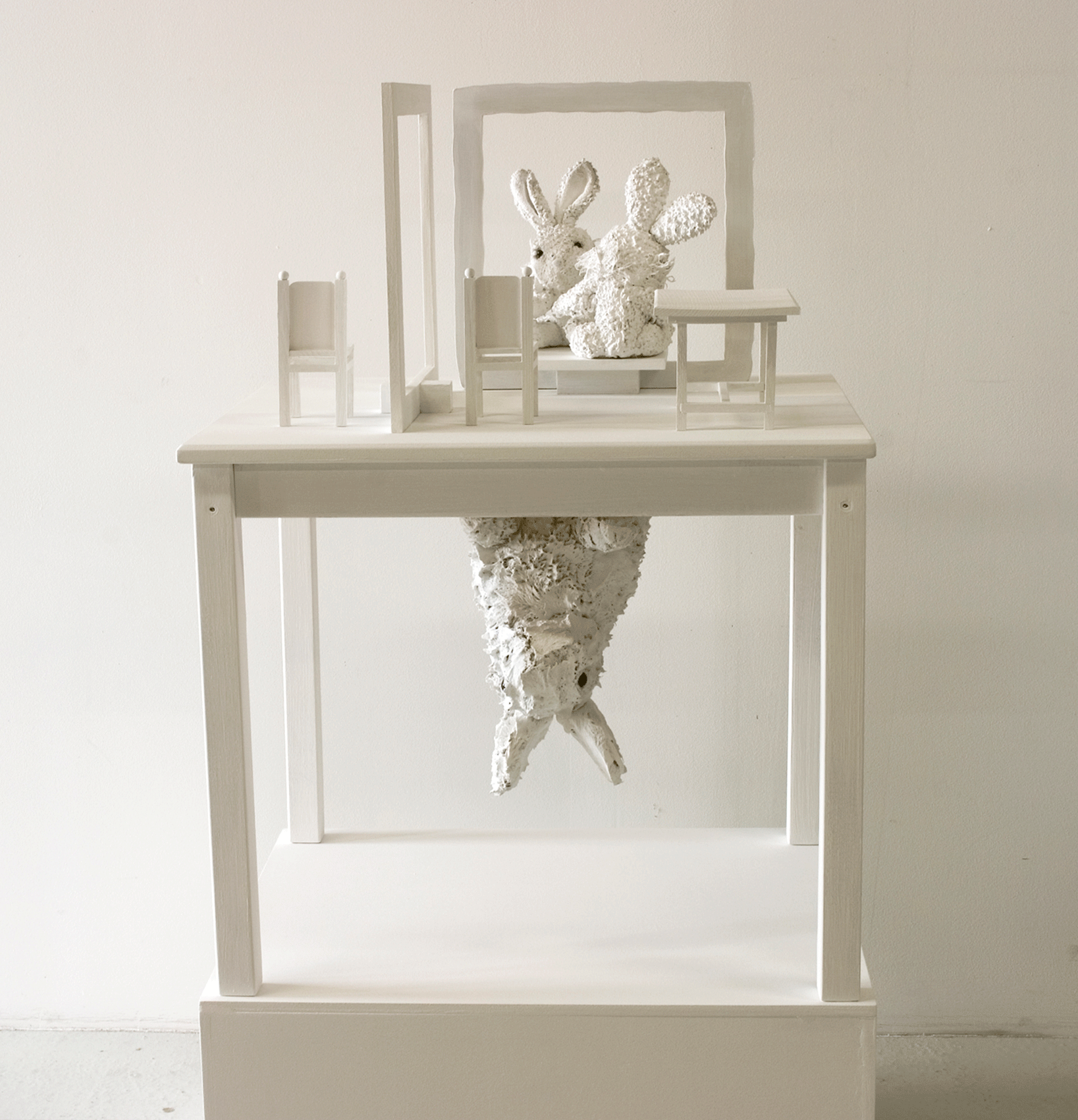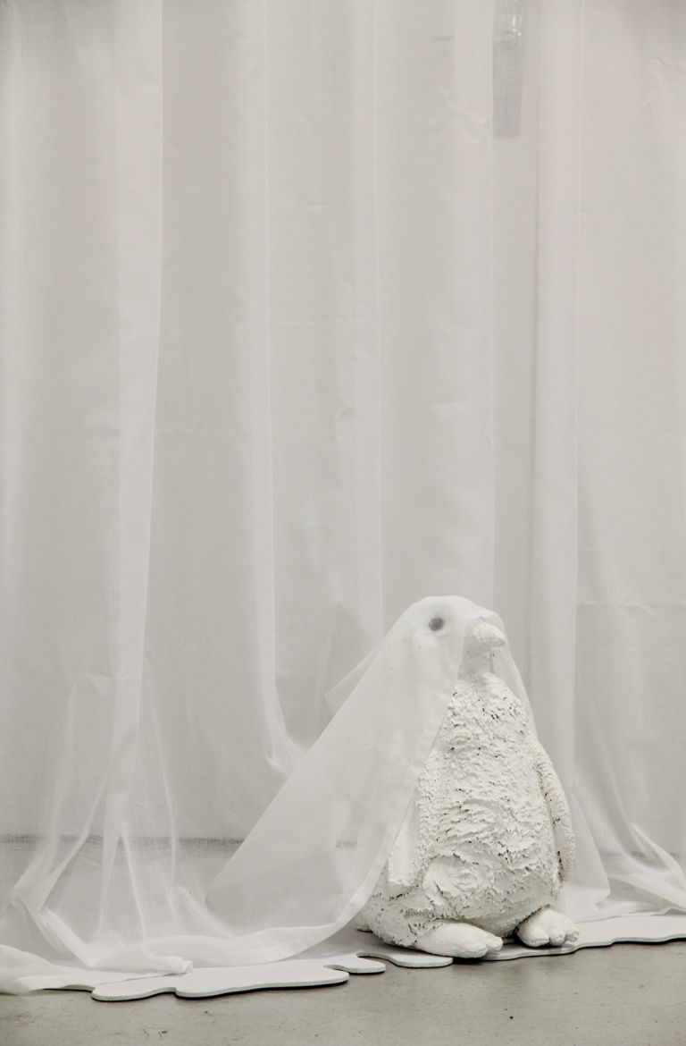 Peluche, pâte plastique, fil de fer, peinture, 59 x 15 x 15 + socle 80 x 59 x 15 cm