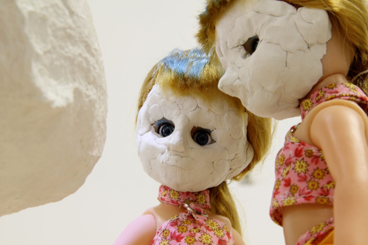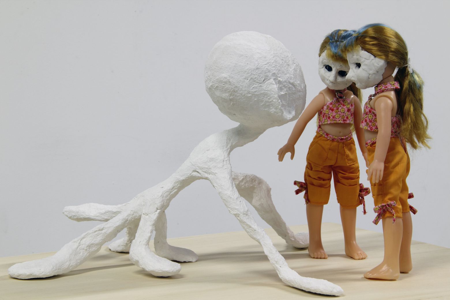 Peluche, bois, acier, coton hydrophile, pâte plastique, peinture, 35 x 35 x 35 cm