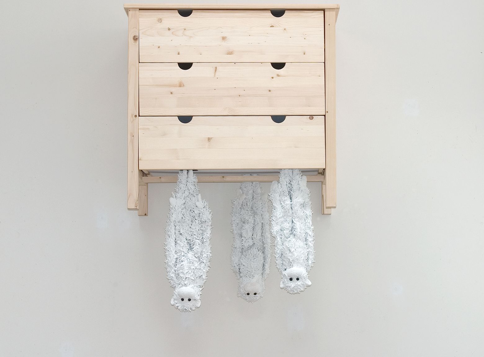 Peluches, papier, bois, peinture, 62 x 40 x 16 cm