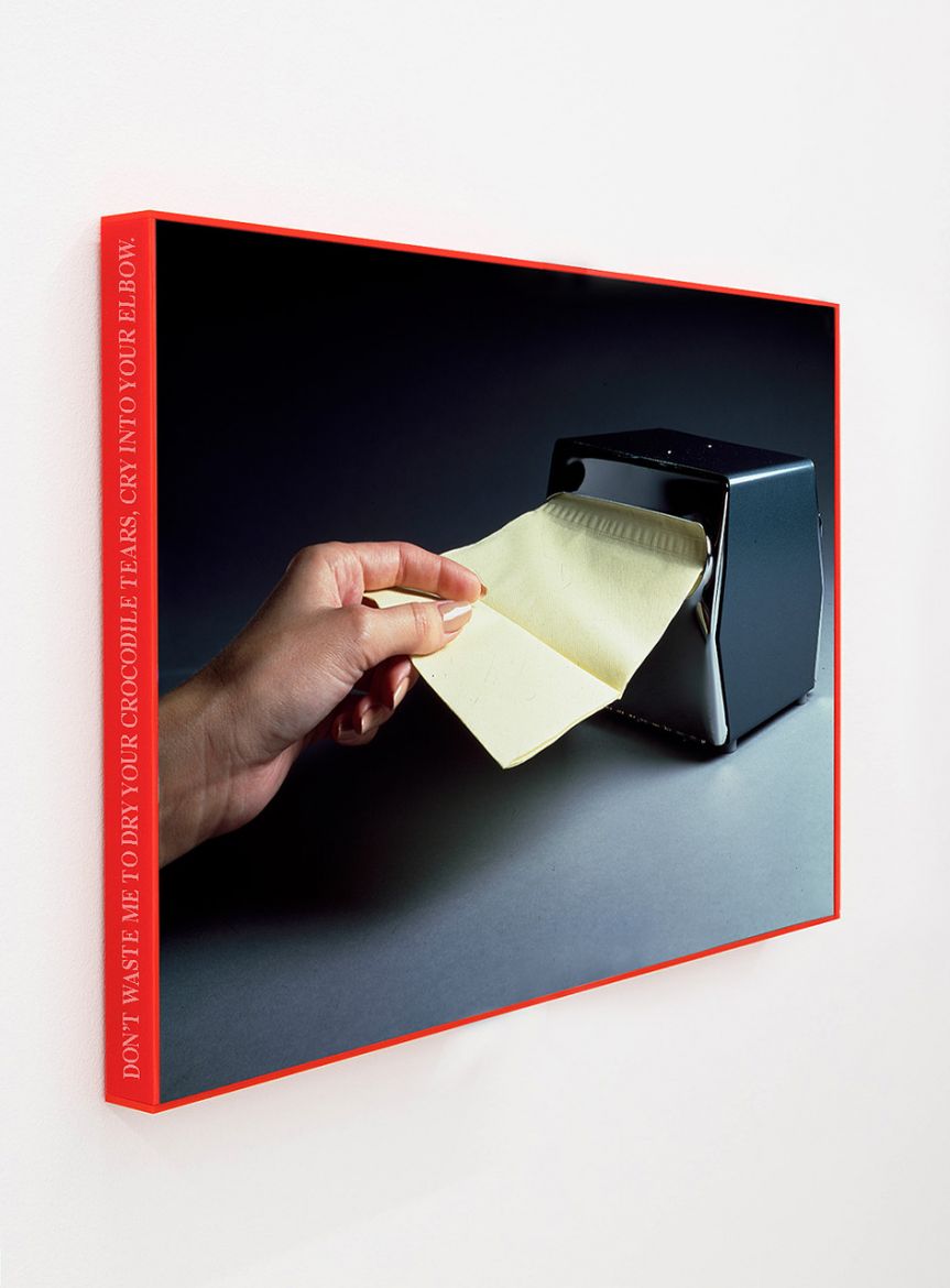 Derrière leur séduction subliminale, ces images encadrées de plexiglas dessinent la matérialisation agressive de notre vulnérabilité. Leur lecture souple nous amène à nous pencher sur leurs tranches gravées, à en mesurer l’épaisseur, à nous interroger sur les pulsions irrationnelles que génère leur matérialité et, là, par mithridatisation, à adopter de nouvelles attitudes. Elles nous invitent à penser de nouveaux gestes barrières et à nous garder de programmer l’obsolescence de nos écosystèmes. Rien de plus jetable qu’un mouchoir, me direz-vous. Et pourtant, que penserons-nous lorsque ce carré blanc, suprématiste, chargé de toutes les utopies modernistes, déplié de son patron, s’adressera enfin à nous pour nous crier : Don’t waste me to dry your crocodile tears, cry into your elbow !