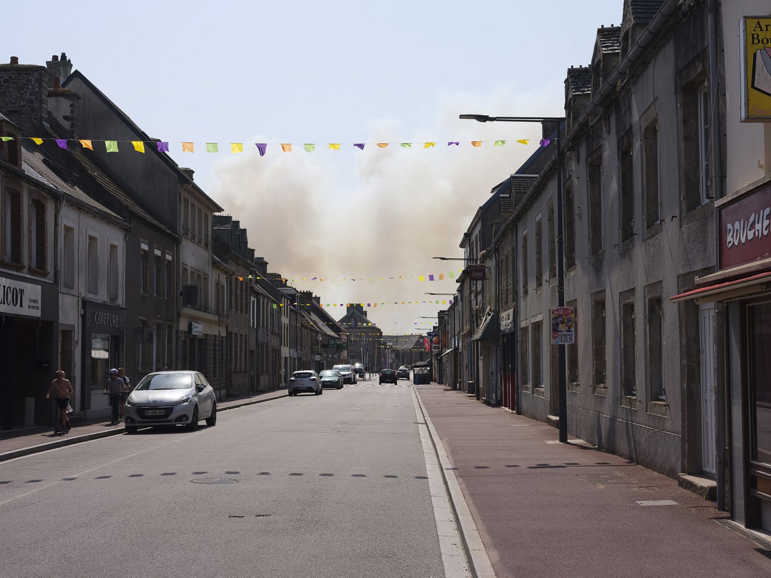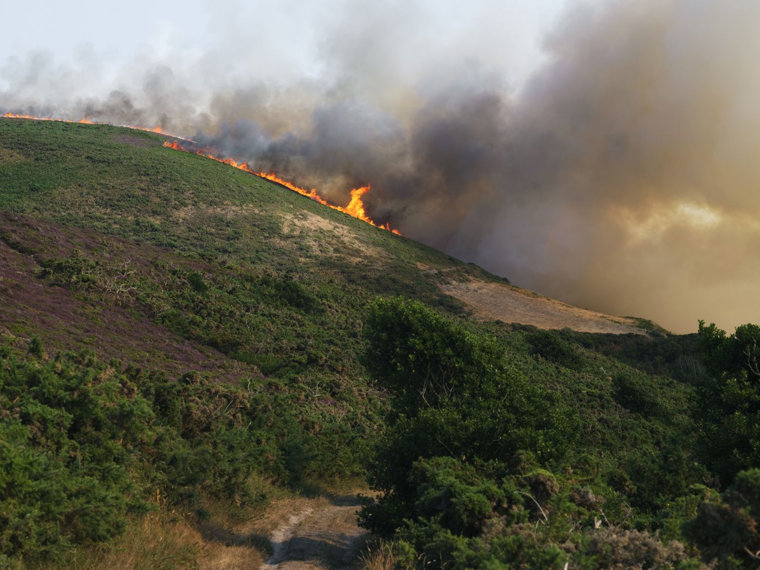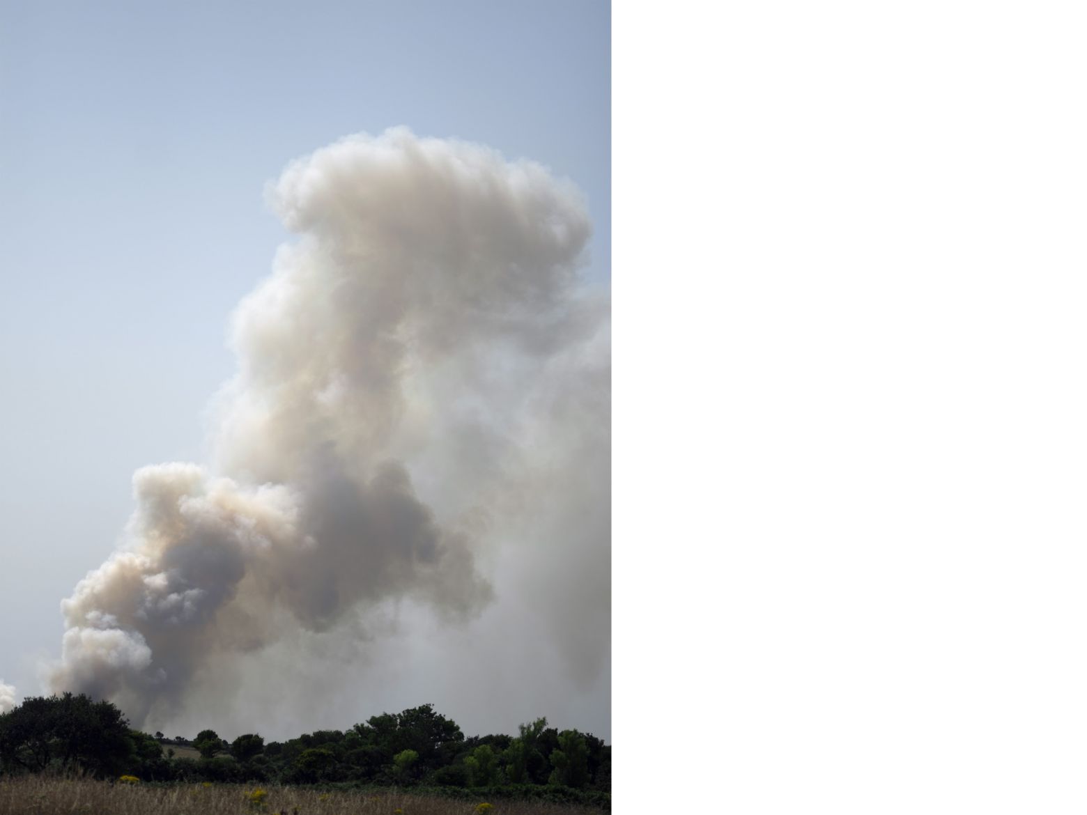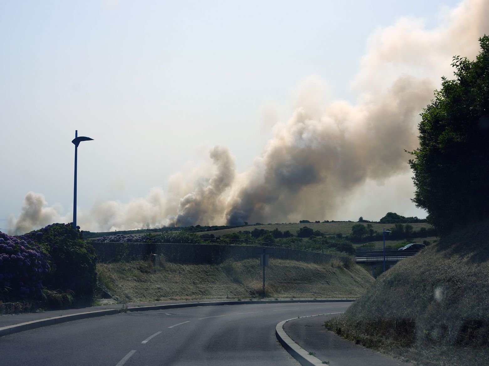 Point de vue vers Guernesey durant l’incendie à la Hague ; la Hague, juillet 2022
