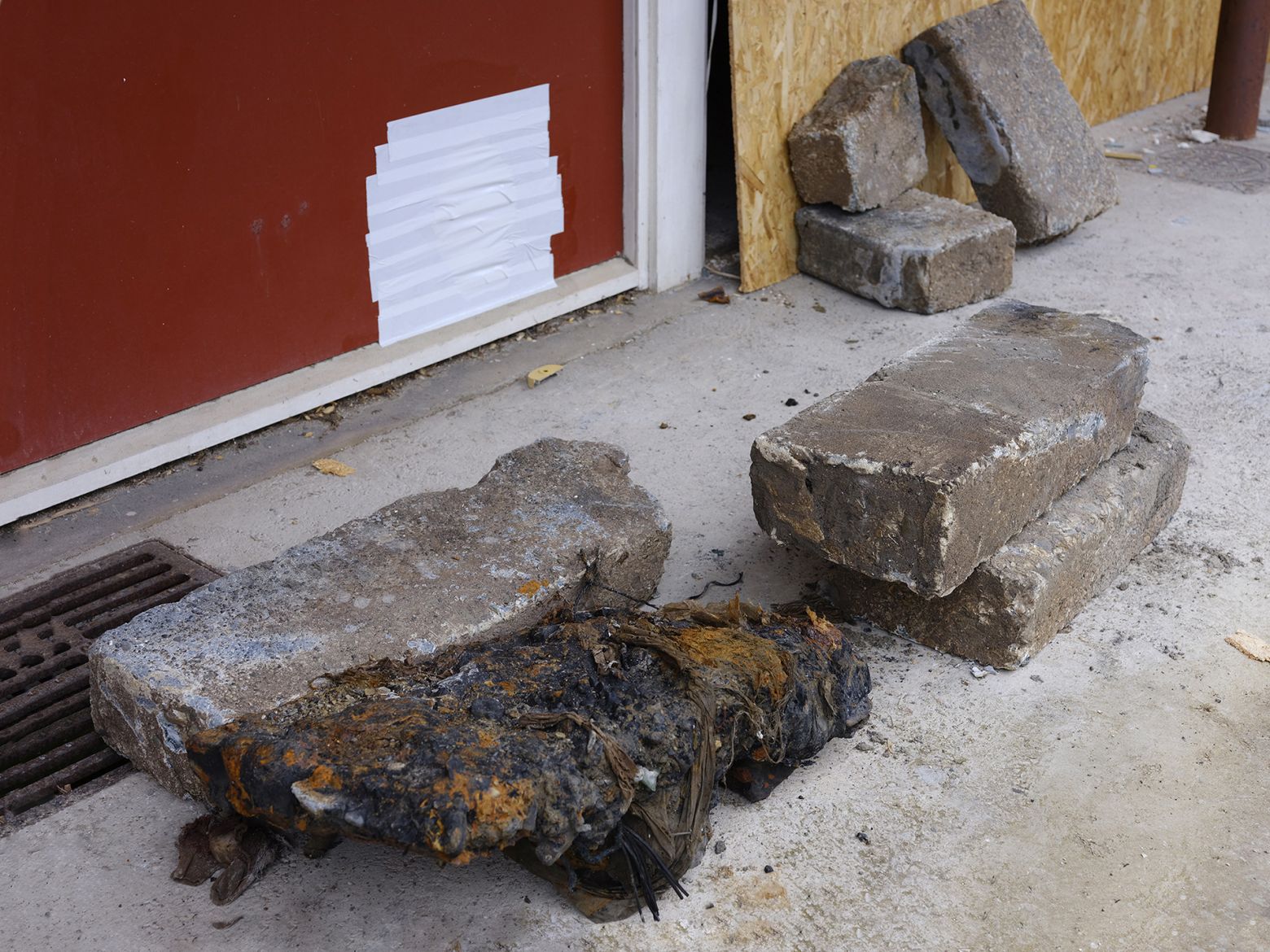 Brique fondue par le feu devant un local en désamiantage sur le port ; Cherbourg-en-Cotentin, avril 2023
