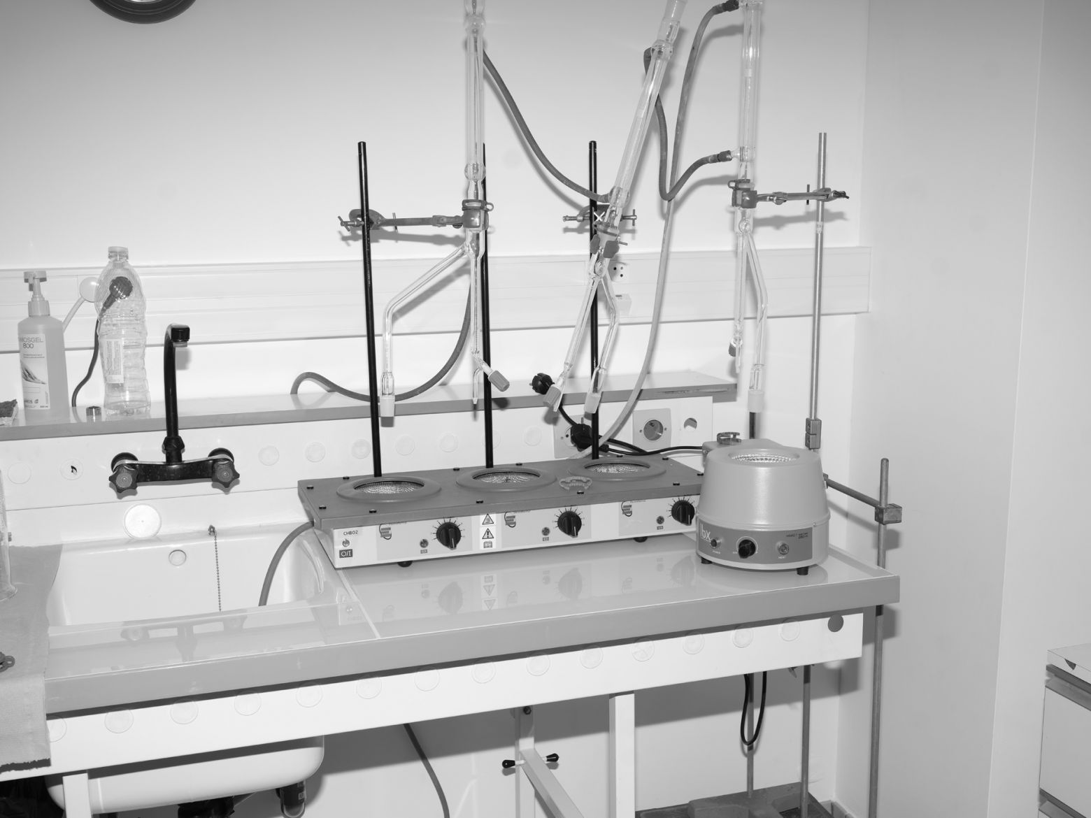 Vue d'une paillasse, laboratoire de l'ACRO (Association pour le Contrôle de la Radioactivité dans l'Ouest) ; Caen, août 2023
