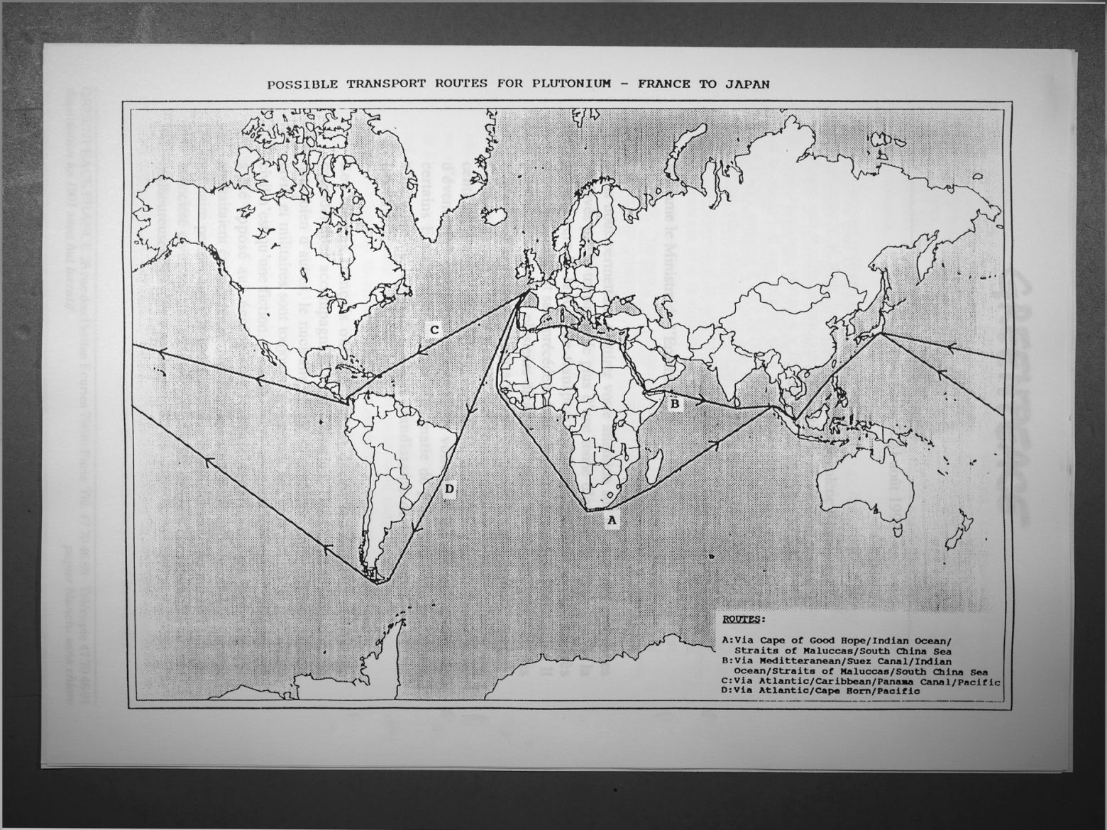 Carte des routes mondiales possibles pour le transport de plutonium France-Japon, 295 J 25, Fonds Françoise Zonabend, archives départementales de la Manche ; Saint-Lô, août 2023