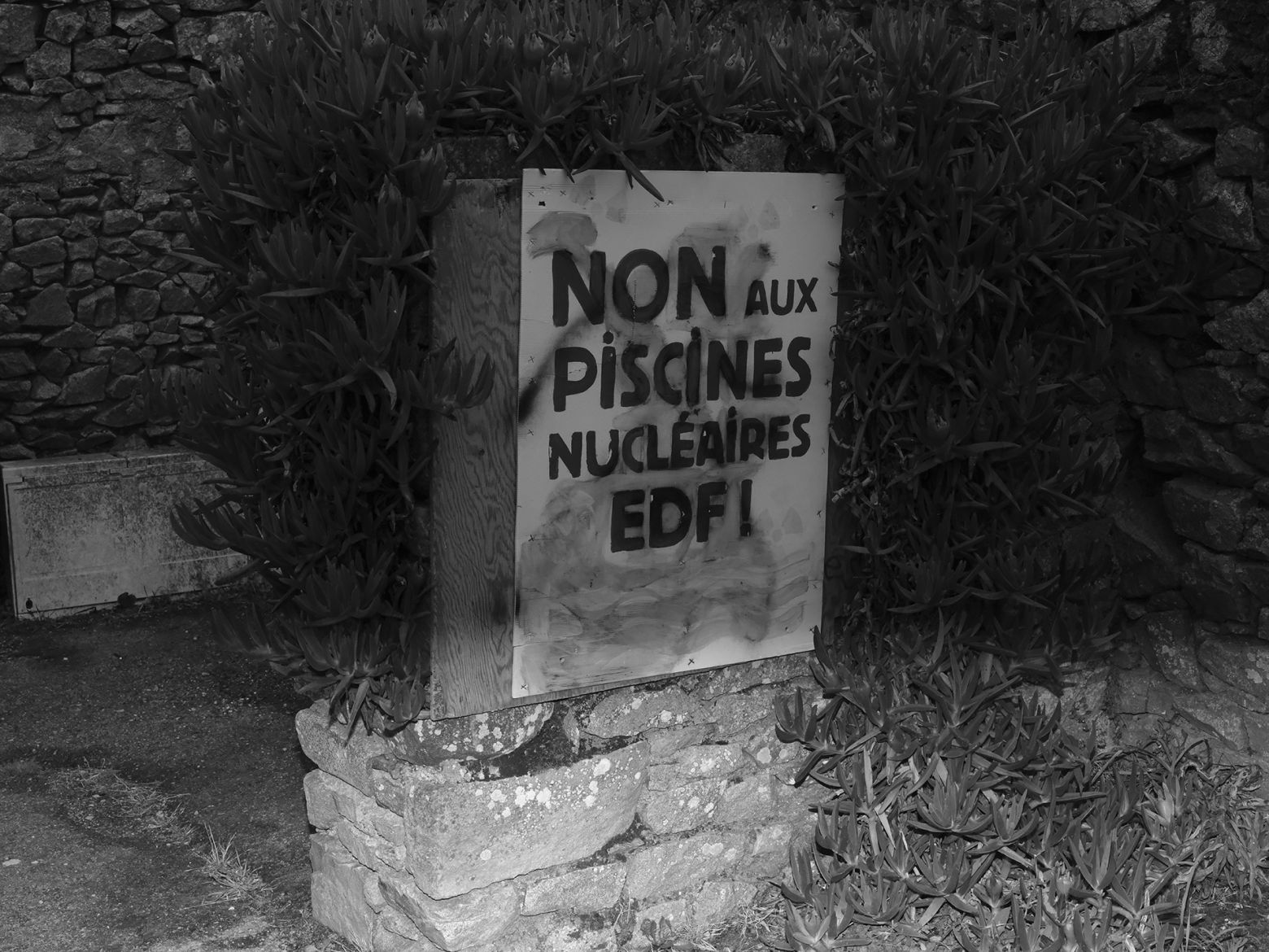 Panneau sauvage d'opposition à la construction de piscines d'entreposage de déchets radioactifs par EDF ; Omonville-la-Rogue, la Hague, août 2023