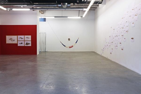 Garde à vous, hamac en corde ; Autoportrait 1, pyrograveur sur papier, 65 x 50 cm
