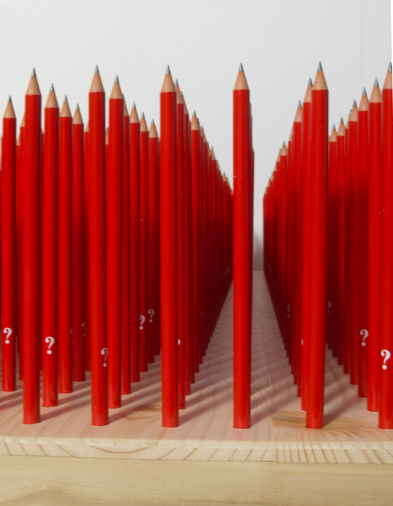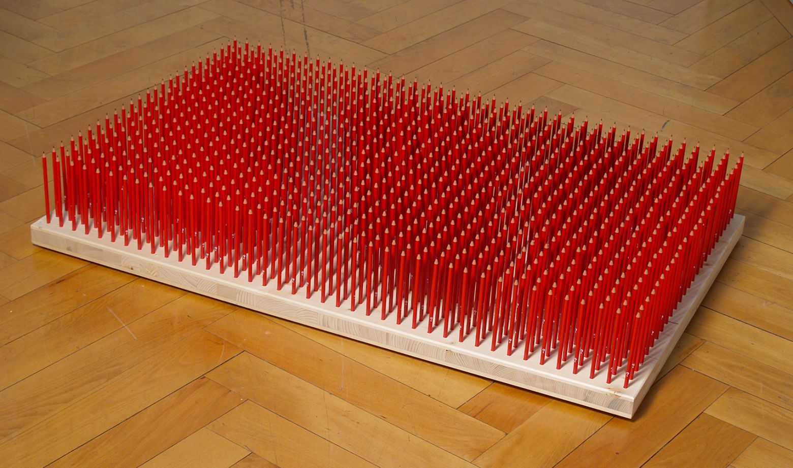 Un millier de crayons à papier, tous également taillés, ont été enfoncés avec la froide régularité d'une machine, dans une épaisse planche de bois. L'ensemble évoque sans détour la planche du fakir. En observant l'œuvre de plus près, on s'aperçoit que tous les crayons portent discrètement la même inscription : un point d'interrogation. "Que faire ?" est une interrogation cruciale et parfois douloureuse pour un artiste.