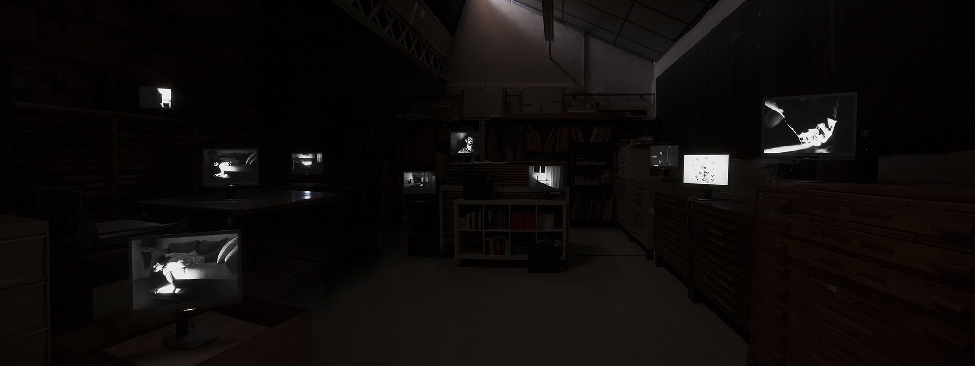 Série de 60 vidéos HD d’environ 1’, boucle aléatoire, noir et blanc, installation variable