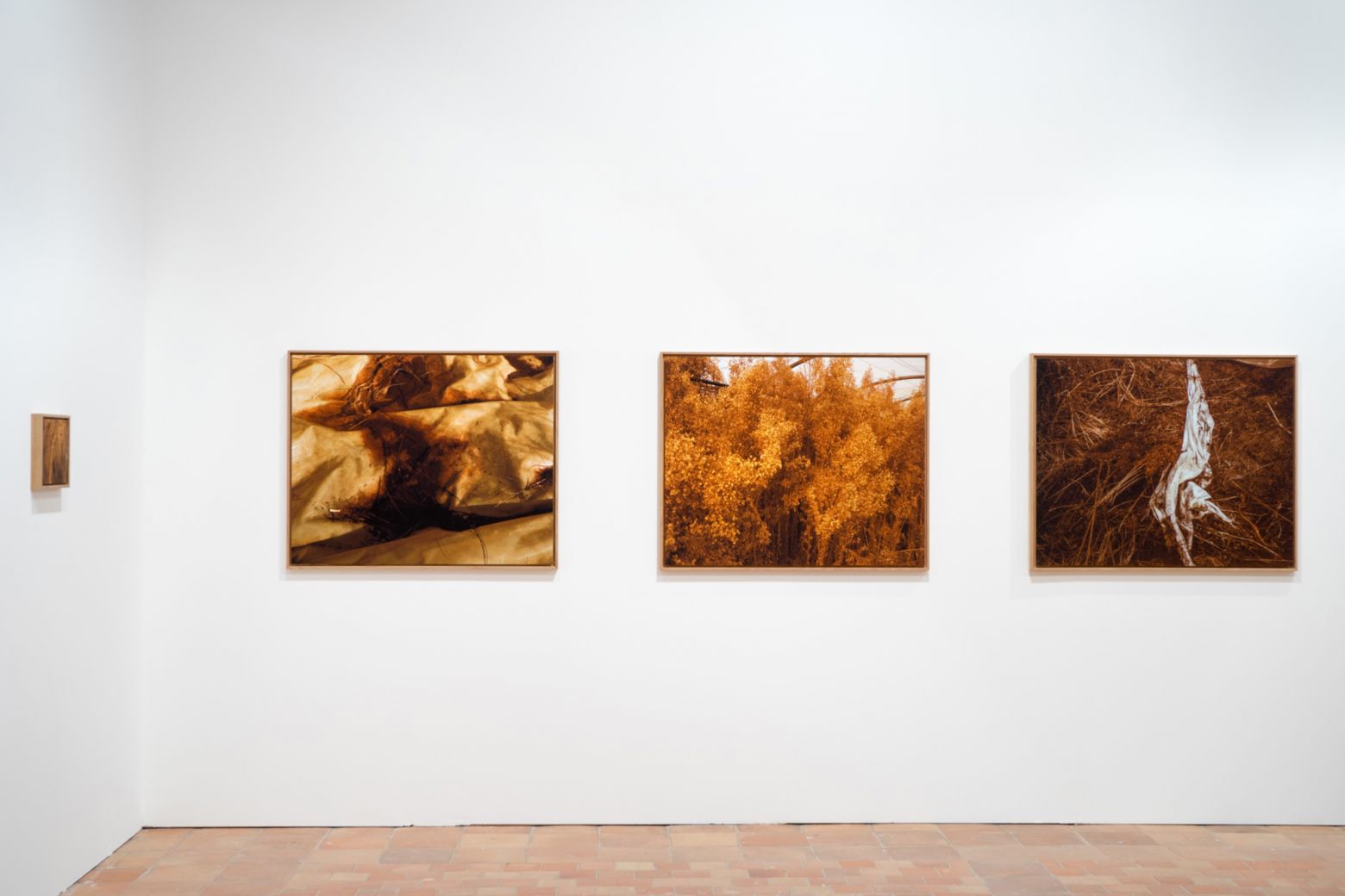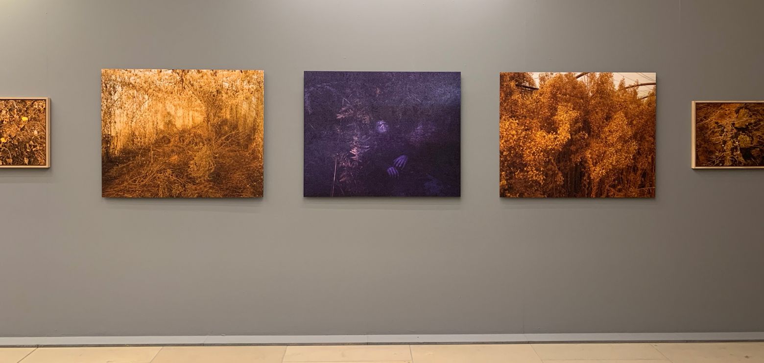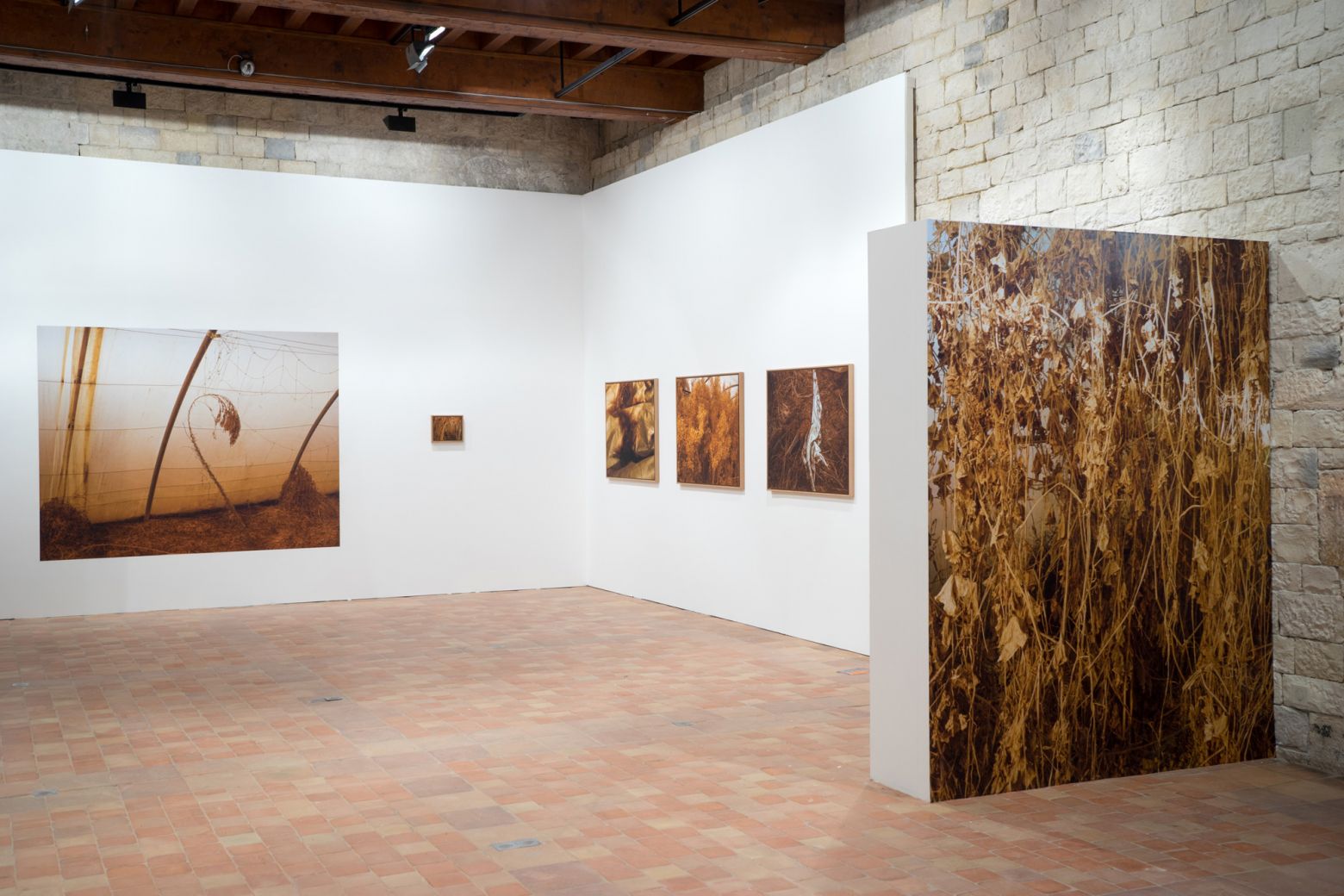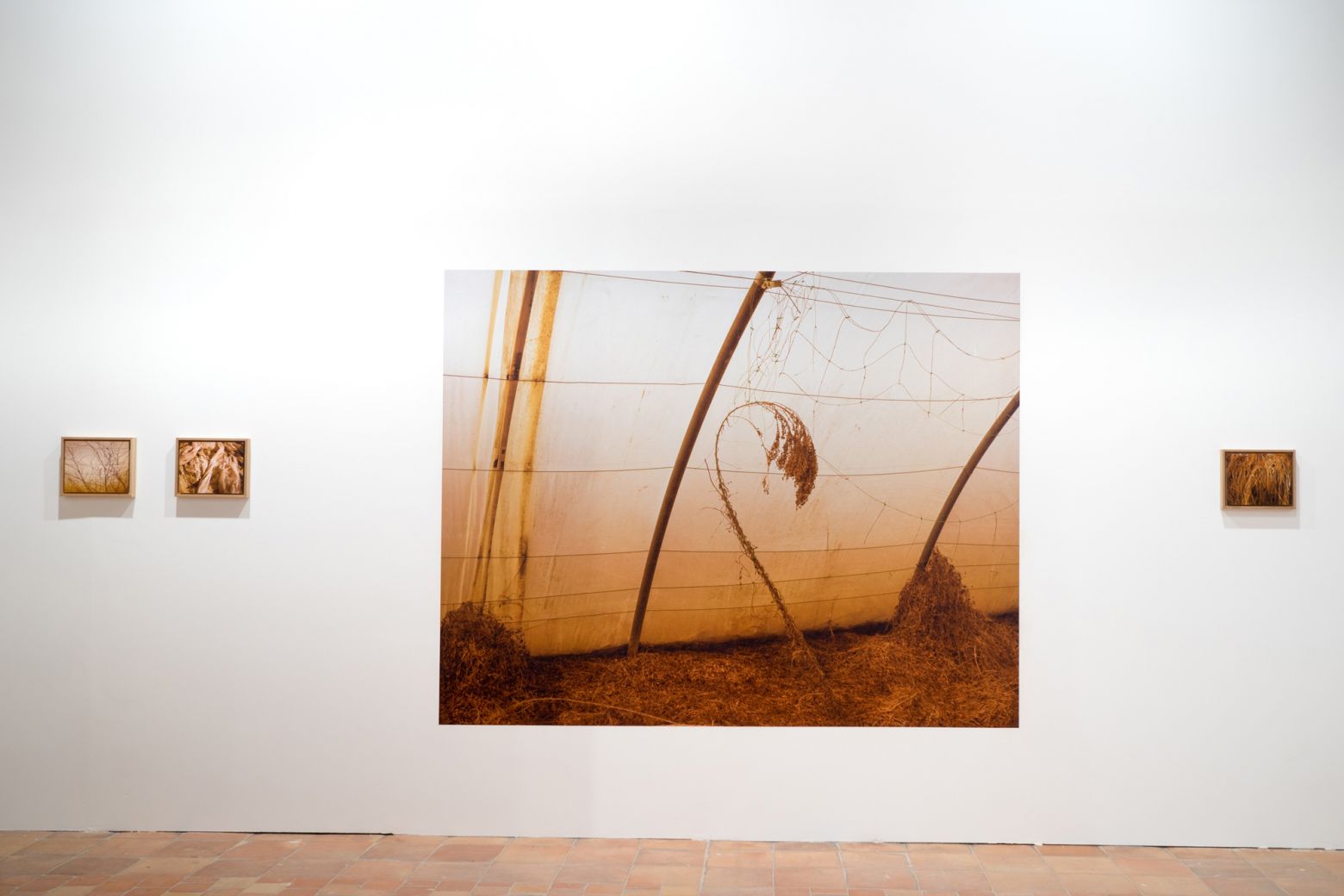 "Eldorado déploie les serres familiales envahies par une végétation luxuriante originaire de l'hémisphère sud, sèche, brûlée sur des hectares. Le lieu connu durant l'enfance, abandonné plusieurs fois, connaît différentes périodes de faste et de déclin. L'espace prend de l'ampleur. Les serres se multiplient. Quelque chose, de l'ordre du phénomène de l'éclosion d'une chrysalide, apparaît. [...] Ici, l'imaginaire de l'île s'ouvre sur une nature sauvage, hostile et spontanée. Des monochromes où se côtoient la flore épaisse d'une pépinière à l'abandon." [...] Marine Lanier
