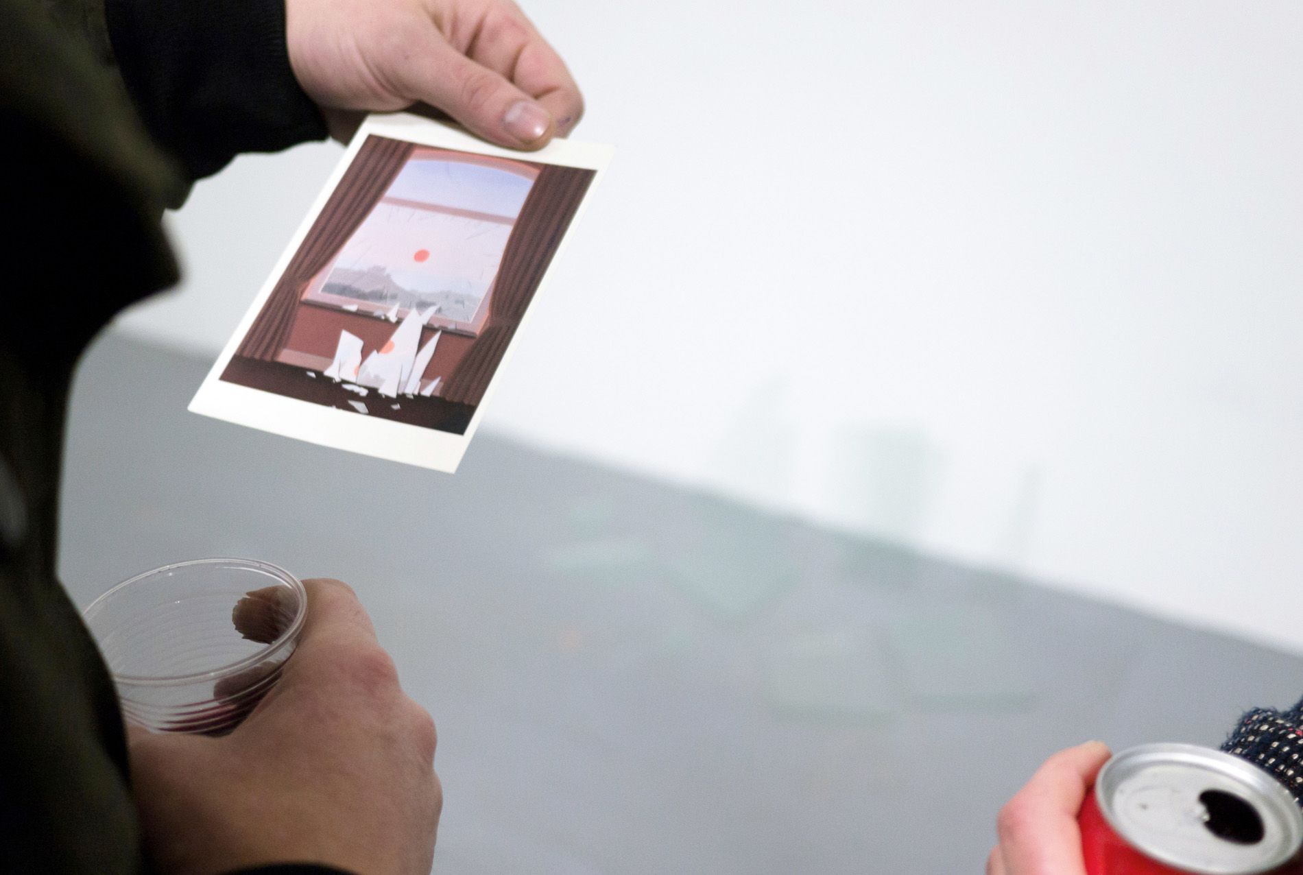 Ensemble de 10 morceaux de verre découpés sur mesure et pointe de gouache orangée, en écho à la verrière brisée du lieu et au tableau Le soir qui tombe de René Magritte dont la reproduction sur carte postale a circulé de main en main le soir du vernissage.