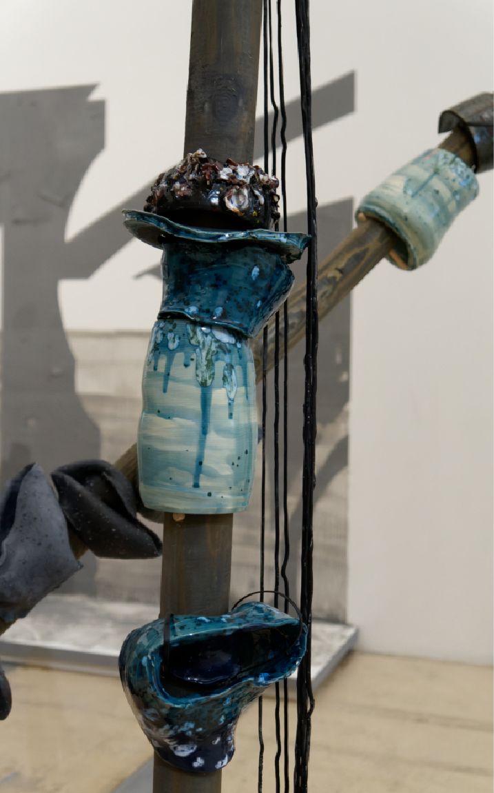 Faïence émaillée et bois OSB, encre de Chine, corde, dimensions variables