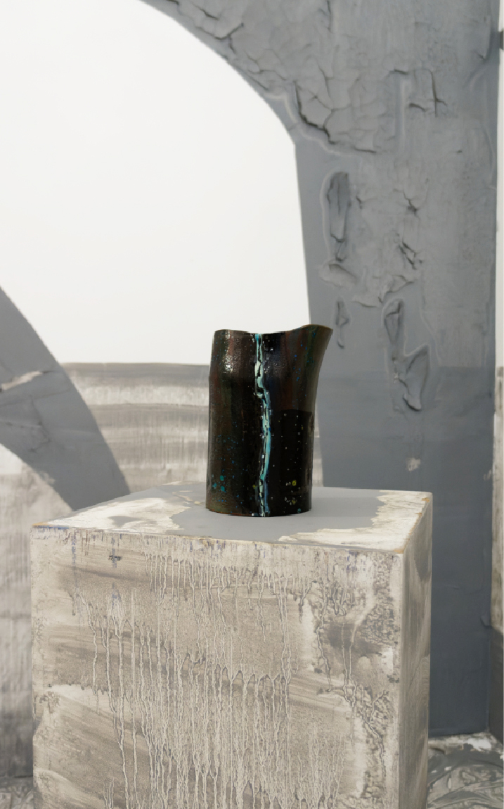 "Dans une translation entre volume et deux dimensions, Matt Coco présente Fantôme, partition des fonds, 2021. L'artiste applique de l'argile liquide à même le mur. La matière, poussée jusqu'à son point de résistance, sèche et s'effrite, le matériau craquelle, la peau du mur s'écaille. Cette œuvre est expérimentée pour la première fois en Corée en 2018, où certaines maisons traditionnelles sont construites et décorées avec l'argile. À Aubagne, la source présente sous la chapelle semble être montée et avoir rattrapé les arches dont les ombres se sont posées sur les murs. En évolution permanente, la composition picturale se transforme pendant l'exposition, la matière tombée au sol laisse apparaître ce qui se cache derrière la surface du mur : sa structure et les couches successives de peinture." - Magalie Meunier, extrait de Empreintes accordées, Les mondes engloutis, catalogue de l'exposition, 2022
