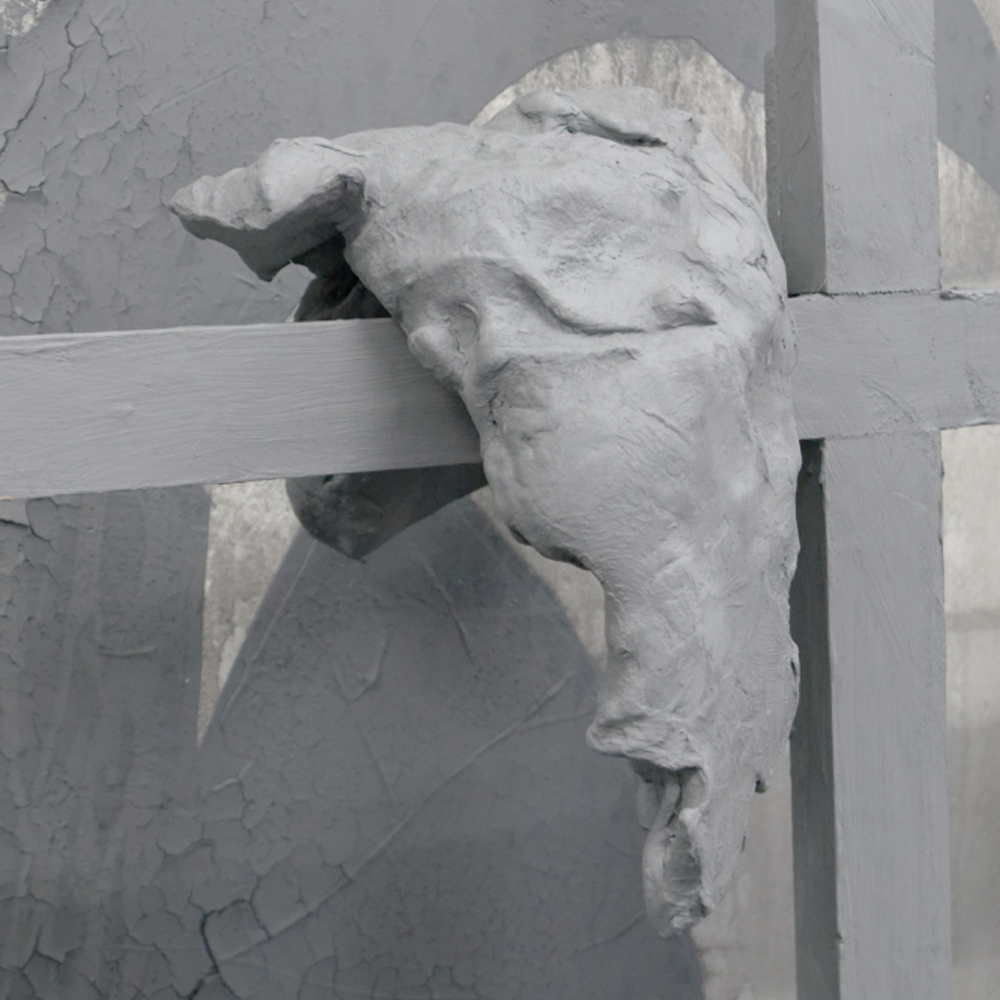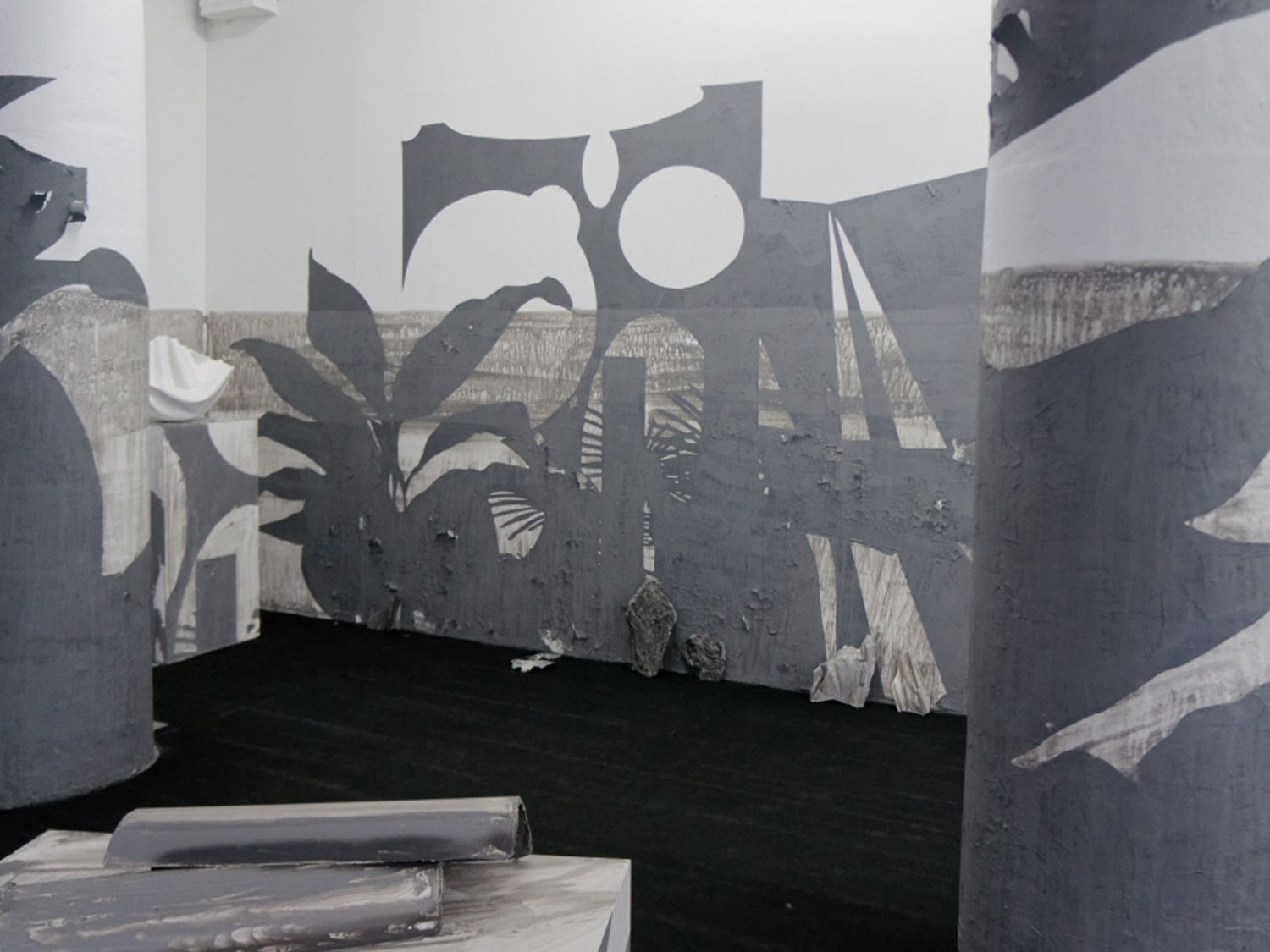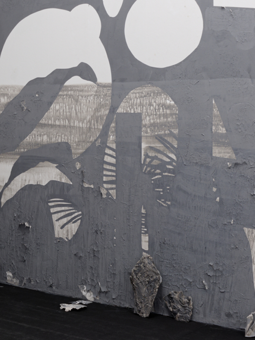 Argile sur mur, encre de Chine et objets divers, dimensions variables