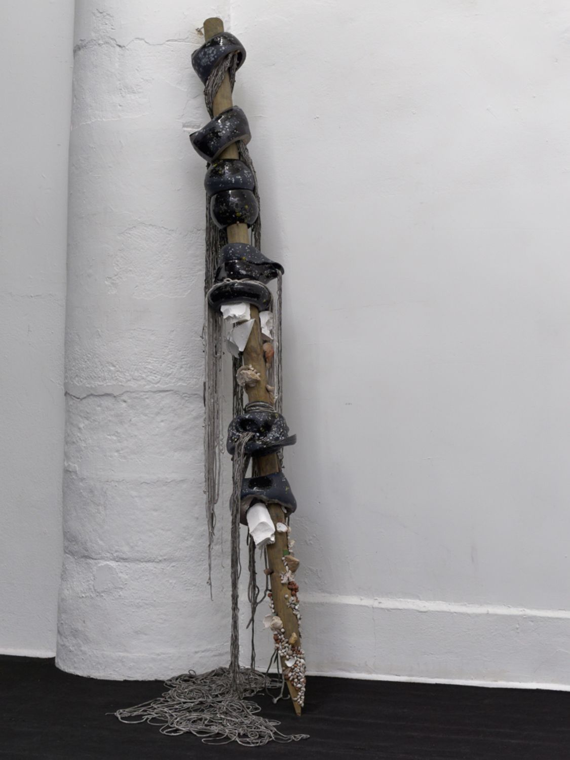 Faïences émaillées sur poteaux en pin, silicone, coquillages et alginate, hauteur : 2m