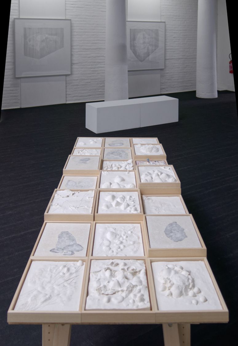 Installation de 14 empreintes sur plâtre et 6 dessins sur papier coréen, 30 boîtes américaines, dimensions variables