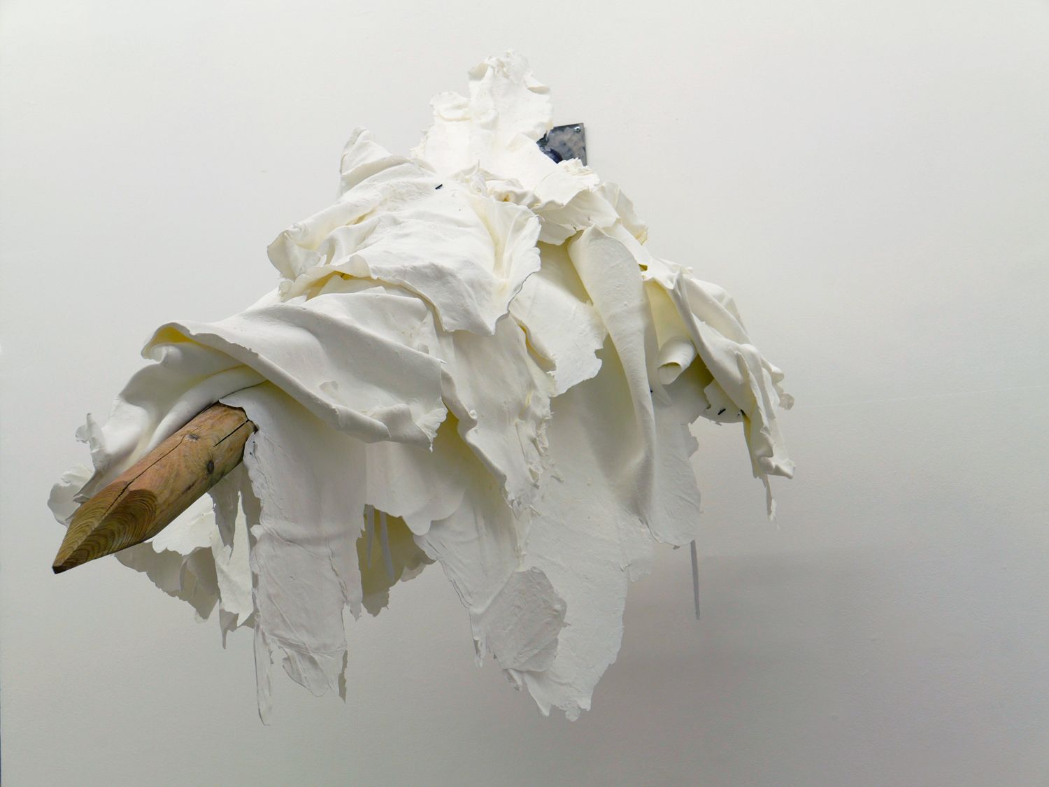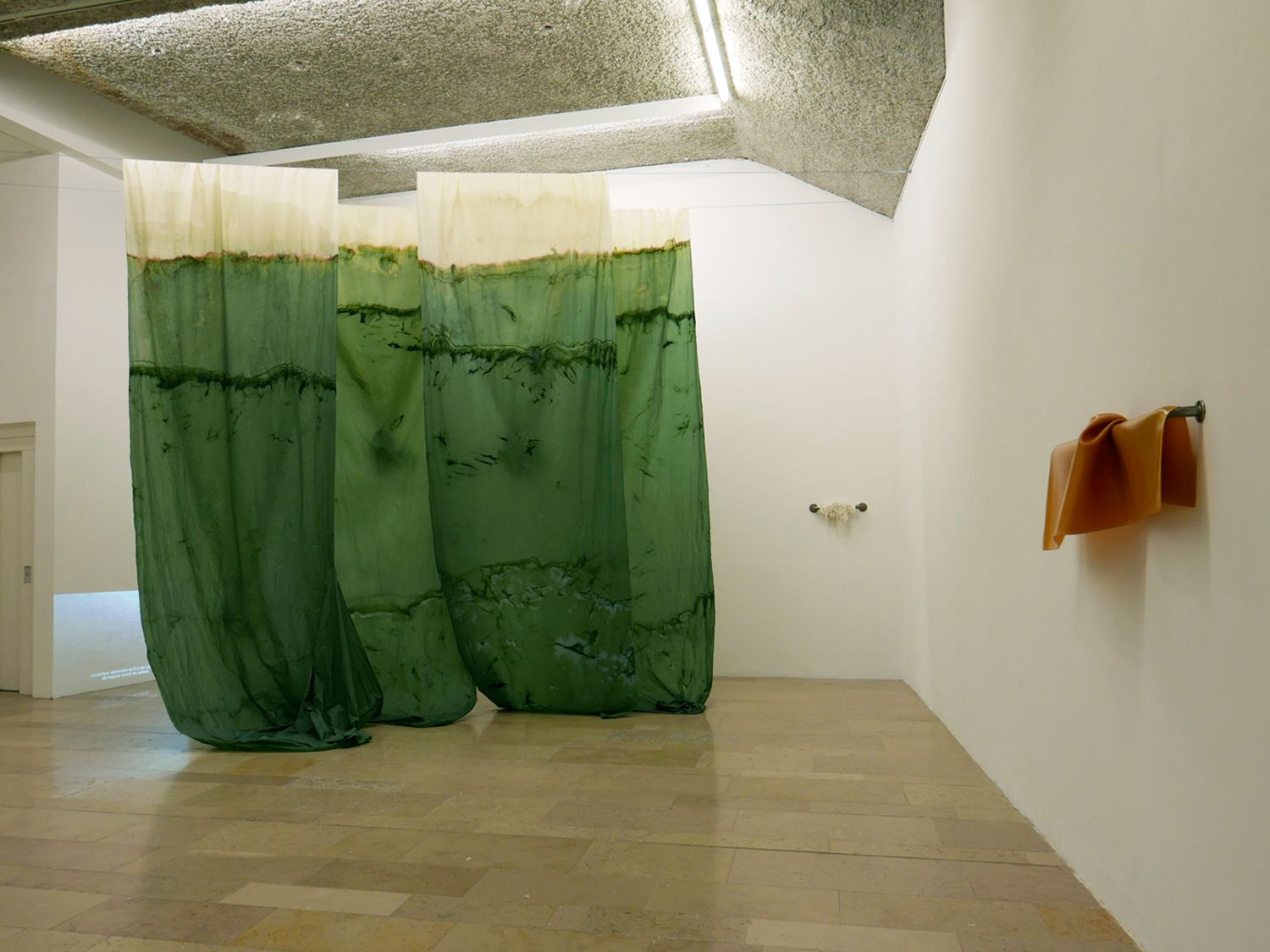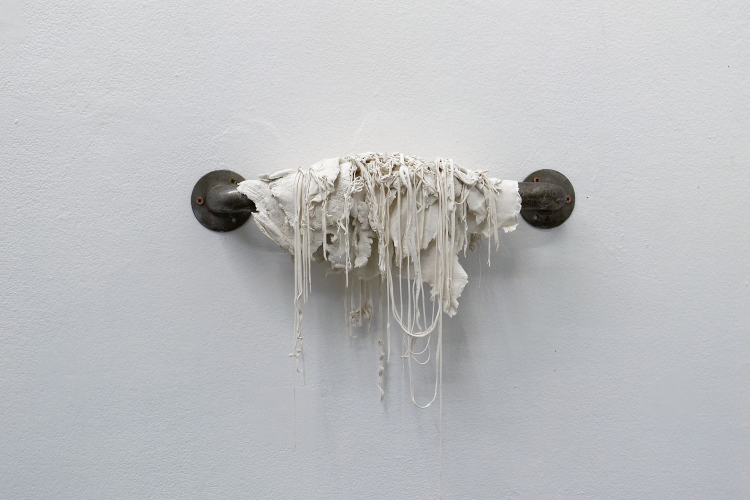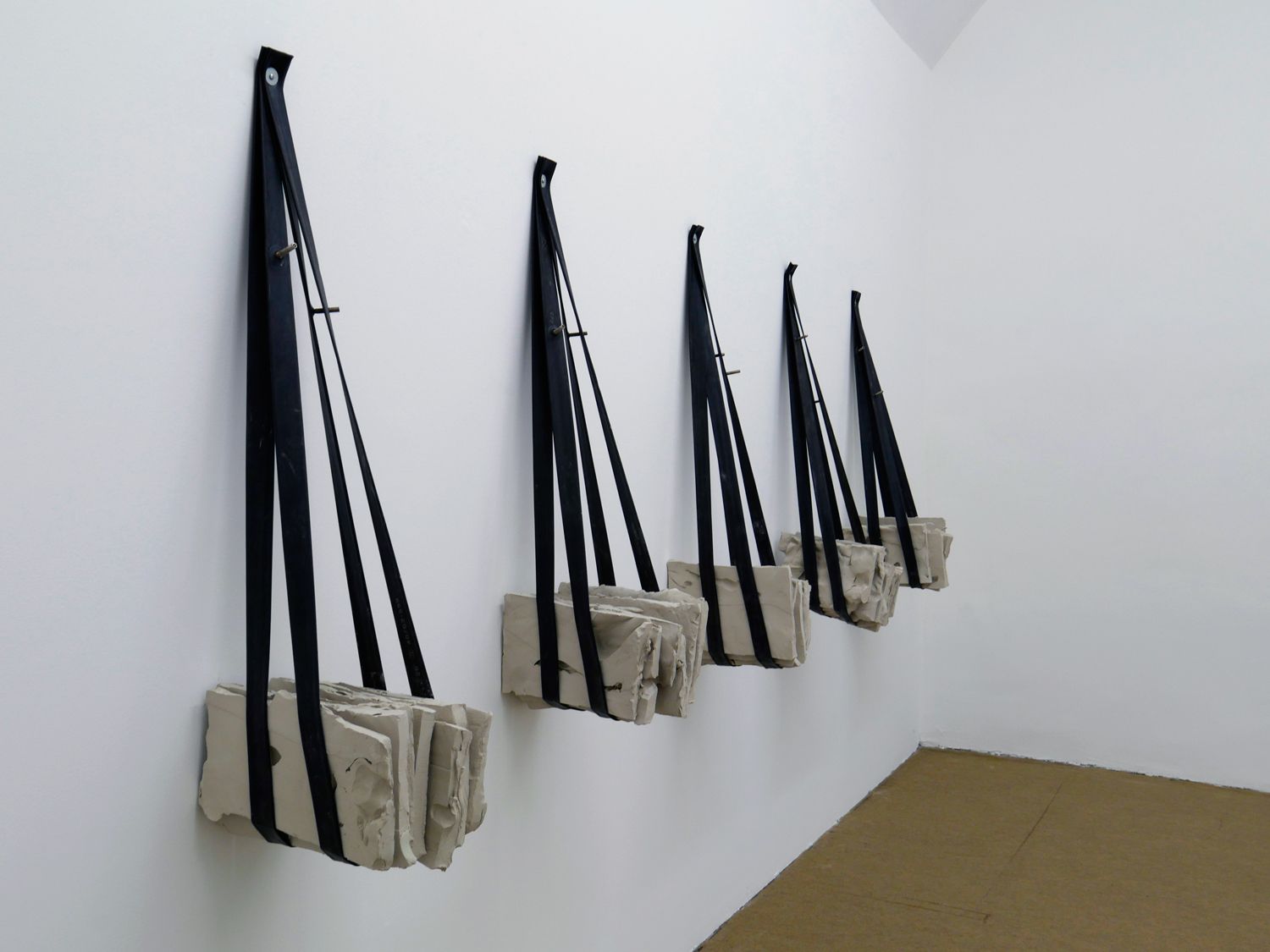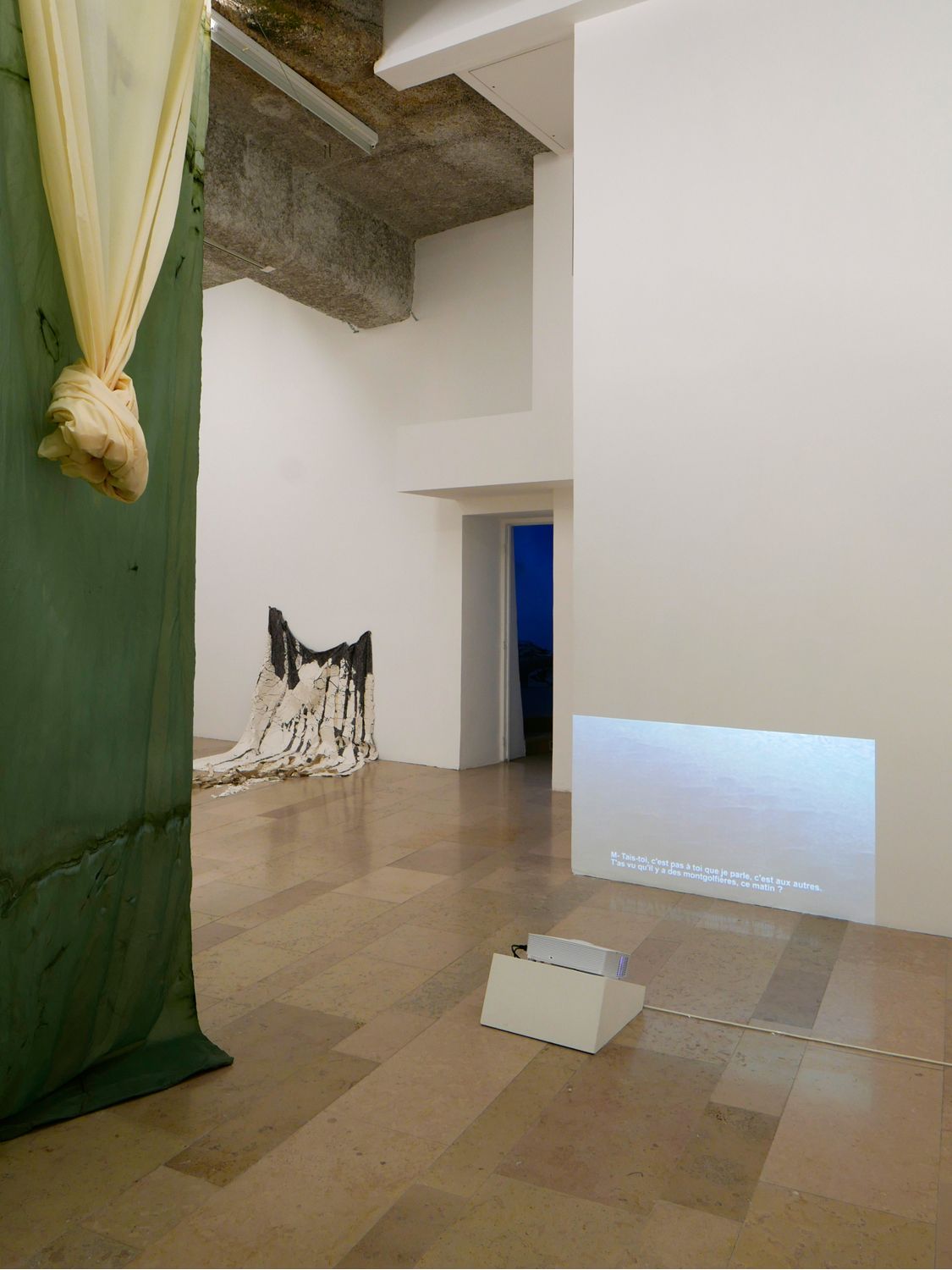 À droite : La chambre, couverture, céramique, sangles, 2017