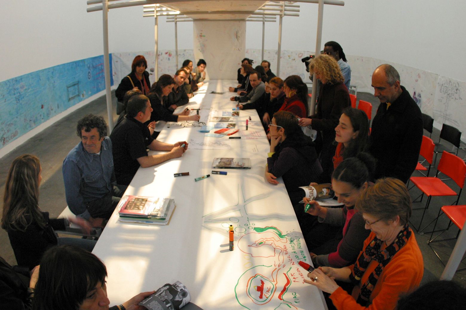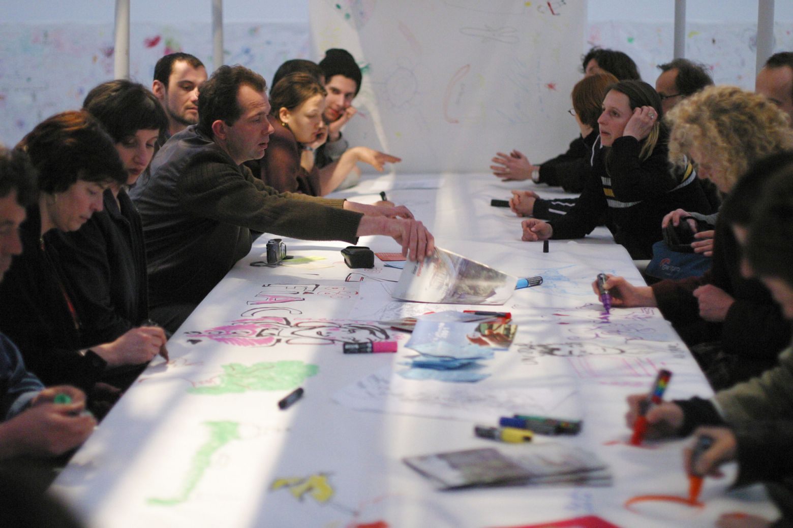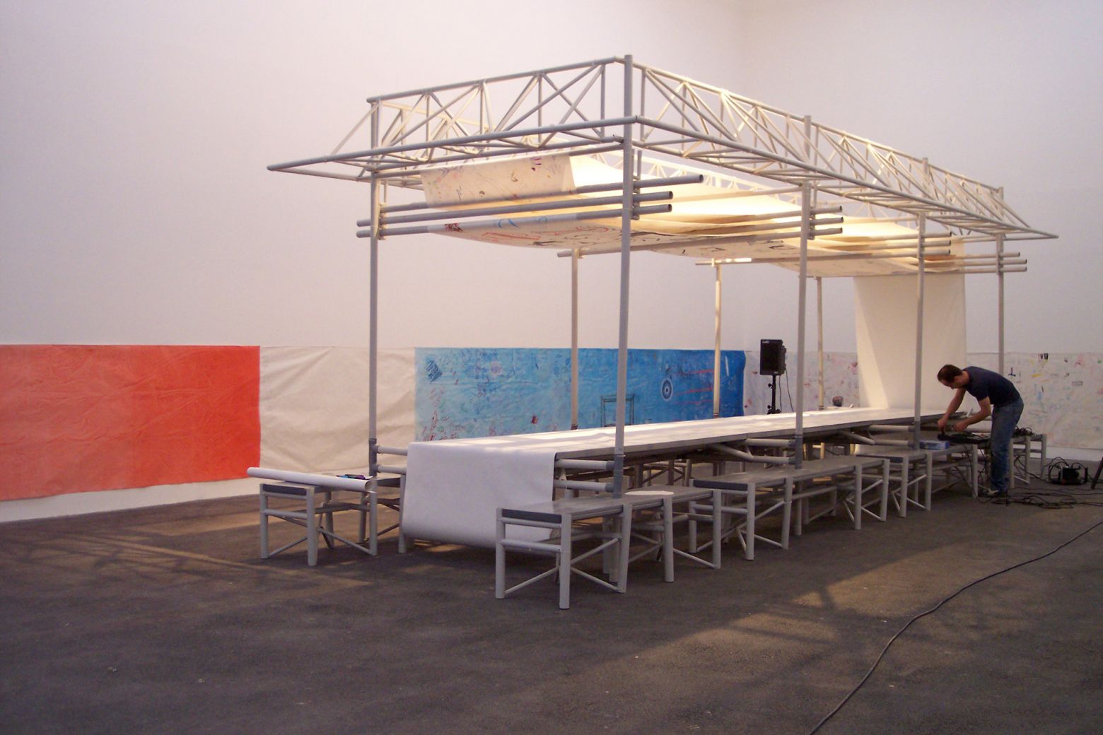 Cette installation est composée d'une table en PVC équipée de bancs. On peut s'y asseoir, écrire sur la nappe de papier qui la recouvre et s'enroule sur elle-même pour constituer un faux plafond. Une collection de portraits dessinés à la craie sur des tableaux noirs forme une frise autour de la salle.