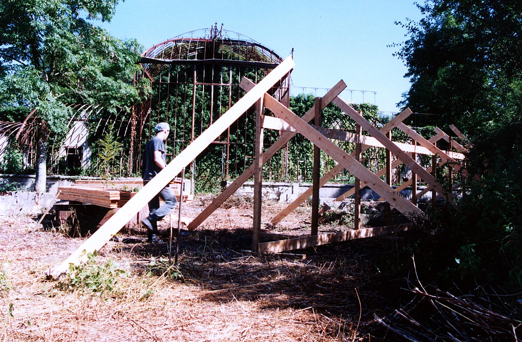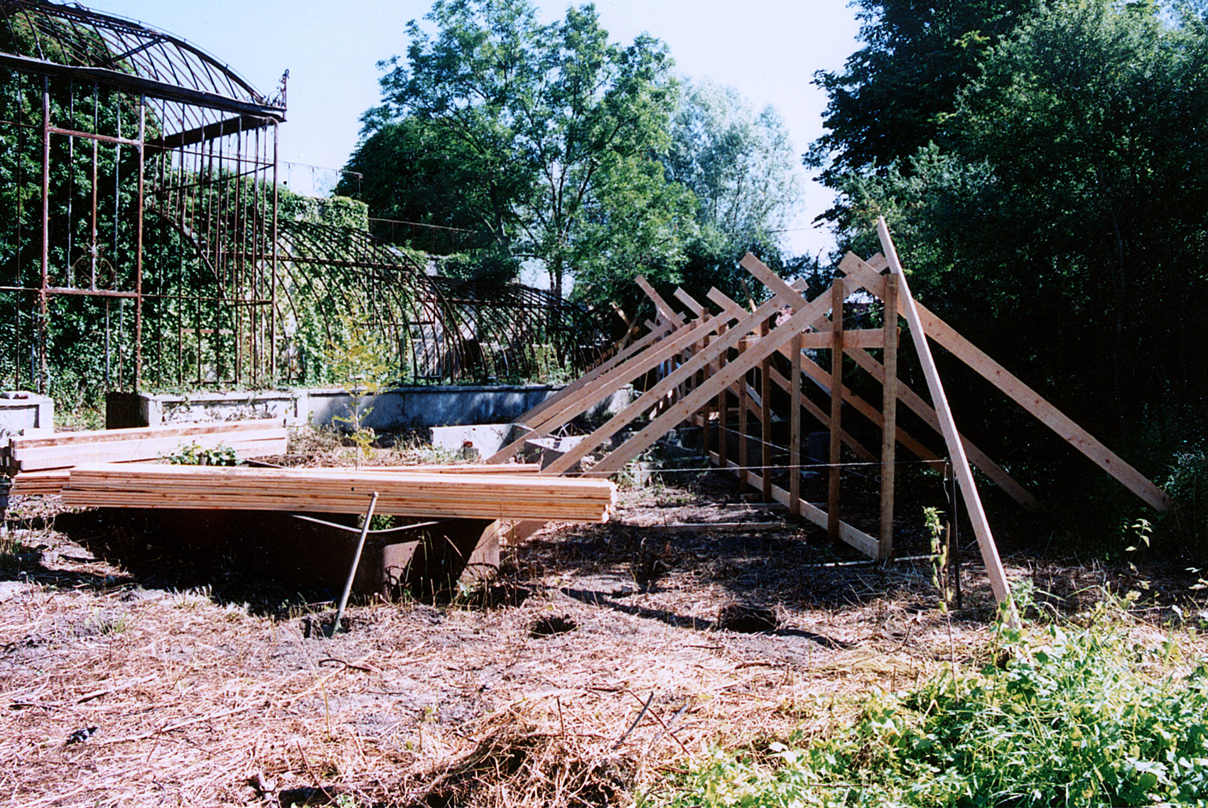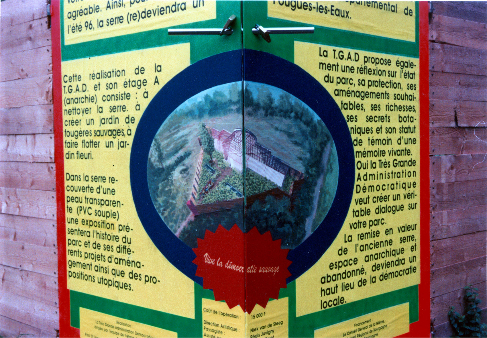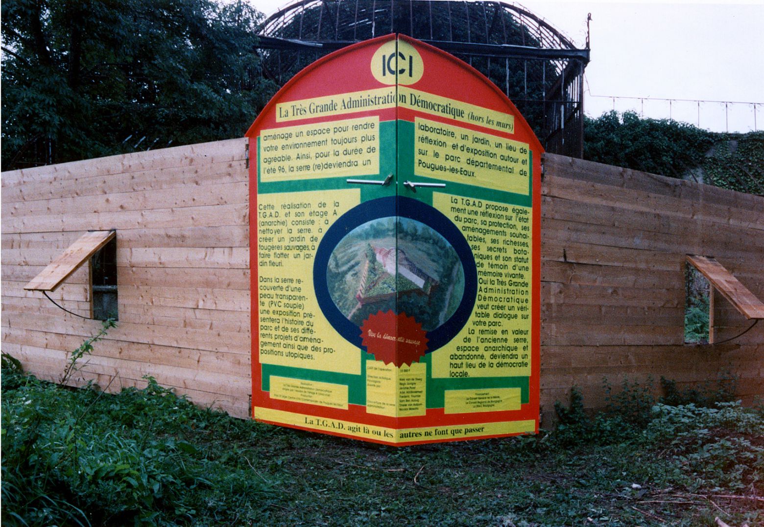 Cette réalisation de la T.G.A.D. et de son étage A (anarchie) consiste à nettoyer la serre, à créer un jardin de fougères sauvages, à faire flotter un jardin fleuri.