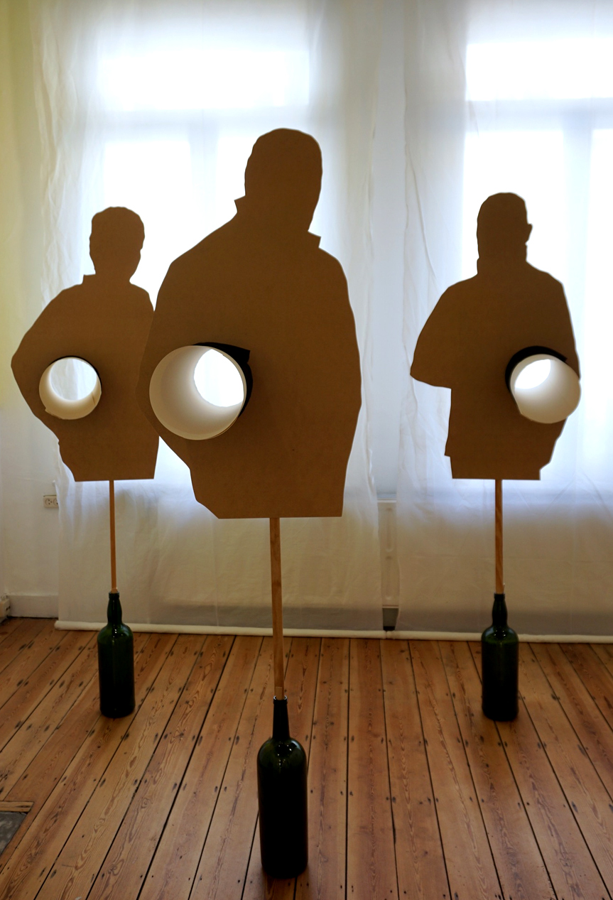 Les silhouettes, installation, bois, papier, bouteille, feutrine, 2017