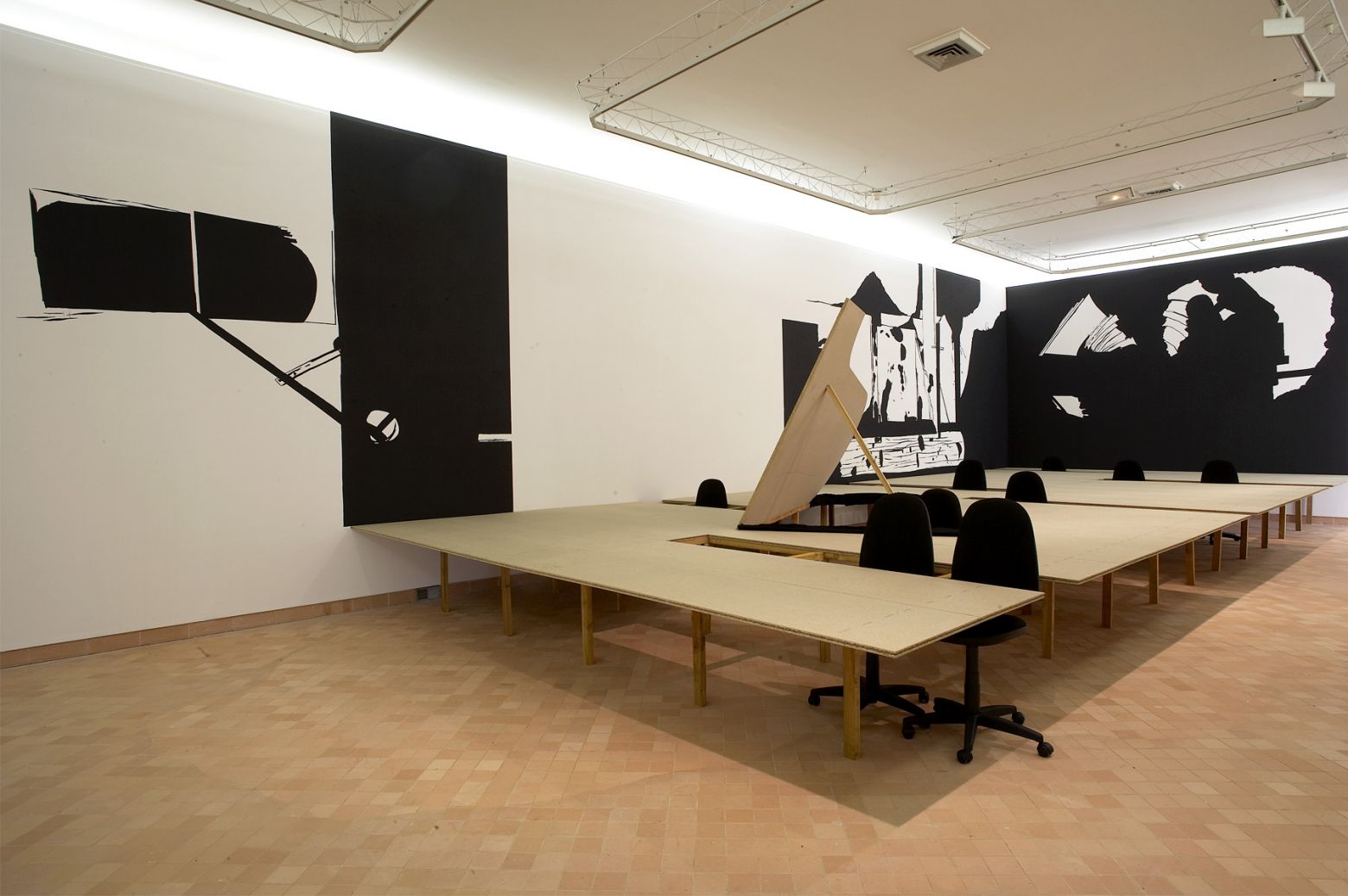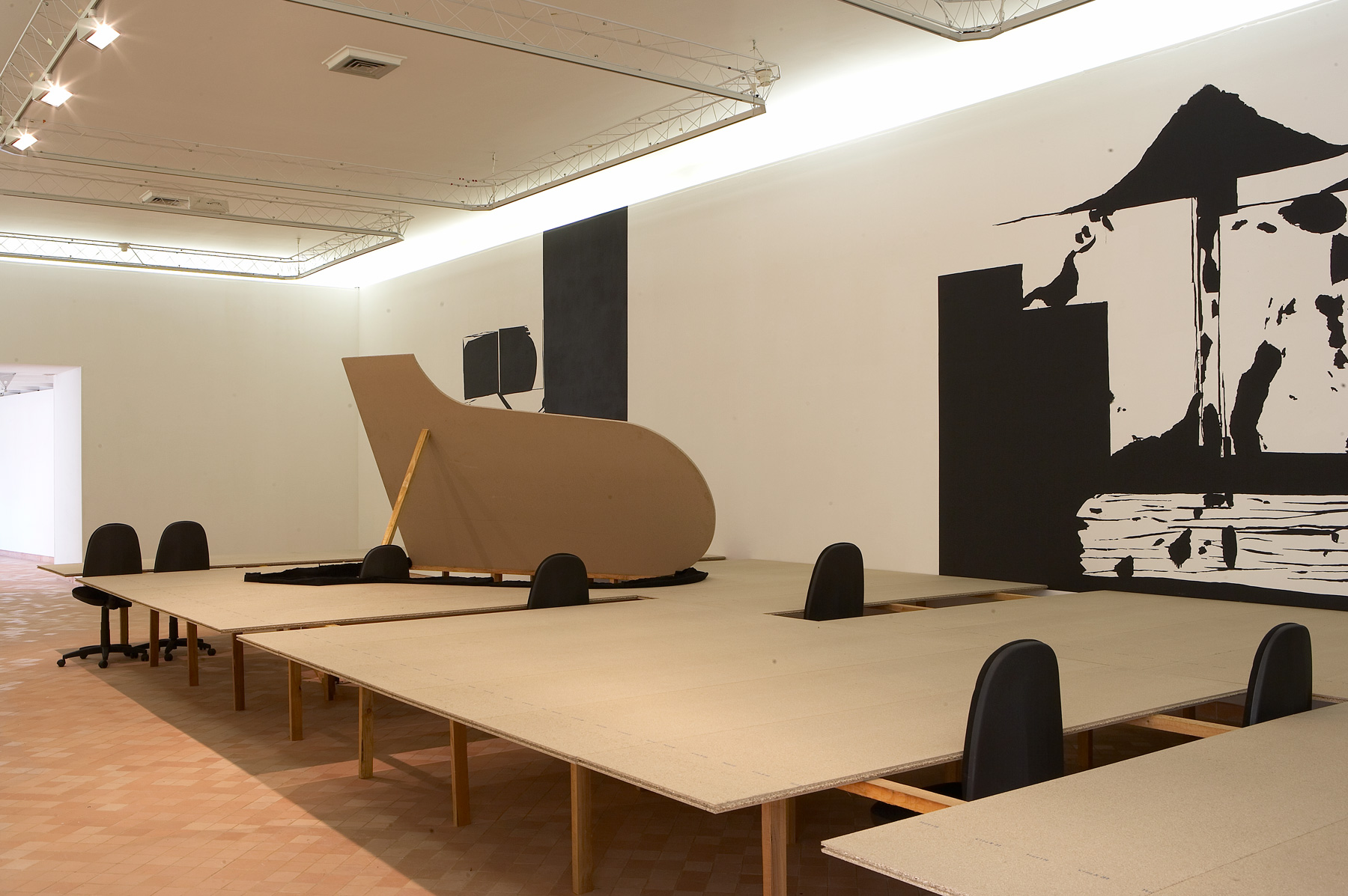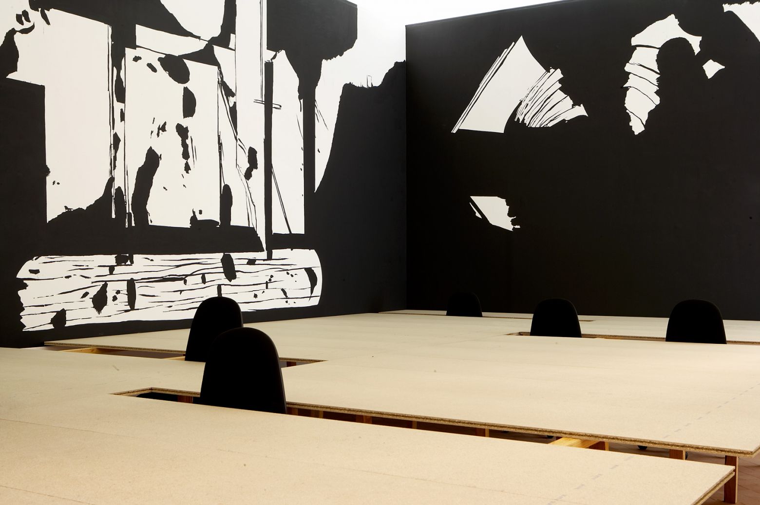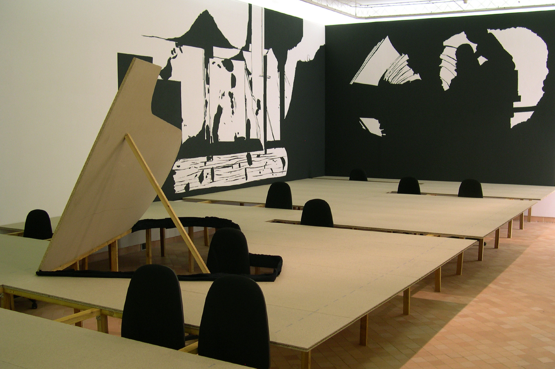 Peintures murales, installation, bois, chaises, parpaings, feuille, sérigraphie