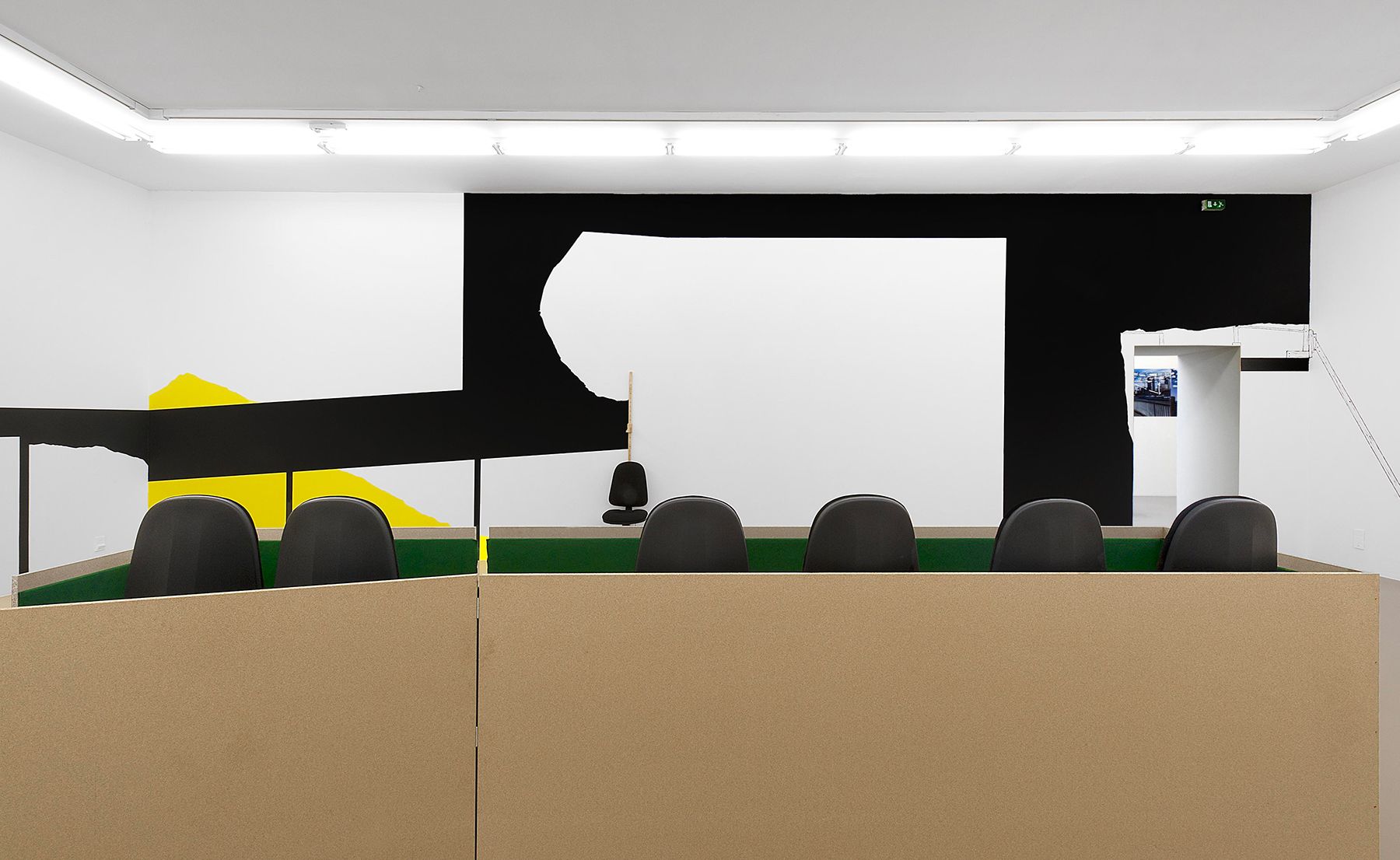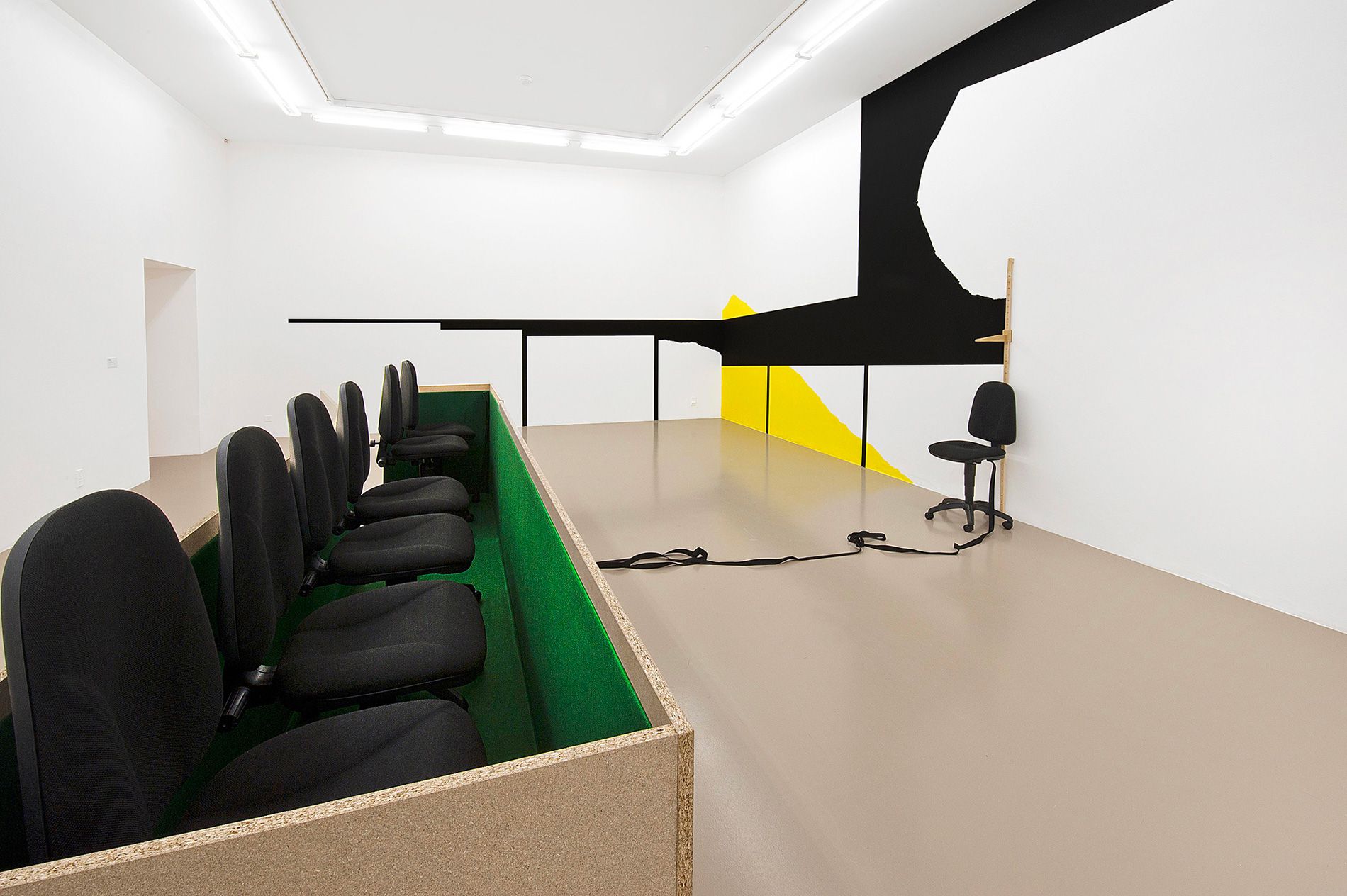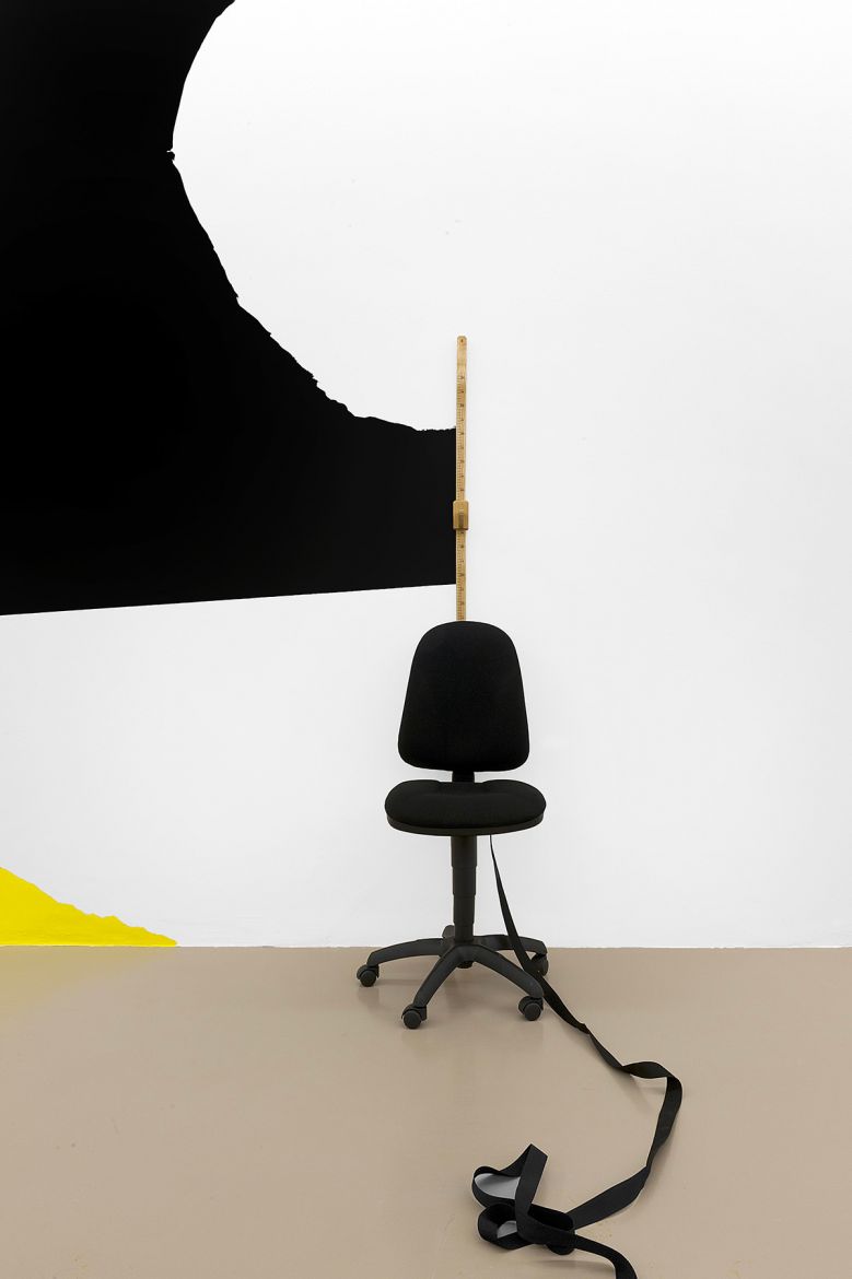 Bois, chaises de bureau, peinture, feutrine, sangle, toise