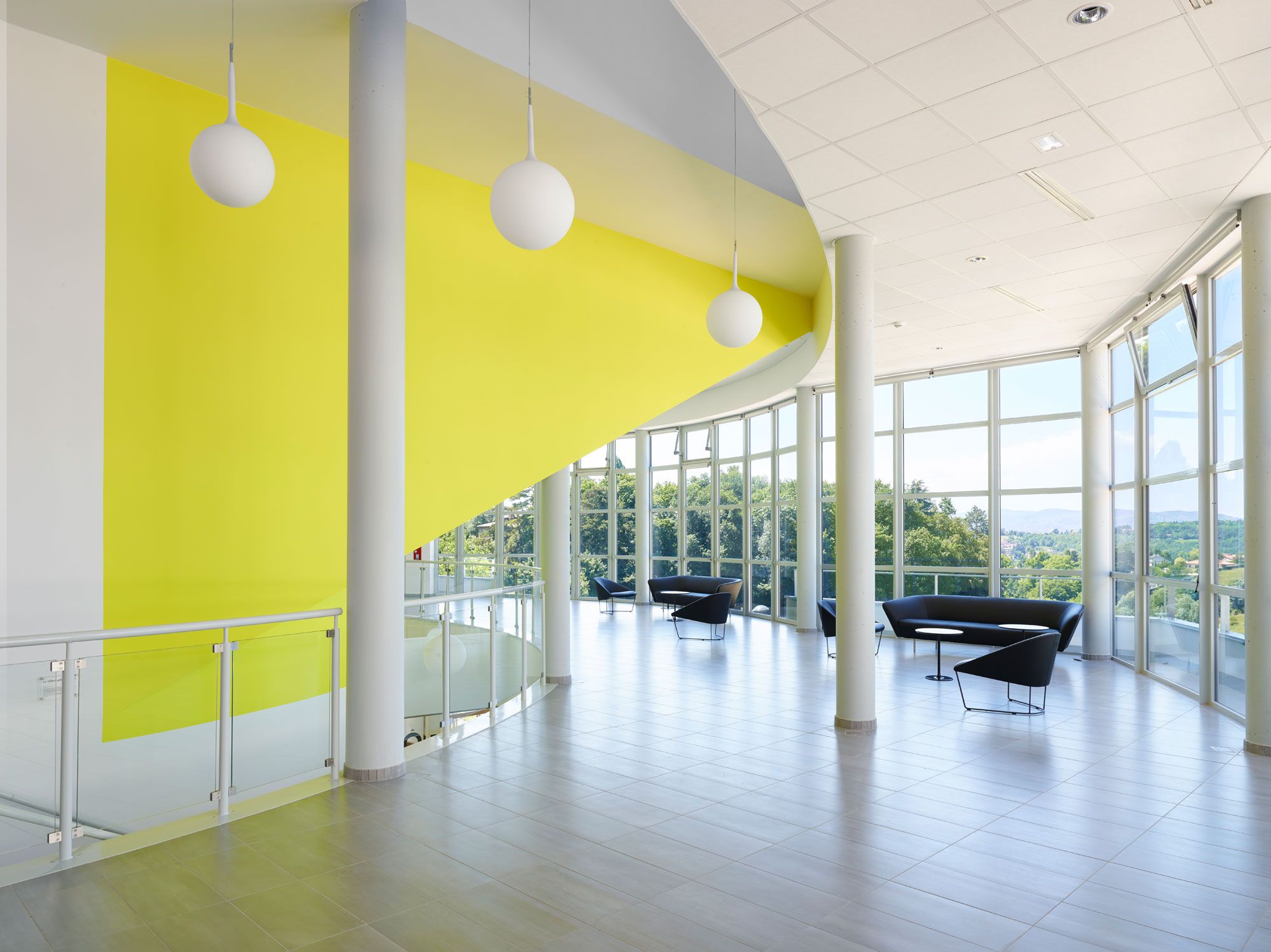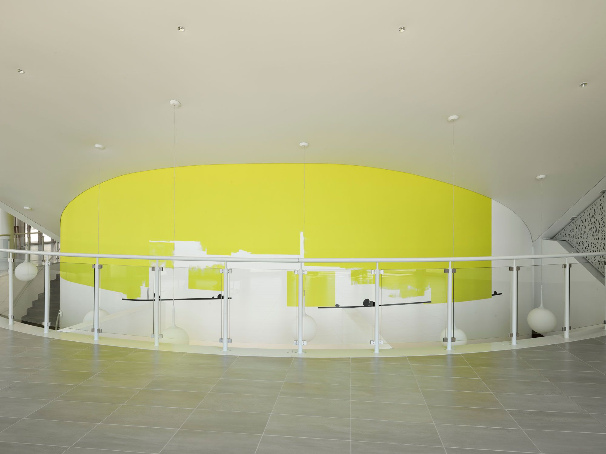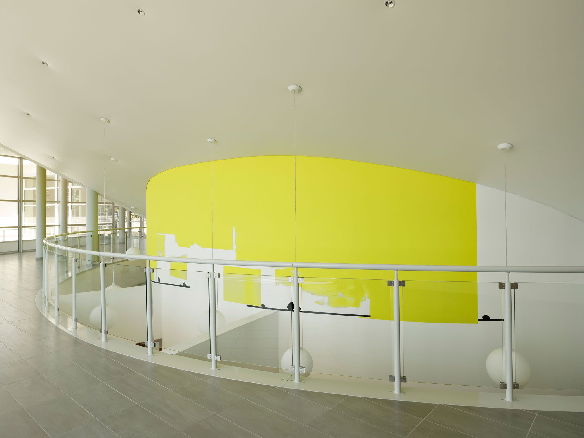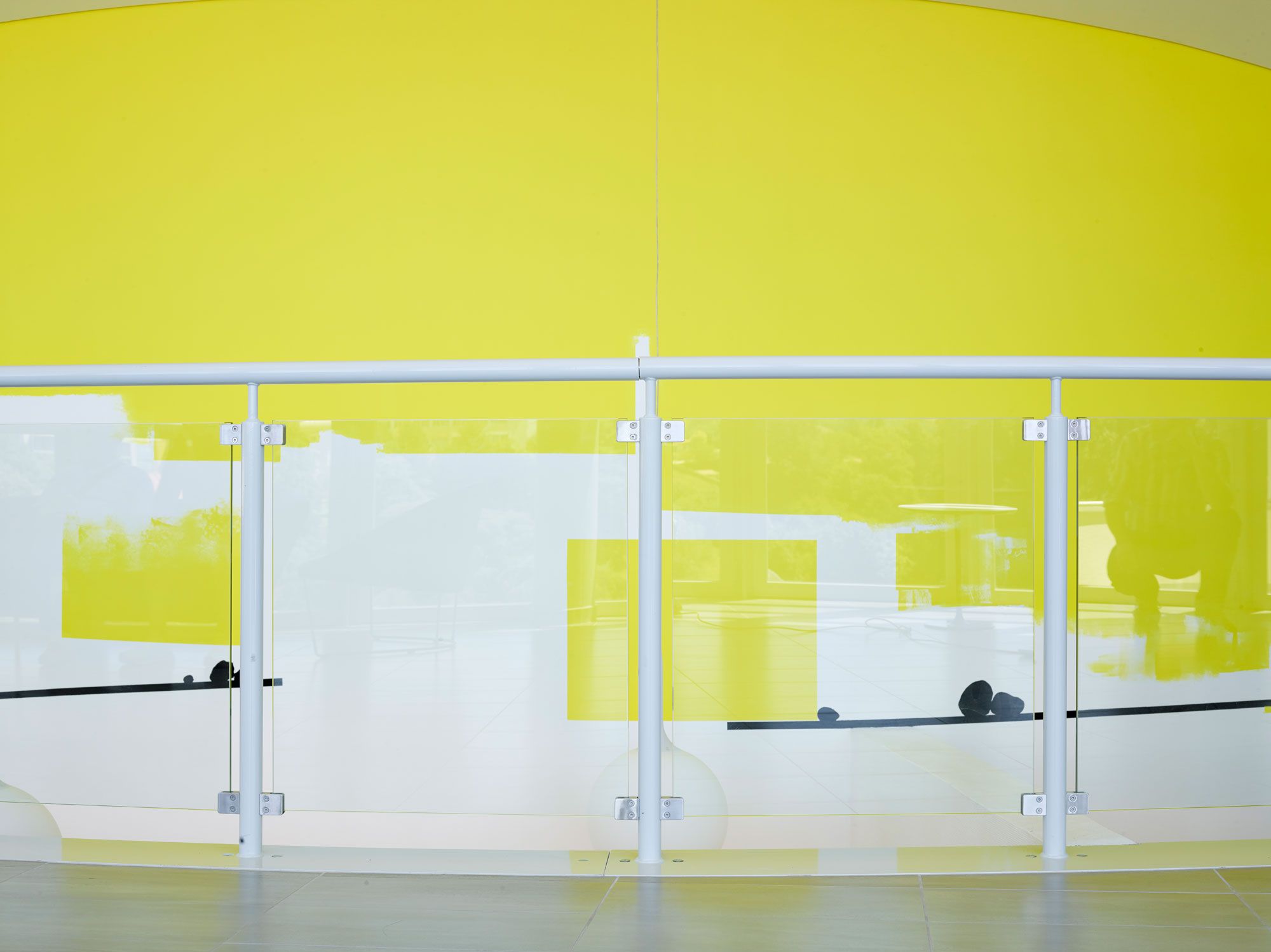 C’est d’abord une couleur, un jaune lumineux, qui vient s’encastrer dans le bâtiment pour en révéler l’ampleur des volumes. Dans un deuxième temps, un autre espace se découvre. Face au paysage, le long de la balustrade, la masse de couleur pose en équilibre la fragilité de ses contours. Deux baguettes et quelques cailloux assurent le contrepoids des vides de l’architecture, nous renvoyant à notre propre mesure, celle de nos pas.