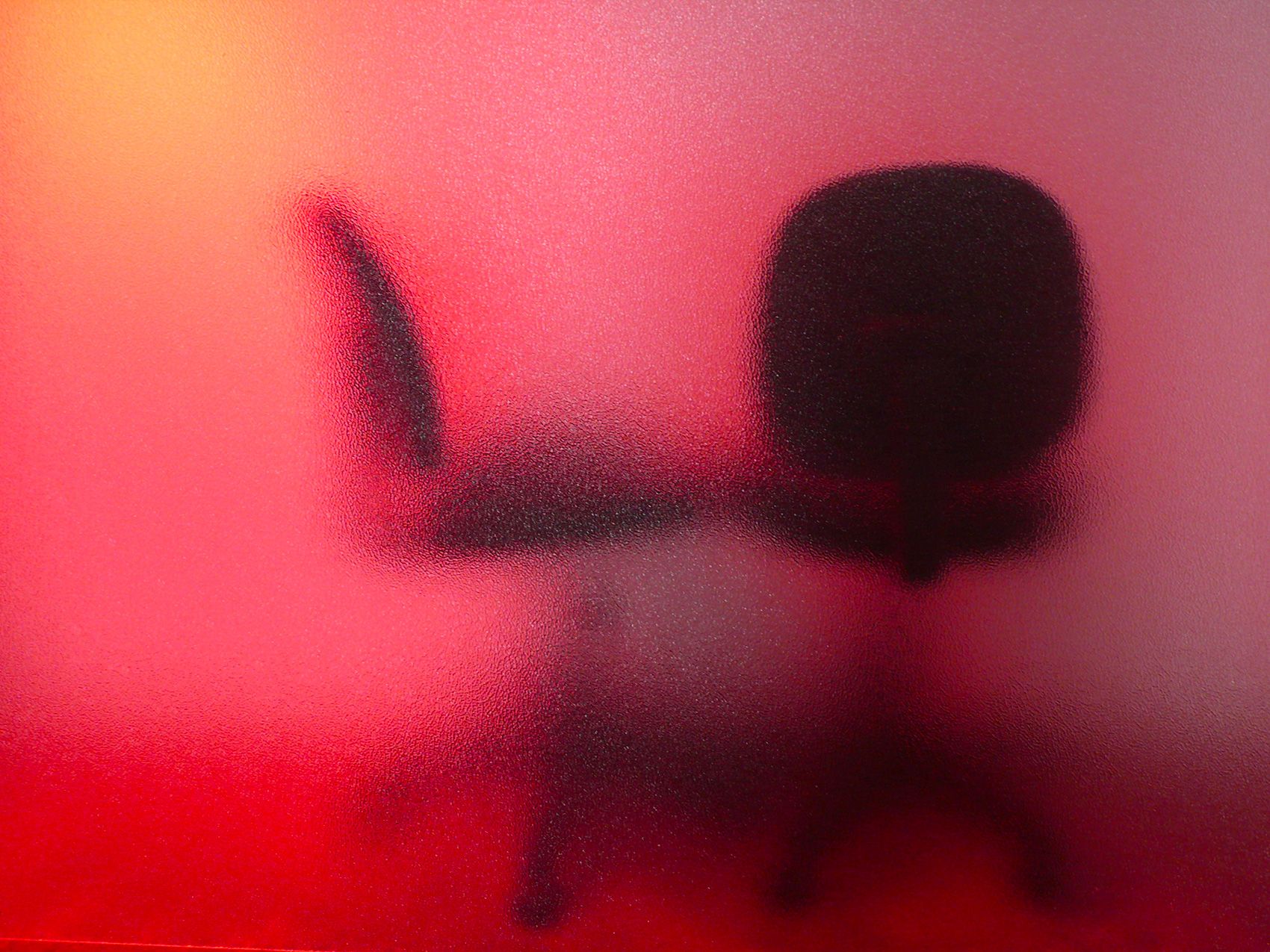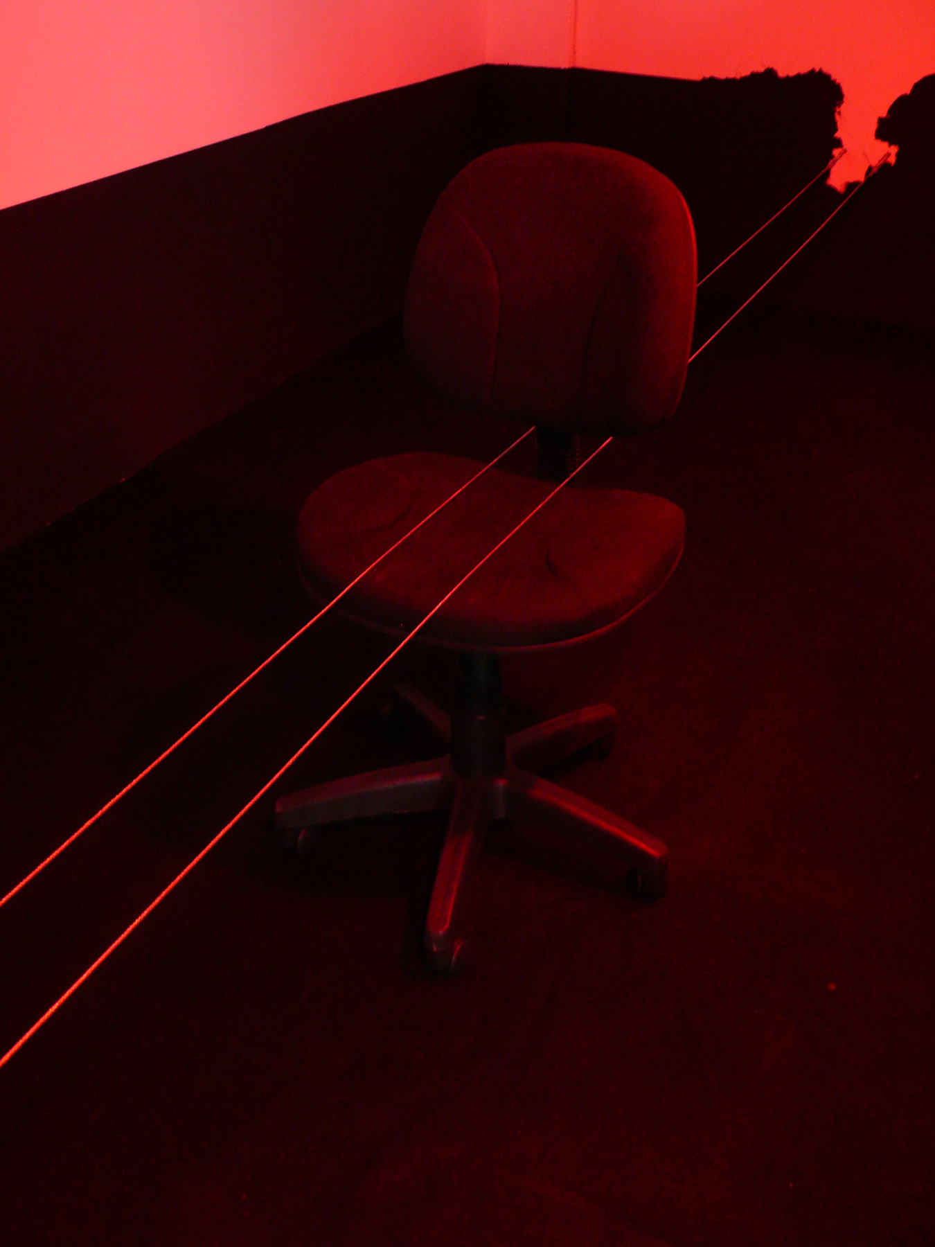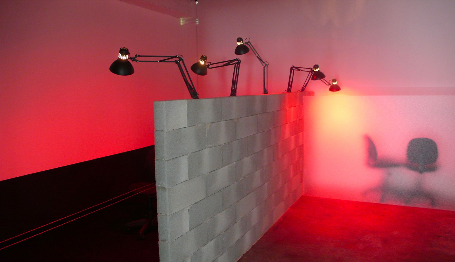 Peinture, parpaings, verre dépoli, chaises de bureau, moquette, lampes, câbles