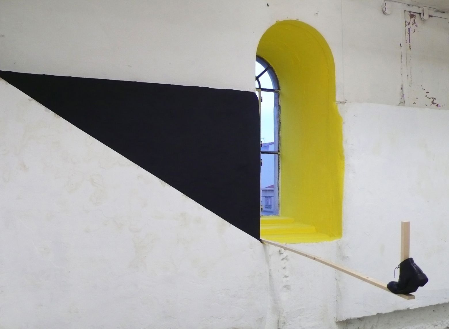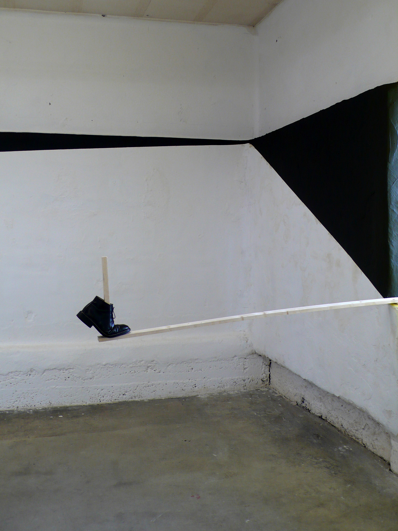 Projet in situ, peinture, bois, feuilles de papier, chaussure