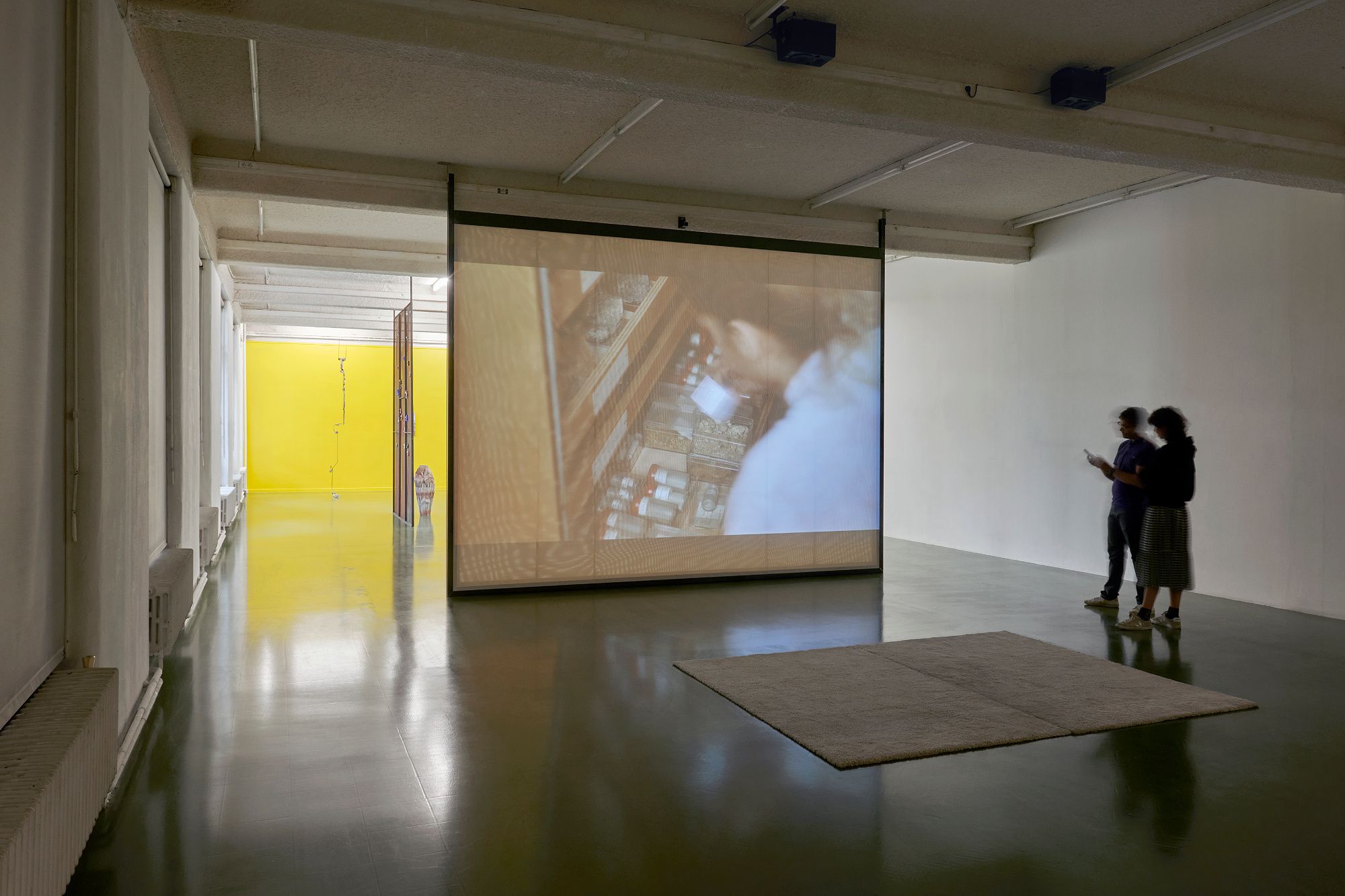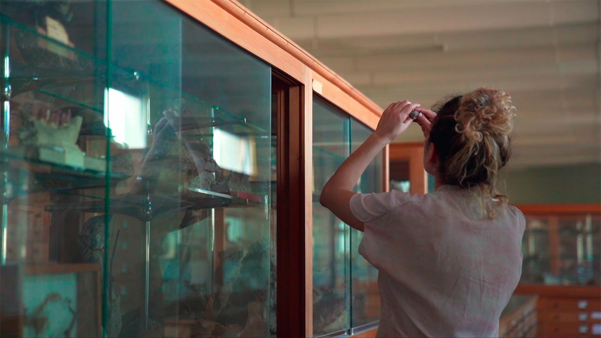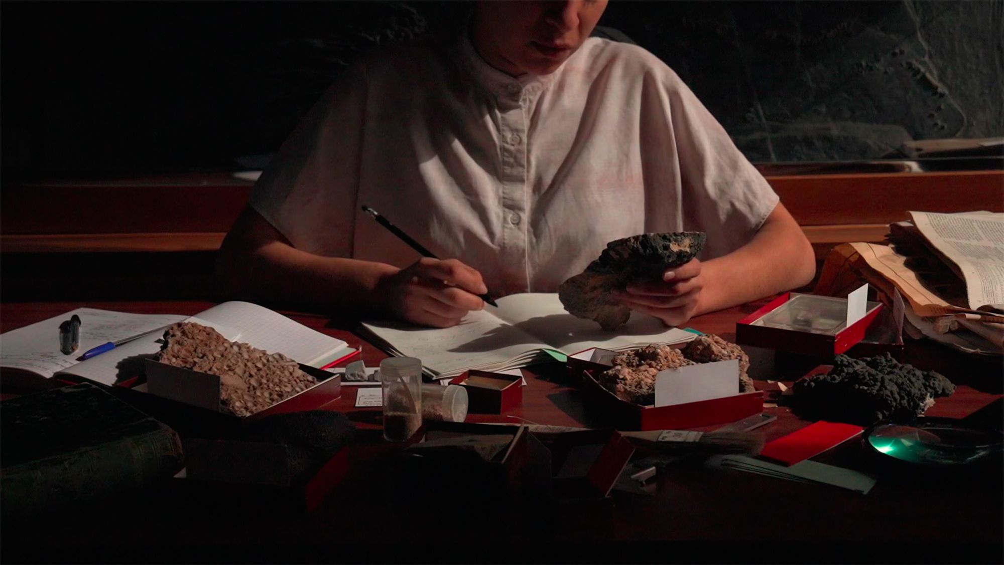 « The rug at the foot of the screen invites us to settle down in front of images filmed among the collections of the geology laboratory of Claude Bernard University, Lyon 1. We are accompanied by the voice of a young woman as she explores the mineral collections, moving between classification drawers, research aisles, and memories of a visit to Boolagoorda. We are privy to her inner narrative as she speculates about one’s presence in the world in relation to nature, and the impossibility of independence amongst living forms, whose secret symbiosis is largely indiscernible.