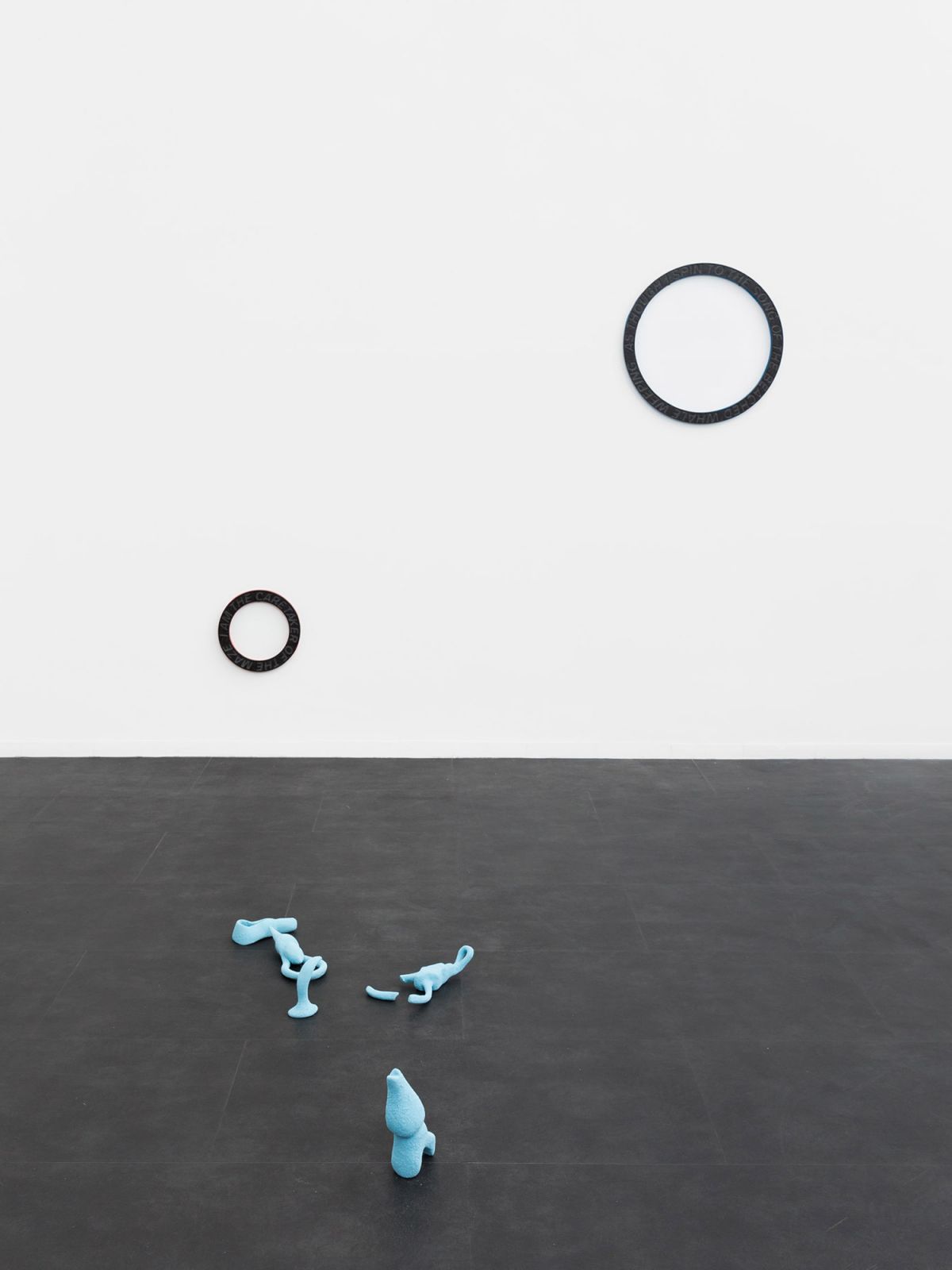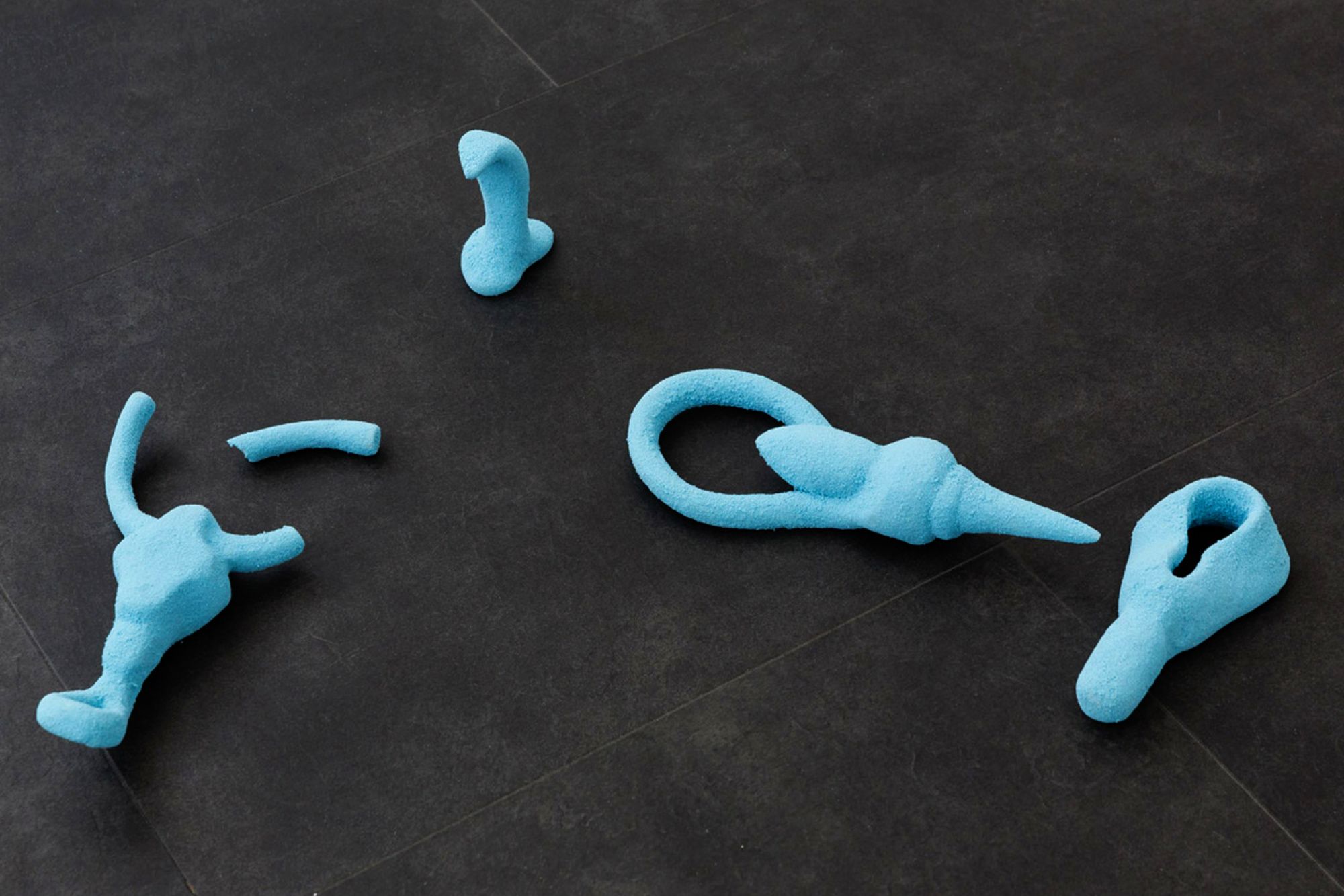 Material for a Sculpture consists of a series of pigment covered sandstone sculptures and four poems installed on the wall. Full of false likeness, these hybrid sculptures and texts take inspiration from the reproductive anatomy of human and nonhuman species (plant and insect species) and ethnographic artefacts to propose an intertwined reading of reproductive biology.
