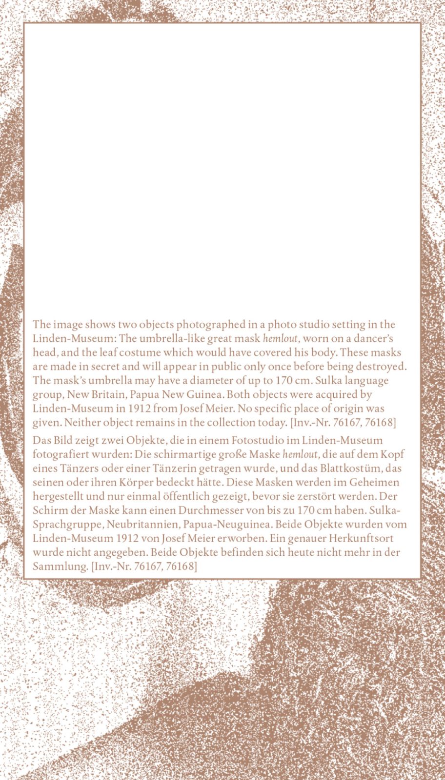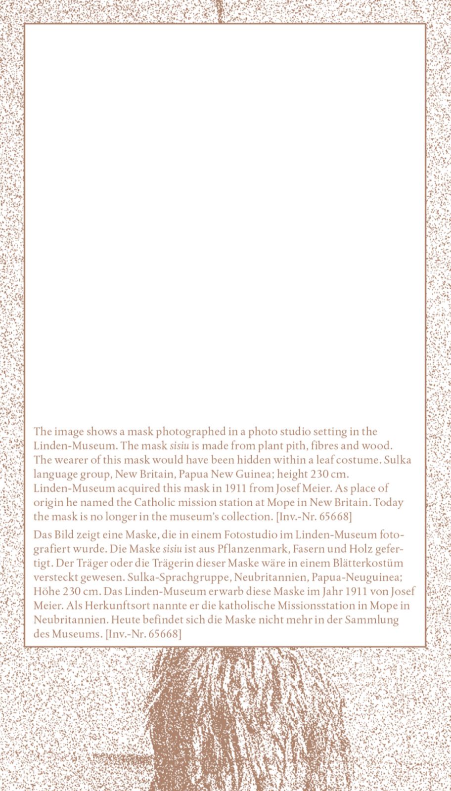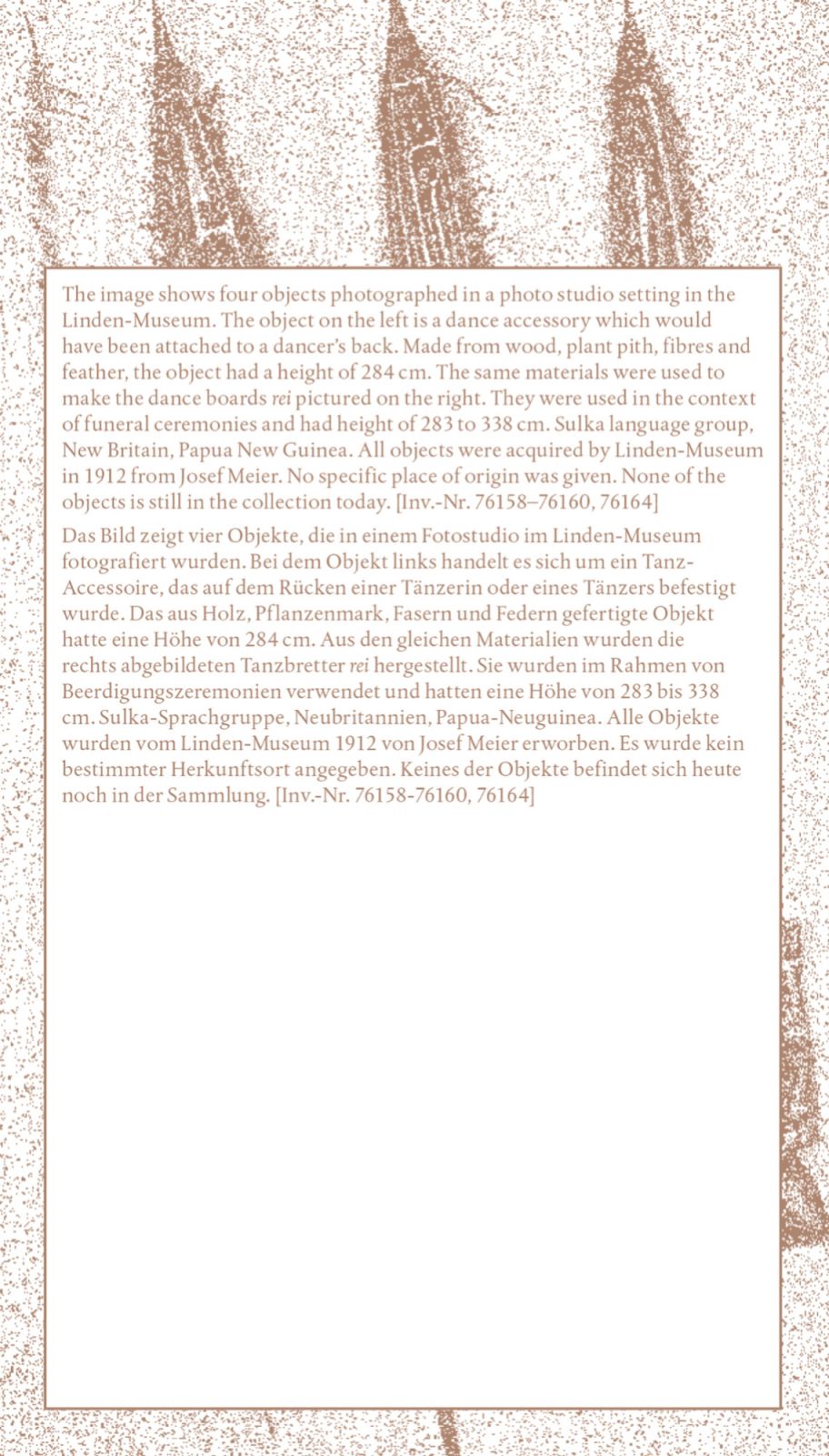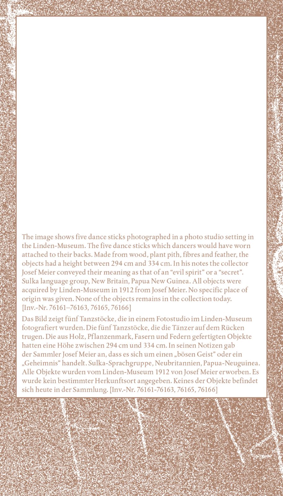 These four prints bear witness to the absent presence of cultural artifacts—an absence deeply felt within ethnographic collections, and here, specifically within the Oceania Collection of the Linden-Museum Stuttgart. Each print focuses on a single cultural object from Papua New Guinea, representing four distinct language groups. Acquired at the beginning of the 20th century, these objects have since “disappeared”: though their inventory numbers remain, no trace of their physical presence exists within the museum’s holdings. What, then, survives?